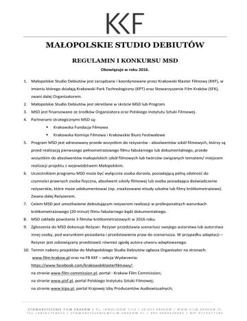 MAŁOPOLSKIE STUDIO DEBIUTÓW REGULAMIN I KONKURSU MSD Obowiązuje w roku 2016. 1. Małopolskie Studio Debiutów jest zarządzane i koordynowane przez Krakowski Klaster Filmowy (KKF), w imieniu którego działają Krakowski Park Technologiczny (KPT) oraz Stowarzyszenie Film Kraków (SFK), zwani dalej Organizatorem. 2. Małopolskie Studio Debiutów jest określane w skrócie MSD lub Program. 3. MSD jest finansowane ze środków Organizatora oraz Polskiego Instytutu Sztuki Filmowej. 4. Partnerami strategicznymi MSD są: Krakowska Fundacja Filmowa Krakowska Komisja Filmowa i Krakowskie Biuro Festiwalowe 5. Program MSD jest adresowany przede wszystkim do reżyserów - absolwentów szkół filmowych, którzy są przed realizacją pierwszego pełnometrażowego filmu fabularnego lub dokumentalnego, przede wszystkim do absolwentów małopolskich szkół filmowych lub twórców związanych tematem/ miejscem realizacji projektu z województwem Małopolskim. 6. Uczestnikiem programu MSD może być wyłącznie osoba dorosła, posiadającą pełną zdolność do czynności prawnych osoba fizyczna, absolwent szkoły filmowej lub osoba posiadająca doświadczenie reżyserskie, które może udokumentować (np. zrealizowane etiudy szkolne lub filmy krótkometrażowe). Zwana dalej Reżyserem. 7. Celem MSD jest umożliwienie debiutującym reżyserom realizacji w profesjonalnych warunkach krótkometrażowego (20 minut) filmu fabularnego bądź dokumentalnego. 8. MSD zakłada powstanie 3 filmów krótkometrażowych w 2016 roku. 9. Zgłoszenia do MSD dokonuje Reżyser. Reżyser przedstawia scenariusz swojego autorstwa lub autorstwa innej osoby, pod warunkiem posiadania i przedstawienia praw do scenariusza. W przypadku adaptacji – Reżyser jest zobowiązany przedstawić również zgodę autora utworu adaptowanego. 10. Termin naboru projektów do Małopolskiego Studia Debiutów ogłasza Organizator na stronach: www.film-krakow.pl oraz na FB KKF – sekcja Wydarzenia: https://www.facebook.com/krakowskiklasterfilmowy/; na stronie www.film-commission.pl, portal - Krakow Film Commission; na stronie www.pisf.pl, portal Polskiego Instytutu Sztuki Filmowej; na stronie www.kipa.pl, portal Krajowej Izby Producentów Audiowizualnych; STOWARZYSZENIE FILM KRAKÓW / PL. INWALIDÓW 7/14 / 30-033 KRAKÓW / WWW.FILM.KRAKOW.PL TEL.+48501756073 / [email protected] / KRS 0000439403 / NIP 6772377185 oraz na stronach Polish Docs i Polish Shorts, portal - Krakowska Fundacja Filmowa. 11. Reżyser może zgłosić tylko jeden projekt w I Konkursie MSD 2016. 12. Termin złożenia Wniosku: 20 sierpnia 2016 r. 13. Wniosek powinien zawierać: 13.1. Formularz zgłoszeniowy, będący załącznikiem nr 1 do niniejszego Regulaminu. 13.2. Streszczenie filmu (max. 1 strona) 13.3. Eksplikacja reżyserska (max. 1 strona) 13.4. Scenariusz (w przypadku projektów fabularnym odpowiednio sformatowany) 13.5. CV reżysera oraz opis dorobku wraz z linkami do portali internetowych, gdzie są zamieszczone etiudy studenckie/ poprzednie filmy Reżysera (preferowane Vimeo lub YouTube). 13.6. W przypadku adaptacji lub wykorzystania scenariusza autorstwa innej osoby Reżyser jest zobowiązany przedstawić dokumenty potwierdzające, że posiada pełnię autorskich praw majątkowych i praw zależnych, i może nimi swobodnie dysponować. 14. Wniosek można złożyć osobiście w biurze Krakowskiego Klastra Filmowego przy ul. Podole 60, pok. 0.12 w Krakowie, w dni robocze w godzinach 10.00 – 16.00, lub wysłać pocztą na adres: Krakowski Klaster Filmowy, ul. Podole 60, pok. 0.12, 30-394 Kraków. 14.1. Wersję elektroniczną Wniosku (wszystkie dokumenty w Word lub PDF) należy wysłać w obowiązującym terminie na adres: [email protected]. 15. Przy złożeniu Wniosku w wersji papierowej decyduje data doręczenia do Biura KKF, a nie data stempla pocztowego. 16. Zgłoszenie składa się w jednym egzemplarzu – wydrukowane dokumenty powinny być wpięte w skoroszyt. Wnioski składa się w szczelnie zamkniętej kopercie, z dopiskiem Małopolskie Studio Debiutów. 17. Organizator sprawdza złożony Wniosek pod względem formalnym i w przypadku uchybień wzywa do ich niezwłocznego usunięcia. 18. Po sprawdzeniu formalnym Organizator przekazuje Zgłoszenia do oceny Komisji eksperckiej. 19. Organizator powołuje Komisję ekspercką, w skład której wchodzą przedstawiciele Organizatora oraz przedstawiciele Partnerów MSD. 20. Komisja ekspercka dokonuje wyboru 3 projektów. W przypadku braku porozumienia wśród członków Komisji eksperckiej, ostateczna decyzja o wyborze projektów przysługuje Dyrektorowi Krakowskiego Klastra Filmowego. Decyzje Komisji są ostateczne i nie podlegają procedurze odwoławczej. 21. Termin wyboru projektów: do 31 sierpnia 2016 r. STOWARZYSZENIE FILM KRAKÓW / PL. INWALIDÓW 7/14 / 30-033 KRAKÓW / WWW.FILM.KRAKOW.PL TEL.+48501756073 / [email protected] / KRS 0000439403 / NIP 6772377185 22. Decyzje Komisji w sprawie wyboru lub odrzucenia projektu Reżysera są wysyłane do Reżysera pocztą elektroniczną. 23. Przewidywany budżet na produkcję filmu wynosi 110.000 PLN netto. Przy czym 60.000 PLN netto jest wkładem finansowym w produkcję, zaś 50.000 PLN netto jest wkładem rzeczowym w produkcję filmu. Dodatkowo organizatorzy przewidują możliwość zwiększenia budżetów filmów o wkłady finansowe i rzeczowe tytułem wkładów koprodukcyjnych podmiotów zewnętrznych. Decyzję w sprawie koprodukcji podejmuje Dyrektor Krakowskiego Klastra Filmowego. 24. Producentem wiodącym filmów jest Stowarzyszenie Film Kraków. Każdy film ma swojego producenta wykonawczego oraz opiekuna artystycznego i konsultanta scenariuszowego, których wybiera Dyrektor Krakowskiego Klastra Filmowego. 25. Przy każdej produkcji przewiduje się staż dla minimum 2 studentów lub absolwentów szkół filmowych i artystycznych. Wyboru stażystów dokonują wspólnie Reżyser i Dyrektor Krakowskiego Klastra Filmowego. 26. Uczestnicy programu Małopolskie St
