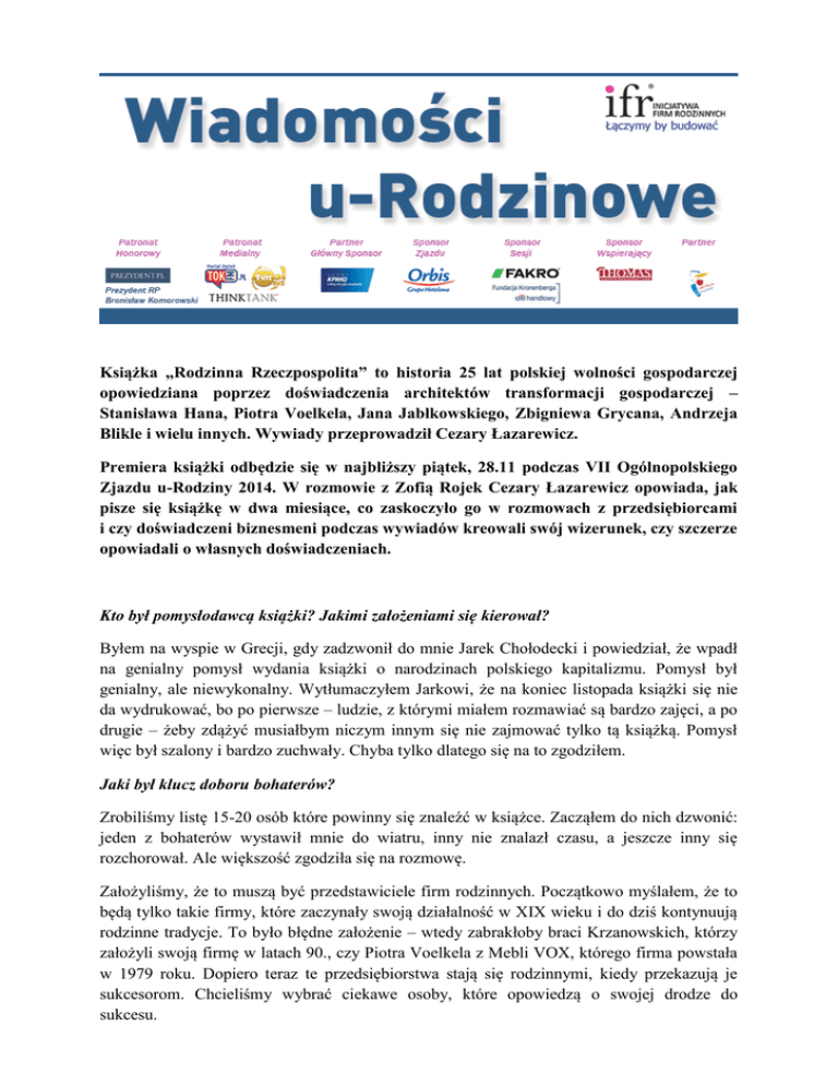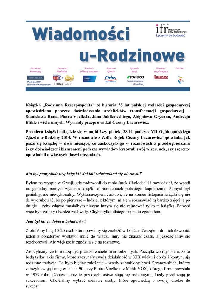 Książka „Rodzinna Rzeczpospolita” to historia 25 lat polskiej wolności gospodarczej opowiedziana poprzez doświadczenia architektów transformacji gospodarczej – Stanisława Hana, Piotra Voelkela, Jana Jabłkowskiego, Zbigniewa Grycana, Andrzeja Blikle i wielu innych. Wywiady przeprowadził Cezary Łazarewicz. Premiera książki odbędzie się w najbliższy piątek, 28.11 podczas VII Ogólnopolskiego Zjazdu u-Rodziny 2014. W rozmowie z Zofią Rojek Cezary Łazarewicz opowiada, jak pisze się książkę w dwa miesiące, co zaskoczyło go w rozmowach z przedsiębiorcami i czy doświadczeni biznesmeni podczas wywiadów kreowali swój wizerunek, czy szczerze opowiadali o własnych doświadczeniach. Kto był pomysłodawcą książki? Jakimi założeniami się kierował? Byłem na wyspie w Grecji, gdy zadzwonił do mnie Jarek Chołodecki i powiedział, że wpadł na genialny pomysł wydania książki o narodzinach polskiego kapitalizmu. Pomysł był genialny, ale niewykonalny. Wytłumaczyłem Jarkowi, że na koniec listopada książki się nie da wydrukować, bo po pierwsze – ludzie, z którymi miałem rozmawiać są bardzo zajęci, a po drugie – żeby zdążyć musiałbym niczym innym się nie zajmować tylko tą książką. Pomysł więc był szalony i bardzo zuchwały. Chyba tylko dlatego się na to zgodziłem. Jaki był klucz doboru bohaterów? Zrobiliśmy listę 15-20 osób które powinny się znaleźć w książce. Zacząłem do nich dzwonić: jeden z bohaterów wystawił mnie do wiatru, inny nie znalazł czasu, a jeszcze inny się rozchorował. Ale większość zgodziła się na rozmowę. Założyliśmy, że to muszą być przedstawiciele firm rodzinnych. Początkowo myślałem, że to będą tylko takie firmy, które zaczynały swoją działalność w XIX wieku i do dziś kontynuują rodzinne tradycje. To było błędne założenie – wtedy zabrakłoby braci Krzanowskich, którzy założyli swoją firmę w latach 90., czy Piotra Voelkela z Mebli VOX, którego firma powstała w 1979 roku. Dopiero teraz te przedsiębiorstwa stają się rodzinnymi, kiedy przekazują je sukcesorom. Chcieliśmy wybrać ciekawe osoby, które opowiedzą o swojej drodze do sukcesu. Jak się pisze książkę przez 2 miesiące? Nie jest łatwo. Do każdego wywiadu trzeba się przygotować, poznać życiorys rozmówcy, dowiedzieć się o nim jak najwięcej. Musiałem zastanowić się, jakie pytania chciałbym im zadać, a potem – konfrontować swoje wyobrażenia z rzeczywistością. To, że dziennikarz zapisze 20 pytań w notesie, to wcale nie znaczy, że je wszystkie zada, bo rozmowa może pójść zupełnie innym torem. A mi zależało na tym, żeby od każdego rozmówcy uzyskać spójną opowieść. Wśród bohaterów jest min. Wojciech Kruk, który traci majątek i szuka zemsty w biznesie. Są bracia Krzanowscy, których historia jest jak opowieść z bajki – przyjeżdża inwestor, który pomaga im uruchomić biznes w Polsce. Rozmawiałem z Janem Jabłkowskim, który przez 24 lata walczył o odzyskanie nieruchomości swoich przodków i stworzenie domu towarowego. Opisaliśmy też historię pana Kasztelewicza – jego największą miłością są pszczoły i z tej swojej wielkiej pasji stworzył intratny biznes. Co pana zaskoczyło podczas pracy nad książką? Czy były takie rozmowy, które bardzo mocno pan zapamiętał lub takie, które zupełnie rozmijały się z pana oczekiwaniami? Zaskoczyło mnie – i to we wszystkich rozmowach – że to takie łatwe. Że wystarczy mieć jeden dobry pomysł w życiu i go konsekwentnie realizować. Większość z moich rozmówców miała właśnie taki dobry pomysł, przekonanie o jego słuszności i z konsekwencją dążyli do jego wykonania. Pewnie dzięki temu ich przedsiębiorstwa odniosły sukces. Ten motyw przebijał we wszystkich rozmowach – nie ma żadnej magicznej różdżki, która sprawia, że wygrywa się milion w totolotka i dzięki temu interes się rozkręca. Duże zdziwienie wywołała u mnie opowieść pana Blikle. A mnie zawsze się wydawało, że firma A. Blikle zawsze była i jest rynkową potęgą, i że jak ktoś coś takiego dostaje to jak prezent od samego Pana Boga. A on mi opowiadał, że jak przejął firmę w latach 90. to zastanawiał się, czy jej nie zamknąć. Opowiadał ile wysiłku kosztowało go by ją uratować, że firma jest polem ciągłych inwestycji – i nie po to, żeby zarabiać, ale żeby w ogóle przetrwać. To nigdy nie była droga usłana różami. Jakie były największe przeciwności w rozwoju biznesu, o których mówili pana rozmówcy? Piotr Voelkel na przykład mówił o tym, że byli zbyt innowacyjni. Jak wymyślili lustro, w którym nie widać było zmarszczek, to nikt nie chciał go kupić. Dopiero po zakończeniu produkcji zgłosili się nieliczni chętni. Oczywiście główną przeciwnością był brak pieniędzy, wieczne pytanie, skąd wziąć środki na rozwój. I brak ludzi. Z tego co zauważyłem w firmach rodzinnych najważniejsze jest to, żeby móc komuś zaufać w 100 proc. Dla mnie wyjątkowa jest historia braci Krzanowskich, którzy mówią, że ich przewagą nad innymi spółkami jest bezgraniczne zaufanie do siebie nawzajem. Nawet jak się kłócą, to kierunek rozwoju ich formy jest zawsze jasno wytyczony. Nie ma niczego, co mogłoby spowodować, żeby się rozstali. A mówi się, że z rodziną dobrze się wychodzi tylko na zdjęciach. Ci, z którymi ja rozmawiałem, z rodziną wyszli dobrze nie tylko na zdjęciach. Bez wzajemnego wsparcia prowadzenie firmy nie byłoby możliwe. Bez rodziny większość tych firm by nie ruszyła, cały mechanizm ich funkcjonowania jest oparty na rodzinie. Jakie miał pan obawy? Byłem bardzo ciekaw tych ludzi. W dziennikarstwie jest tak, że nie można podejmować się czegoś, do czego nie jest się przekonanym. W tym wypadku stwierdziłem, że to zrobię, bo mnie to interesuje. Wiedziałem, że mogę pójść do ciekawych ludzi i spytać się j