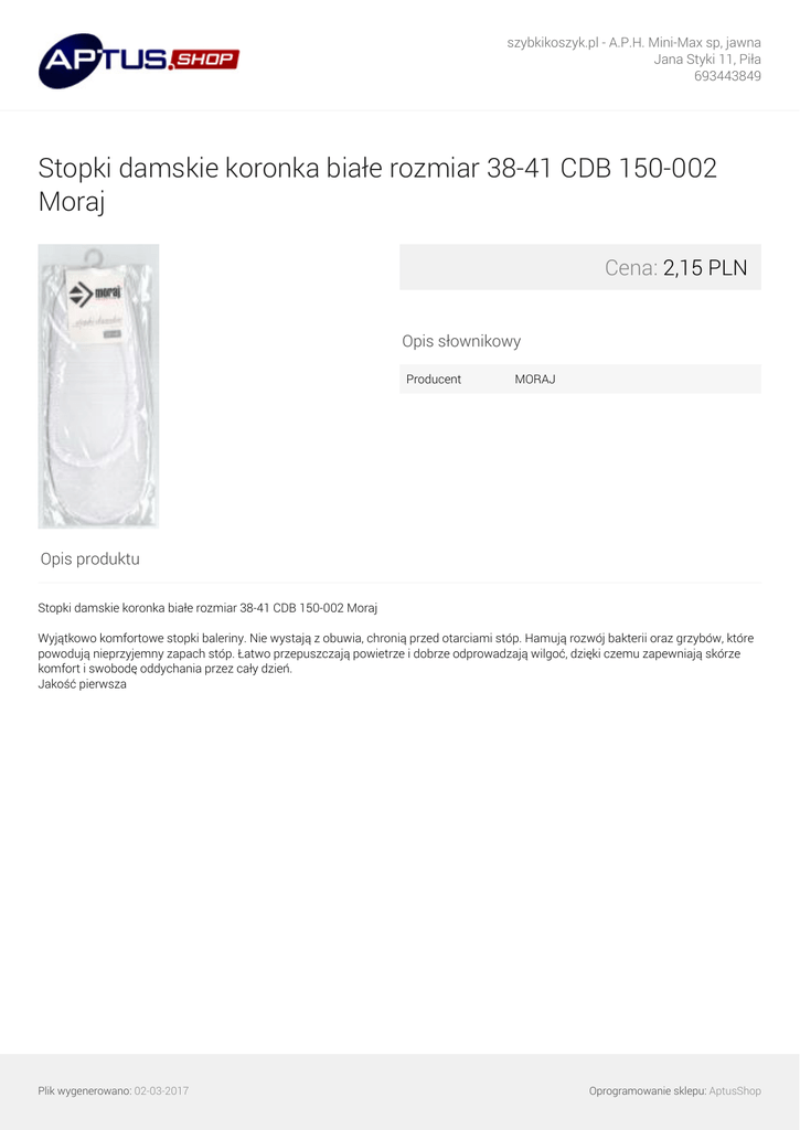 szybkikoszyk.pl - A.P.H. Mini-Max sp, jawna Jana Styki 11, Piła 693443849 Stopki damskie koronka białe rozmiar 38-41 CDB 150-002 Moraj Cena: 2,15 PLN Opis słownikowy Producent MORAJ Opis produktu Stopki damskie koronka białe rozmiar 38-41 CDB 150-002 Moraj Wyjątkowo komfortowe stopki baleriny. Nie wystają z obuwia, chronią przed otarciami stóp. Hamują rozwój bakterii oraz grzybów, które powodują nieprzyjemny zapach stóp. Łatwo przepuszczają powietrze i dobrze odprowadzają wilgoć, dzięki czemu zapewniają skórze komfort i swobodę oddychania przez cały dzień. Jakość pierwsza Plik wygenerowano: 02-03-2017 Powered by TCPDF (www.tcpdf.org) Oprogramowanie sklepu: AptusShop