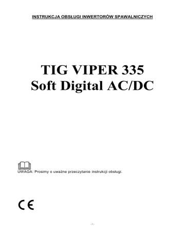 INSTRUKCJA OBSŁUGI INWERTORÓW SPAWALNICZYCH TIG VIPER 335 Soft Digital AC/DC UWAGA: Prosimy o uważne przeczytanie instrukcji obsługi. -1- Zawartość 1. UWAGI OGÓLNE .................................................................................................................. 3 2. OGÓLNA CHARAKTERYSTYKA ....................................................................................... 3 3. DANE TECHNICZNE ............................................................................................................ 4 4. OPIS PANELU STEROWANIA I FUNKCJI TIG VIPER 335 Soft Digital AC/DC ............. 4 5. WYKRES PRZEBIEGU PROCESU SPAWANIA DLA METODY TIG – CZTEROTAKT 6 5.1 WYKRES PRZEBIEGU PROCESU SPAWANIA DLA METODY TIG – DWUTAKT ... 7 6. PRZYGOTOWANIE DO PRACY .......................................................................................... 7 6.1 PODŁĄCZENIE DO SIECI .................................................................................................. 8 6.2 ŁĄCZENIE PRZEWODÓW SPAWALNICZYCH W METODZIE MMA ......................... 8 7. SPAWANIE METODĄ MMA ............................................................................................... 8 8. SPAWANIE METODĄ TIG HF AC/DC PULS ..................................................................... 8 9. WPROWADZANIE USTAWIEŃ DO PAMIĘCI I ICH PRZYWOŁYWANIE. ................... 9 10. GAZY OCHRONNE I I ELEKTRODY WOLFRAMOWE STOSOWANE W METODZIE TIG ............................................................................................................................................. 10 11. PRZYGOTOWANIE KRAWĘDZI PRZED SPAWANIEM .............................................. 11 12. KONSERWACJA ................................................................................................................ 12 13. ZAKŁÓCENIA W PRACY SPAWARKI ........................................................................... 13 14. BEZPIECZEŃSTWO UŻYTKOWANIA ........................................................................... 14 -2- 1. UWAGI OGÓLNE Uruchomienia, instalacji i eksploatacji inwertorów spawalniczych, można dokonać tylko po dokładnym zapoznaniu się z niniejszą instrukcją obsługi. Nieprzestrzeganie zaleceń zawartych w tej instrukcji może narazić użytkownika na poważne obrażenia ciała, śmierć lub uszkodzenia samego urządzenia. Nie można dopuszczać dzieci w pobliże miejsca pracy urządzenia. Osoby z wszczepionym rozrusznikiem serca zanim podejmą pracę z tym urządzeniem, powinny skonsultować się ze swoim lekarzem. Obsługa serwisowa i naprawy tych urządzeń mogą być prowadzone przez wykwalifikowany personel, z zachowaniem warunków bezpieczeństwa pracy obowiązujących dla urządzeń elektrycznych. Przeróbki we własnym zakresie mogą spowodować zmianę cech użytkowych urządzeń lub pogorszenie parametrów spawalniczych. Wszelkie przeróbki urządzeń, we własnym zakresie, powodują nie tylko utratę gwarancji, ale mogą być przyczyną pogorszenia się warunków bezpieczeństwa użytkowania i narażenia użytkownika na niebezpieczeństwo porażenia prądem. Niewłaściwe warunki pracy mogą spowodować uszkodzenia urządzenia, a jego niewłaściwa obsługa, powoduje utratę gwarancji. UWAGA: Urządzenie oparte na podzespołach elektronicznych. Szlifowanie i cięcie metali w pobliżu spawarki może powodować zanieczyszczenie opiłkami wnętrza urządzenia, doprowadzając tym samym do jego uszkodzenia. Wyżej wymienione uszkodzenie nie podlega naprawie gwarancyjnej! W przypadku konieczności pracy w takim środowisku, należy dokonywać czyszczenia urządzenia przez przedmuchanie wnętrza spawarki sprężonym powietrzem. INFORMACJE DOTYCZĄCE USUWANIA ZUŻYTEGO SPRZĘTU ELEKTRYCZNEGO I ELEKTRONICZNEGO Powyższy znak umieszczony na urządzeniu informuje, że jest to sprzęt elektryczny lub elektroniczny, którego po zużyciu nie wolno umieszczać z innymi odpadami. Zużyty sprzęt elektryczny i elektroniczny zawiera substancje szkodliwe dla środowiska naturalnego. Nie wolno takiego sprzętu składować na wysypiskach śmieci, musi zostać on poddany recyklingowi. Informacje na temat systemu zbiórki zużytego sprzętu elektrycznego i elektronicznego można uzyskać w punkcie sprzedaży urządzeń, oraz u producenta lub importera. Zakaz umieszczania wraz z innymi odpadami zużytego sprzętu elektrycznego i elektronicznego narzuca na użytkownika dyrektywa europejska 2007/96/WE. 2. OGÓLNA CHARAKTERYSTYKA Urządzenie inwerterowe TIG VIPER 335 Soft Digital AC/DC oparte jest na najnowszej, najbardziej zaawansowanej technologii wykorzystującej tranzystory. Urządzenie wyposażone jest w „miękki” przejrzysty panel umożliwiający ustawienie wszystkich niezbędnych funkcji spawalniczych (prąd startu/wypełnienia krateru/spawania/bazy, czasy narastania i opadania prądu, wypływ gazu przed i po spawaniu, częstotliwość pulsu, balans itp.). TIG VIPER 335 Soft Digital AC/DC zapewnia doskonała wydajność podczas spawaniu aluminium i jego stopów, stali węglowej, stali nierdzewnej, tytanu itp. -3- 3. DANE TECHNICZNE TIG VIPER 335 Soft Digital AC/DC Zasilanie Napięcie biegu jałowego Sprawność Współczynnik mocy „Power factor” Wymiary [mm] Waga [kg] Klasa ochrony obudowy Max. prąd spawania/napięcie Zakres regulacji prądu spawania Max. zapotrzebowanie energii 400 [V], 50 [Hz] 45 [V] 60% 0.93 550x390x430 32,8 IP21S TIG 315 [A]/22,6 [V] 10÷315 [A] 9 [kVA] MMA 280 [A]/31,2 [V] 10÷280 [A] 11 [kVA] 4. OPIS PANELU STEROWANIA I FUNKCJI TIG VIPER 335 Soft Digital AC/DC 1. Wyświetlacz. Służy do ustawienia wartości danego parametru, a w trakcie spawania pokazuje aktualny prąd spawania. 2. Przycisk wyboru. Naciśnięcie powoduje przeskok kolejno pomiędzy parametrami które można ustawić: -4- 1. Częstotliwość dla AC 10÷100 [Hz] 2. Balans dla AC. Procentowy stosunek czasu trwania dodatniej do ujemnej połówki napięcia. 10% ÷ 90%