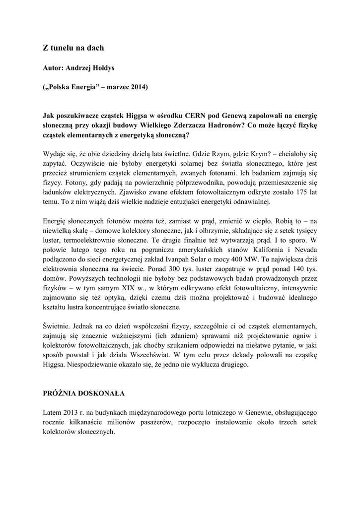 Z tunelu na dach Autor: Andrzej Hołdys („Polska Energia” – marzec 2014) Jak poszukiwacze cząstek Higgsa w ośrodku CERN pod Genewą zapolowali na energię słoneczną przy okazji budowy Wielkiego Zderzacza Hadronów? Co może łączyć fizykę cząstek elementarnych z energetyką słoneczną? Wydaje się, że obie dziedziny dzielą lata świetlne. Gdzie Rzym, gdzie Krym? – chciałoby się zapytać. Oczywiście nie byłoby energetyki solarnej bez światła słonecznego, które jest przecież strumieniem cząstek elementarnych, zwanych fotonami. Ich badaniem zajmują się fizycy. Fotony, gdy padają na powierzchnię półprzewodnika, powodują przemieszczenie się ładunków elektrycznych. Zjawisko zwane efektem fotowoltaicznym odkryte zostało 175 lat temu. To z nim wiążą dziś wielkie nadzieje entuzjaści energetyki odnawialnej. Energię słonecznych fotonów można też, zamiast w prąd, zmienić w ciepło. Robią to – na niewielką skalę – domowe kolektory słoneczne, jak i olbrzymie, składające się z setek tysięcy luster, termoelektrownie słoneczne. Te drugie finalnie też wytwarzają prąd. I to sporo. W połowie lutego tego roku na pograniczu amerykańskich stanów Kalifornia i Nevada podłączono do sieci energetycznej zakład Ivanpah Solar o mocy 400 MW. To największa dziś elektrownia słoneczna na świecie. Ponad 300 tys. luster zaopatruje w prąd ponad 140 tys. domów. Powyższych technologii nie byłoby bez podstawowych badań prowadzonych przez fizyków – w tym samym XIX w., w którym odkrywano efekt fotowoltaiczny, intensywnie zajmowano się też optyką, dzięki czemu dziś można projektować i budować idealnego kształtu lustra koncentrujące światło słoneczne. Świetnie. Jednak na co dzień współcześni fizycy, szczególnie ci od cząstek elementarnych, zajmują się znacznie ważniejszymi (ich zdaniem) sprawami niż projektowanie ogniw i kolektorów fotowoltaicznych, jak choćby szukaniem odpowiedzi na niełatwe pytanie, w jaki sposób powstał i jak działa Wszechświat. W tym celu przez dekady polowali na cząstkę Higgsa. Niespodziewanie okazało się, że jedno nie wyklucza drugiego. PRÓŻNIA DOSKONAŁA Latem 2013 r. na budynkach międzynarodowego portu lotniczego w Genewie, obsługującego rocznie kilkanaście milionów pasażerów, rozpoczęto instalowanie około trzech setek kolektorów słonecznych. Założono, że zimą będą one ogrzewały terminal, a latem go schładzały. Od paru miesięcy urządzenia już działają. Zajmują około 1200 m kw. dachu. Dzięki nim genewskie lotnisko całkowicie uniezależniło się od zewnętrznych dostawców ciepła. Zbędne stały się też klimatyzatory pożerające mnóstwo energii. Kolektory słoneczne to dziś żadna nowinka. Produkuje się je od ponad pół wieku. Te, które ułożono na terminalu lotniska w Genewie, są wyjątkowe. Zastosowana w nich technologia pozwala uzyskać temperatury o kilkadziesiąt stopni Celsjusza wyższe niż w tradycyjnych kolektorach. Podczas gdy te drugie służą zwykle do ogrzewania pomieszczeń i wody użytkowej w pojedynczych domach, te pierwsze, dzięki fantastycznej wydajności, mogą zaopatrywać w ciepło biurowce, wielkie magazyny i zakłady przemysłowe. Ba, skuteczność pozyskiwania ciepła jest tak wysoka, że można nim wprawiać w ruch nawet turbiny prądotwórcze. Twórcami kolektorów są naukowcy ze słynnego ośrodka badań jądrowych CERN pod Genewą, tego samego, w którym działa Wielki Zderzacz Hadronów (LHC, od ang. Large Hadron Collider) – największy na świecie akcelerator cząstek osiągających gigantyczną energię i prędkość. Dzięki prowadzonym w nim eksperymentom odnaleziono w końcu bozon Higgsa, brakujący element znanej nam materii wypełniającej Wszechświat. Stało się to w 2012 r., a potwierdzone zostało ostatecznie w zeszłym roku. Wielki Zderzacz Hadronów umieszczony jest w kołowym tunelu o długości 27 km. Wydrążono go na głębokości 50-170 m na potrzeby wcześniejszego akceleratora – Wielkiego Zderzacza Elektronowo-Pozytonowego (LEP). Aby rozpędzone cząstki mogły pędzić w akceleratorze, okrążając tunel 11 tys. razy na sekundę, wcześniej trzeba było opróżnić go z powietrza. Inaczej eksperyment szybko stanąłby w miejscu. W CERN rozpoczęto więc zaawanasowane badania nad urządzeniami i metodami do uzyskiwania jak najczystszej próżni. Eksperymentami kierował fizyk i znawca próżni, Cristoforo Benvenuti. Trwały one około 20 lat. Początkowo wewnętrzne ściany akceleratora wyklejano taśmami z cienką warstwą substancji chemicznej wyłapującej cząsteczki gazów. Swoim działaniem przypominała ona lep na muchy. Cząsteczka powietrza, która usiadła na taśmie, była natychmiast przez nią pochłaniana. Później, na potrzeby Wielkiego Zderzacza Hadronów, uruchomionego ostatecznie pięć lat temu, Benvenuti i jego współpracownicy wymyślili jeszcze bardziej finezyjny „połykacz” gazów – metaliczny proszek o strukturze gąbki nanoszony bezpośrednio na wewnętrzne ściany urządzenia. Okazał się znacznie skuteczniejszym lepem na zbędne cząstki powietrza. WIĘCEJ CIEPŁA Benvenuti, patrząc z radością, jak jego patent świetnie się sprawuje w akceleratorze, doznał olśnienia. „A gdyby tak identycznym pochłaniaczem pokryć wnętrze płaskiego kolektora słonecznego?” – pomyślał. Teoretyczne obliczenia jednoznacznie sugerowały, że sprawność takiego urządzenia powinna wyraźnie wzrosnąć po usunięciu z niego wszystkich cząstek powietrza. Wszak im lepsza próżnia, tym mniejsze straty ciepła w kolektorze. W CERN pomysł chwycił i parę lat temu, równocześnie z uruchomieniem poszukiwań cząstki Higgsa, rozpoczęto też testowanie kolektorów, we wnętrzu których panowała próżnia równie doskonała, jak w Wielkim Zderzaczu Hadronów. Wyniki testów okazały się więcej niż obiecujące. Straty ciepła w idealnie odizolowanych od otoczen