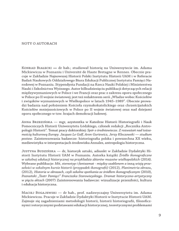 NOTY O AUTORACH Konrad Białecki — dr hab.; studiował historię na Uniwersytecie im. Adama Mickiewicza w Poznaniu i Université de Haute Bretagne w Rennes. Obecnie pracuje w Zakładzie Najnowszej Historii Polski Instytutu Historii UAM i w Referacie Badań Naukowych Oddziałowego Biura Edukacji Publicznej Instytutu Pamięci Narodowej w Poznaniu. Stypendysta Fundacji na Rzecz Nauki Polskiej i Ministerstwa Nauki i Szkolnictwa Wyższego. Autor kilkudziesięciu publikacji dotyczących relacji międzywyznaniowych w Polsce i we Francji oraz prac z zakresu oporu społecznego w Polsce po II wojnie światowej; jest też redaktorem serii „Władze wobec Kościołów i związków wyznaniowych w Wielkopolsce w latach 1945–1989”. Obecnie prowadzi badania nad położeniem Kościoła rzymskokatolickiego oraz chrześcijańskich Kościołów mniejszościowych w Polsce po II wojnie światowej oraz nad dziejami oporu społecznego w tzw. krajach demokracji ludowej. Anna Brzezińska — mgr, asystentka w Katedrze Historii Historiografii i Nauk Pomocniczych Historii Uniwersytetu Łódzkiego, członek redakcji „Rocznika Antropologii Historii”. Temat pracy doktorskiej: Spór o średniowiecze. Z rozważań nad tożsamością kulturową Europy. Jacques Le Goff, Aron Guriewicz, Jerzy Kłoczowski — studium postaw. Zainteresowania badawcze: historiografia polska i powszechna XX wieku, mediewistyka w interpretacjach środowiska Annales, antropologia historyczna. Justyna Budzińska — dr, historyk sztuki, adiunkt w Zakładzie Dydaktyki Historii Instytutu Historii UAM w Poznaniu. Autorka książki Źródło ikonograficzne w szkolnej edukacji historycznej na przykładzie zbiorów muzeów wielkopolskich (2014). Wybrane publikacje: Mit, stereotyp i fantazmat - między szablonem a inną wizją przeszłości w szkolnym kursie historii (przypadek ikonografii) (2012), Planimetria obrazu, (2012), Historia w obrazach, czyli szkolne spotkania ze źródłem ikonograficznym (2010), Poznański „Teatr Pamięci” Franciszka Starowieyskiego. Dramat historyczno-artystyczny w pięciu aktach (2007) Zainteresowania badawcze: wizualizacje przeszłości, kultura i edukacja historyczna. Maciej Bugajewski — dr hab., prof. nadzwyczajny Uniwersytetu im. Adama Mickiewicza. Pracuje w Zakładzie Dydaktyki Historii w Instytucie Historii UAM. Zajmuje się zagadnieniami metodologii historii, historii historiografii, filozoficznymi i retorycznymi podstawami edukacji historycznej, teoretycznymi problemami 9 Noty o autorach pamięci historycznej. Wybrane publikacje: Brzemię przeszłości. Zło jako przedmiot interpretacji historycznej (2009); Historiografia i czas. Paula Ricoeura teoria poznania historycznego (2002); (red.) Czy przeszłość powinna być inna? Studia z teorii i historii historiografii (2008); (wraz z M.Solarską) Współczesna francuska historiografia kobiet (2008); (red. naukowa wraz z I. Skórzyńską) „Sensus Historiae” 4/2011 oraz 1/2012 (numery tematyczne poświęcone pamięci historycznej); (wraz z V. Julkowską) red. naukowa „Rocznika Antropologii Historii”, nr 1, 2013 (O Reprezentacji). Claudia-Florentina Dobre — dr, wydawca i redaktorka czasopisma “Memoria”, badaczka stowarzyszona Centre Régional Francophone de Recherches Avancées en Sciences Sociales (CEREFREA). Absolwentka historii Uniwersytetu w Bukareszcie (Rumunia) (1999). W 2007 r. obroniła pracę doktorską pt.: Women’s, former political detainees, testimonies on communism and political persecutions w Laval University, Québec (Kanada). Stypendystka “Robert Schuman scholarship of the European Parliament” (2007) oraz “Junior Research Fellowship” of St. Kliment Ohridski University of Sofia (2009), otrzymała także postdoktoranckie stypendium Uniwersytetu Bukareszteńskiego (2010–2013). Zrealizowała projekty badawcze w ramach programów: Institute for the studies of the recent past, Sofia, Bułgaria (2010) oraz Junior Visiting Scholar at Central European University, School of Historical and Interdisciplinary Studies (2002). Zajmuje się problematyką pamięci komunizmu i prześladowań politycznych; pamięcią i historią, pamięcią deportacji, muzeum i pomnikami, życiem codziennym, udziałem kobiet w polityce. Ostatnio opublikowała Un pays derrière. Les Barbelés. Brève historire de la répression communiste en Roumanie (Fundaţia Culturală Memoria, Bucharest 2014). Tomasz Falkowski — dr, adiunkt w Zakładzie Metodologii Historii i Historii Historiografii Instytucie Historii Uniwersytetu im. Adama Mickiewicza w Poznaniu. Studiował w Toruniu (UMK), a także Poznaniu (UAM) i Paryżu (Paris I, EHESS). Opublikowała m.in.: Myśl i zdarzenie (2013). Zainteresowania badawcze: historia historiografii, historia nauki, współczesna humanistyka francuska. Piotr Filipkowski — dr; adiunkt w Instytucie Filozofii i Socjologii Polskiej Akademii Nauk IFiS PAN, członek Pracowni Badań Pamięci Społecznej w Instytucie Socjologii Uniwersytetu Warszawskiego. Doktoryzował się w Szkole Nauk Społecznych przy IFiS PAN pracą na temat indywidualnych pamięci doświadczenia kacetu, opublikowaną jako Historia mówiona i wojna. Doświadczenie obozu koncentracyjnego w perspektywie narracji biograficznych (Seria „Monografie” Fundacji na rzecz Nauki Polskiej), za którą otrzymał nagrodę im. Stanisława Ossowskiego w 2011 r. W latach 2002–2011 pracował w Ośrodku KARTA, gdzie koordynował program Historia Mówiona oraz uczestniczył w wielu krajowych i międzynarodowych projektach dokumentacyjno-badawczych oral history. Jest współtwórcą i stałym współpracownikiem Archiwum Historii Mówionej — największego polskiego zbioru relacji biograficznych, prowadzonego przez KARTĘ i Dom Spotkań z Historią. Zajmuje się epistemologicznymi i etycznymi problemami nagrywania, archiwizowania i ana- 10 Noty o autorach lizowania wywiadów biograficzno-narracyjnych oraz biograficznym doświadczeniem transformacji po 1989 r. Bogumił