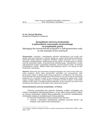 NR 84 Zeszyty Naukowe AKADEMII PODLASKIEJ w SIEDLCACH Seria: Administracja i Zarz dzanie 2010 dr in . Henryk Wyr!bek Akademia Podlaska w Siedlcach Zarz"dzanie ochron" #rodowiska w jednostkach samorz"du terytorialnego na przyk$adzie gminy Managing the environmental protection in self-government units on the example of the commune Streszczenie: Usuwanie i zapobieganie szkodom ekologicznym oraz koszty tych dzia a! sta y si" problemami, z którymi stykaj# si" organy administracji pa!stwowej. Samorz#d lokalny g ównie podejmuje dzia ania maj#ce przyczyni$ si" do gospodarczego, %rodowiskowego i spo ecznego rozwoju gminy. Do zada! gminy w ramach ochrony %rodowiska nale&y: utrzymanie adu przestrzennego, zaopatrzenie w wod", odprowadzanie %cieków, gospodarka odpadami, ochrona terenów zieleni. W artykule przedstawiono analiz" dzia a! w adz samorz#dowych gminy i ich decyzji na stan %rodowiska naturalnego. Abstract: Removing and preventing ecological damages and costs of this action became problems which state government authorities are encountering. Selfgovernment mainly is taking action being supposed to contribute to the economic, environmental and social development of the commune. As part of the environmental protection he is included in tasks of the commune: keeping the spatial order, water supply, sewage collection, waste disposal, protection of areas of green. In the article analysis of the action of self-government authorities of the commune and them were introduced with influence on the state of the natural environment. Uwarunkowania ochrony #rodowiska w Polsce Ochrona rodowiska jest obecnie obszern!, szybko rozwijaj!c! si" nauk! o charakterze interdyscyplinarnym, w tym tak#e nauk! prawa z zakresu ochrony rodowiska. Nale#y tak#e podkre li$, #e ochrona i kszta%towanie rodowiska nale#! do podstawowych funkcji pa&stwa. W ochronie rodowiska mo#na wyró#ni$ trzy kierunki:1 • ochron" i racjonalne u#ytkowanie zasobów przyrody (ziemi i jej wn"trza, wód, lasów oraz zwierz!t itp.), 1 M. Podolak, Polityka ekologiczna Polski w okresie transformacji, Wydawnictwo UMCS, Lublin 2004, s. 20. 48 H. Wyr"bek • ochron" szczególnych walorów rodowiska, swoistych, cennych elementów przyrodniczych (parków narodowych, rezerwatów i pomników przyrody, cennych gatunków ro lin i zwierz!t), ochron" i kszta%towanie krajobrazu, walorów turystycznych i wypoczynkowych, terenów uzdrowisk, terenów zielonych w miastach i wsiach, • ochron" rodowiska #ycia cz%owieka przed obci!#eniami i uci!#liwo ciami (ochron" ziemi, wód, powietrza przed zanieczyszczeniem, usuwanie, utylizacj" lub bezpieczne sk%adowanie odpadów, ochron" przed ha%asem, wibracjami i promieniowaniem). W Konstytucji RP z dnia 2 kwietnia 1997 r. znajduj! si" zapisy dotycz!ce ochrony rodowiska:2 Art. 5. Rzeczpospolita Polska (...) zapewnia ochron" rodowiska, kieruj!c si" zasad! zrównowa#onego rozwoju. Art. 31.3. Ograniczenia w zakresie korzystania z konstytucji wolno ci prawa mog! by$ ustanowione tylko w ustawie i tylko wtedy, gdy s! konieczne w demokratycznym pa&stwie dla jego bezpiecze&stwa lub porz!dku publicznego, b!d' dla ochrony rodowiska, zdrowia i moralno ci publicznej (...). Art. 68.4. W%adze publiczne s! zobowi!zane do zwalczania chorób epidemicznych i zapobiegania negatywnym dla zdrowia skutkom degradacji rodowiska. Art. 74. 1. W%adze publiczne prowadz! polityk" zapewniaj!c! bezpiecze&stwo ekologiczne wspó%czesnemu i przysz%ym pokoleniom. 2. Ochrona rodowiska jest obowi!zkiem w%adz publicznych. 3. Ka#dy ma prawo do informacji o stanie i ochronie rodowiska. 4. W%adze publiczne wspieraj! dzia%ania obywateli na rzecz ochrony i poprawy stanu rodowiska. Art. 8.6. Ka#dy jest zobowi!zany do dba%o ci o stan rodowiska i ponosi odpowiedzialno $ za spowodowanie przez siebie jego pogorszenia. Podstawowym zadaniem ochrony rodowiska jest racjonalne kszta%towanie rodowiska, racjonalne gospodarowanie zasobami przyrodniczymi, przeciwdzia%anie lub zapobieganie szkodliwym wp%ywom na rodowisko, powoduj!cym jego zanieczyszczenie, uszkodzenie, zmiany cech fizycznych lub charakteru elementów przyrodniczych oraz przywracanie w%a ciwego stanu elementów przyrodniczych.3 W polskim systemie prawnym wyró#nia si" nast"puj!ce rodzaje odpowiedzialno ci za naruszenie wymaga& ochrony rodowiska:4 • administracyjn! (np. kary pieni"#ne, o których mowa w „Prawie ochrony rodowiska” i ustawach ustrojowych), • cywiln! (np. kwestie odszkodowa& – Kodeks cywilny art. 435 i 415), 2 Konstytucja Rzeczypospolitej Polskiej z dnia 2 kwietnia 1997 r. K. Dziadosz, Normatywne podstawy ery ekonomicznej w teorii i praktyce, Wydawnictwo Uniwersytetu Warmi&sko-Mazurskiego, Olsztyn 2007, s. 70. 4 R. Paczuski, Prawo ochrony %rodowiska, Oficyna Wydawnicza Branta, Bydgoszcz 2000, s. 27-30. 3 Seria: Administracja i Zarz dzanie (11)2010 ZN nr 84 Zarz dzanie ochron !rodowiska w jednostkach samorz du terytorialnego… 49 • karn! (przepisy Kodeksu karnego, dotycz!ce przest"pstw przeciwko rodowisku), • pracownicz! (Kodeks pracy), • zawodow! (ustawa o policji, prokuraturze), • organizacyjn! (np. statut Polskiego Zwi!zku (owieckiego), • konstytucyjn! (Konstytucja RP), • prawnomi"dzynarodow! (ratyfikowane umowy mi"dzynarodowe). Zarz"dzanie ochron" #rodowiska Nowoczesny system zarz!dzania rodowiskowego, przy nowatorskich technologiach, tworzony jest na podstawie strategii czystej produkcji i pozwala na spe%nienie wszystkich funkcji zarz!dzania.5 Podstaw! budowy systemu zarz!dzania rodowiskowego jest przyj"cie dynamicznego modelu ochrony rodowiska, który zapobiega powstawaniu odpadów na wst"pie, czyli w trakcie procesu produkcyjnego. Konstrukcja systemu zale#y od wielu czynników, które s! powi!zane, a do podstawowych zalicza si": • obowi!zuj!c! doktryn" gospodarcz!, • interesy grup spo%ecznych, jednostek gospodarczych i poszczególnych ludzi, • preferencje ludzi, poziom wiadomo ci ekologicznej i presji potrzeb cywilizacyjnych, • z%o#ono $ procesów ochrony rodowis