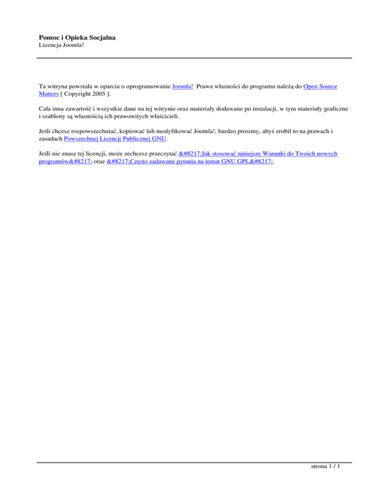 Pomoc i Opieka Socjalna Licencja Joomla! Ta witryna powstała w oparciu o oprogramowanie Joomla! Prawa własności do programu należą do Open Source Matters [ Copyright 2005 ]. Cała inna zawartość i wszystkie dane na tej witrynie oraz materiały dodawane po instalacji, w tym materiały graficzne i szablony są własnością ich prawowitych właścicieli. Jeśli chcesz rozpowszechniać, kopiować lub modyfikować Joomla!, bardzo prosimy, abyś zrobił to na prawach i zasadach Powszechnej Licencji Publicznej GNU. Jeśli nie znasz tej licencji, może zechcesz przeczytać ’Jak stosować niniejsze Warunki do Twoich nowych programów’ oraz ’Często zadawane pytania na temat GNU GPL’. strona 1 / 1