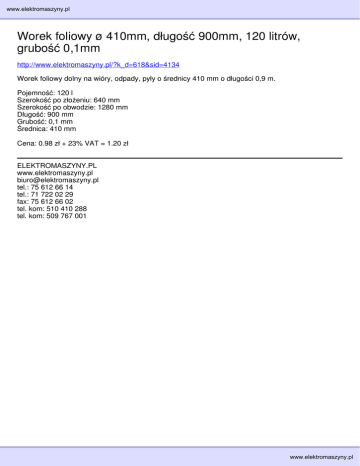 www.elektromaszyny.pl Worek foliowy ø 410mm, długość 900mm, 120 litrów, grubość 0,1mm http://www.elektromaszyny.pl/?k_d=618&sid=4134 Worek foliowy dolny na wióry, odpady, pyły o średnicy 410 mm o długości 0,9 m. Pojemność: 120 l Szerokość po złożeniu: 640 mm Szerokość po obwodzie: 1280 mm Długość: 900 mm Grubość: 0,1 mm Średnica: 410 mm Cena: 0.98 zł + 23% VAT = 1.20 zł ELEKTROMASZYNY.PL www.elektromaszyny.pl [email protected] tel.: 75 612 66 14 tel.: 71 722 02 29 fax: 75 612 66 02 tel. kom: 510 410 288 tel. kom: 509 767 001 www.elektromaszyny.pl