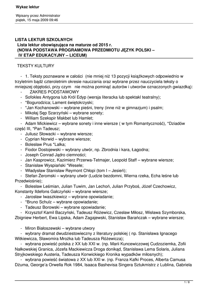 Wykaz lektur Wpisany przez Administrator piątek, 15 maja 2009 09:46 LISTA LEKTUR SZKOLNYCH Lista lektur obowiązująca na maturze od 2015 r. (NOWA PODSTAWA PROGRAMOWA PRZEDMIOTU JĘZYK POLSKI – IV ETAP EDUKACYJNY – LICEUM) TEKSTY KULTURY - 1. Teksty poznawane w całości (nie mniej niż 13 pozycji książkowych odpowiednio w trzyletnim bądź czteroletnim okresie nauczania oraz wybrane przez nauczyciela teksty o mniejszej objętości, przy czym nie można pominąć autorów i utworów oznaczonych gwiazdką): ZAKRES PODSTAWOWY - Sofokles Antygona lub Król Edyp (wersja literacka lub spektakl teatralny); - *Bogurodzica; Lament świętokrzyski; - *Jan Kochanowski – wybrane pieśni, treny (inne niż w gimnazjum) i psalm; - Mikołaj Sęp Szarzyński – wybrane sonety; - William Szekspir Makbet lub Hamlet; - Adam Mickiewicz – wybrane sonety i inne wiersze ( w tym Romantyczność), *Dziadów część III, *Pan Tadeusz; - Juliusz Słowacki – wybrane wiersze; - Cyprian Norwid – wybrane wiersze; - Bolesław Prus *Lalka; - Fiodor Dostojewski – wybrany utwór, np. Zbrodnia i kara, Łagodna; - Joseph Conrad Jądro ciemności; - Jan Kasprowicz, Kazimierz Przerwa-Tetmajer, Leopold Staff – wybrane wiersze; - Stanisław Wyspiański *Wesele; - Władysław Stanisław Reymont Chłopi (tom I – Jesień); - Stefan Żeromski – wybrany utwór (Ludzie bezdomni, Wierna rzeka, Echa leśne lub Przedwiośnie); - Bolesław Leśmian, Julian Tuwim, Jan Lechoń, Julian Przyboś, Józef Czechowicz, Konstanty Ildefons Gałczyński – wybrane wiersze; - Jarosław Iwaszkiewicz – wybrane opowiadanie; - *Bruno Schulz – wybrane opowiadanie; - Tadeusz Borowski – wybrane opowiadanie; - Krzysztof Kamil Baczyński, Tadeusz Różewicz, Czesław Miłosz, Wisława Szymborska, Zbigniew Herbert, Ewa Lipska, Adam Zagajewski, Stanisław Barańczak – wybrane wiersze; - Miron Białoszewski – wybrane utwory - wybrany dramat dwudziestowieczny z literatury polskiej ( np. Stanisława Ignacego Witkiewicza, Sławomira Mrożka lub Tadeusza Różewicza); - wybrana powieść polska z XX lub XXI w. (np. Marii Kuncewiczowej Cudzoziemka, Zofii Nałkowskiej Granica, Józefa Mackiewicza Droga donikąd, Stanisława Lema Solaris, Juliana Stryjkowskiego Austeria, Tadeusza Konwickiego Kronika wypadków miłosnych); - wybrana powieść światowa z XX lub XXI w. (np. Franza Kafki Proces, Alberta Camusa Dżuma, George’a Orwella Rok 1984, Isaaca Bashevisa Singera Sztukmistrz z Lublina, Gabriela 1/8 Wykaz lektur Wpisany przez Administrator piątek, 15 maja 2009 09:46 Garcii Marqueza Sto lat samotności, Umberto Eco Imię róży). ZAKRES ROZSZERZONY - Teksty określone dla poziomu podstawowego, a ponadto: - Horacy – wybrane liryki; - Jan Kochanowski Treny (jako cykl poetycki); poezja barokowa (np. Daniel Naborowski, Jan Andrzej Morsztyn); - wybrany wiersz z romantycznej poezji europejskiej; - Juliusz Słowacki Kordian lub Fantazy; - Zygmunt Krasiński Nie-Boska Komedia; realistyczna lub naturalistyczna powieść europejska (np. Honoriusz Balzak Ojciec Goriot, Emil Zola Nana lub Gustaw Flaubert Pani Bovary); - Stanisław Ignacy Witkiewicz Szewcy; - Gustaw Herling-Grudziński – wybrane opowiadanie; - Michał Bułhakow Mistrz i Małgorzata; - wybrana powieść lub zbiór opowiadań z XX lub XXI w. (np. Marii Dąbrowskiej, Zofii Nałkowskiej, Marii Kuncewiczowej, Józefa Wittlina, Józefa Mackiewicza, Juliana Stryjkowskiego, Andrzeja Kuśniewicza, Tadeusza Konwickiego, Stanisław Lema, Wiesław Myśliwskiego, Marka Nowakowskiego, Jerzego Pilcha, Olgi Tokarczuk, Stefana Chwina, Pawła Huellego); - wybrana powieść (lub zbiory opowiadań) dwudziestowiecznych autorów z literatury światowej (np. Franza Kafki, Thomasa Manna, Vladimira Nabokova, Alberta Camusa, Isaaca Bashevisa Singera, Johna Steinbecka, Kurta Vonneguta, Gabriela Garcii Marqueza, Güntera Grassa, Umberto Eco, Milana Kundery); - wybrane wiersze dwudziestowiecznych poetów polskich (innych niż wymienieni na poziomie podstawowym). 2. Teksty poznawane w całości lub w części (decyzja należy do nauczyciela), przy czym nie można pominąć utworu oznaczonego gwiazdką: ZAKRES PODSTAWOWY - wybór mitów; - Dzieje Tristana i Izoldy; - Miguel Cervantes Don Kichot; - Jan Chryzostom Pasek Pamiętniki; - Ignacy Krasicki – wybrana satyra lub Monachomachia; - Adam Mickiewicz Dziady część IV; - Juliusz Słowacki Kordian; - Witold Gombrowicz *Ferdydurke; - Irit Amiel – wybrane opowiadanie z tomu Osmaleni lub Hanna Krall Zdążyć przed Panem Bogiem; - Gustaw Herling-Grudziński Inny świat; - Ryszard Kapuściński Podróże z Herodotem; - Biblia (wybrane psalmy, fragmenty: Pieśni nad Pieśniami, Księgi Hioba, Apokalipsy św. 2/8 Wykaz lektur Wpisany przez Administrator piątek, 15 maja 2009 09:46 Jana); ZAKRES ROZSZERZONY - teksty określone dla zakresu podstawowego, a ponadto: - wybrany esej Mieczysława Jastruna lub Zygmunta Kubiaka poświęcony kulturze antycznej; - Dante Alighieri Boska komedia; - Johann Wolfgang Goethe Faust; - Czesław Miłosz – wybrany esej; - Zbigniew Herbert – wybrany esej; - inny esej autora polskiego (np. Kazimierza Wyki, Jana Błońskiego, Marii Janion, Leszka Kołakowskiego, ks. Józefa Tischnera, Jarosława Rymkiewicza, Jerzego Stempowskiego); - wybrany reportaż autora polskiego (np. Ryszarda Kapuścińskiego, Krzysztofa Kąkolewskiego, Hanny Krall, Henryka Grynberga); - dziennik (np. Marii Dąbrowskiej, Zofii Nałkowskiej, Jarosława Iwaszkiewicza, Witolda Gombrowicza); - Jan Paweł II Tryptyk Rzymski; Biblia (fragmenty Starego i Nowego Testamentu jako konteksty interpretacyjne dla lektury dzieł z innych epok). 2. Inne: ZAKRES PODSTAWOWY - wybrane filmy z twórczości polskich reżyserów (np. Krzysztofa Kieślowskiego, Andrzeja Munka, Andrzeja Wajdy, Krzysztofa Zanussiego); - homilia Jana Pawła II wygłoszona 2 czerwca 1979 roku w Warszawie na Placu Zwycięstwa (Piłsudskiego) – nagranie telewizyjne. ZAKRES ROZSZERZONY - jak d