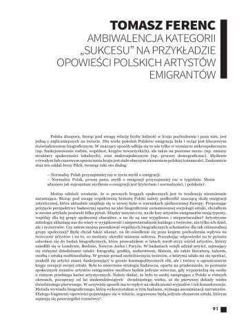 TOMASZ FERENC AMBIWALENCJA KATEGORII „SUKCESU” NA PRZYKŁADZIE OPOWIEŚCI POLSKICH ARTYSTÓW EMIGRANTÓW Polska diaspora, biorąc pod uwagę relację liczby ludność w kraju pochodzenia i poza nim, jest jedną z najliczniejszych na świecie. Dla wielu pokoleń Polaków emigracja była i wciąż jest kluczowym doświadczeniem biograficznym. W znaczący sposób odbija się to nie tylko w wymiarze mikrospołecznym (np. funkcjonowanie rodzin, wspólnot, kręgów towarzyskich), ale także na poziome mezo- (np. zmiany struktury społeczności lokalnych), oraz makrospołecznym (np. procesy demograficzne). Myślenie o trwałym lub czasowym opuszczeniu kraju jest stale obecnym elementem polskiej tożsamości. Znakomicie stan ten oddał Jerzy Pilch, tworząc taki oto dialog: – Normalny Polak przynajmniej raz w życiu myśli o emigracji. – Normalny Polak, proszę pana, myśli o emigracji przynajmniej raz w tygodniu. Moim zdaniem jak najczęstsze myślenie o emigracji jest kryterium i normalności, i polskości1. Można odnieść wrażenie, że w pewnych kręgach społecznych jest to tendencja niezmiennie narastająca. Biorąc pod uwagę współczesną historię Polski należy podkreślić znaczącą skalę emigracji artystycznej, która aktualnie znajduje się w nowej fazie w warunkach zjednoczonej Europy. Proponując przyjęcie perspektywy badawczej opartej na idei biograficznie zorientowanej socjologii sztuki, chciałbym w swoim artykule postawić kilka pytań. Między innymi o to, na ile losy artystów emigrantów mają typowy, wspólny dla tej grupy społecznej charakter, a na ile są one wyjątkowe i niepowtarzalne? Artystyczne mitologie skłaniają nas do wiary w wyjątkowość i niepowtarzalność każdego z twórców, nie tylko ich dzieł, ale i życiorysów. Czy zatem można poszukiwać wspólnych biograficznych schematów dla tak różnorodnej grupy społecznej? Będę chciał także ukazać, na ile osiedlenie się poza krajem pochodzenia wpływa na twórczość artystów i na to, co możemy określić mianem sukcesu. Poszukując odpowiedzi na te pytania odwołam się do badań biograficznych, które prowadziłem w latach 2008-2012 wśród artystów, którzy osiedlili się w Londynie, Berlinie, Nowym Jorku i Paryżu. W badaniach wzięli udział artyści, zajmujący się różnymi dziedzinami sztuki: fotografią, grafiką, malarstwem, filmem, ale także literaturą, tańcem, rzeźbą i sztuką multimedialną. W gronie ponad sześćdziesięciu twórców, z którymi udało mi się spotkać, znaleźli się artyści znani, funkcjonujący w gronie kosmopolitycznych elit, ale i twórcy o ograniczonym kręgu recepcji swojej sztuki. Była to zmierzona strategia badawcza, oparta na przekonaniu, że poznanie społecznych światów artystów emigrantów możliwe będzie jedynie wówczas, gdy wypowiedzą się osoby o różnym przebiegu karier artystycznych. Należy dodać, że było to osoby emigrujące z Polski w różnych okresach, począwszy od lat siedemdziesiątych dwudziestego wieku, aż do pierwszej dekady wieku dwudziestego pierwszego. W oczywisty sposób ma to wpływ na okoliczności wyjazdów i ich konsekwencje. Metoda wywiadu biograficznego, którą wykorzystałem w tym badaniu, wymaga anonimizacji narratorów. Dlatego fragmenty opowieści pojawiające się w tekście, sygnowane będą jedynie obszarem sztuki, którym zajmują się poszczególni rozmówcy2. 91 Przyczyny wyjazdów i strategie adaptacyjne emigrantów. Kilka uwag wstępnych Kluczowe dla zrozumienia procesów emigracyjnych jest pytanie o przyczyny wyjazdów. Ustalenie listy powodów emigracji stało się pierwszym celem badania. Z reguły, co podkreślało wielu artystów, ich zamiary emigracyjne kształtowały się przez wiele lat. W znacznej części przypadków nie były to też plany na trwałą emigrację, a raczej proces formowania się pewnej postawy, rozwijania kosmopolitycznych dyspozycji, chęci doświadczania i uczestniczenia w innej rzeczywistości niż polska. Jedną z klasycznych już teorii próbujących wyjaśnić przyczyny emigracji jest koncepcja push i pull sformułowana przez Everett S. Lee w latach sześćdziesiątych dwudziestego wieku. I choć przez wielu badaczy traktowana jest jako zbyt upraszczająca, to w moim przekonaniu wciąż może być przydatna do analizy zjawiska emigracji. Zakłada ona istnienie dwóch, wzajemnie na siebie oddziałujących czynników. Pierwszy z nich (push) ma działanie wypychające jednostkę z kraju pochodzenia, drugi (pull) przyciąga ją do innego miejsca osiedlenia. Oba te czynniki zazwyczaj działają równocześnie, tworząc dynamiczny układ. Czynniki push to między innymi: brak pracy, głód, słaba opieka medyczna, katastrofy naturalne, zanieczyszczenie środowiska, złe warunki mieszkaniowe, prześladowania polityczne, brak wolości słowa i wyznania, dyskryminacja, ograniczone szanse na znalezienie życiowego partnera i założenie rodziny, brak poczucia bezpieczeństwa, obawa o przyszłość. Wśród czynników pull pojawiają się natomiast: szansa uzyskania zatrudnienia, lepsze warunki życia, wolność polityczna i religijna, lepsza opieka medyczna, bezpieczeństwo, uprzemysłowienie, edukacja, powiązania rodzinne (migracja łańcuchowa), korzystniejsze zabezpieczenia emerytalne. Kolejnymi istotnymi elementami tego modelu są przeszkody pośrednie oraz czynniki osobiste. Przeszkody pośrednie mogą uniemożliwić emigrację podobnie jak kompleks czynników osobistych, który może wzmacniać lub osłabiać możliwości i wolę opuszczenia miejsca zamieszkania. Wedle tej koncepcji decyzja o migracji podejmowana jest w oparciu o porównanie cech miejsca pochodzenia i docelowej lokalizacji3. Zbiór czynników za każdym razem ma charakter subiektywny i, co istotne, występuje w nim znacząca różnica w sposobie oceniania cech miejsca pochodzenia i cech miejsca ewentualnego wyjazdu. Pierwsze z nich są jednostce znane, podczas gdy drugie postają w mni