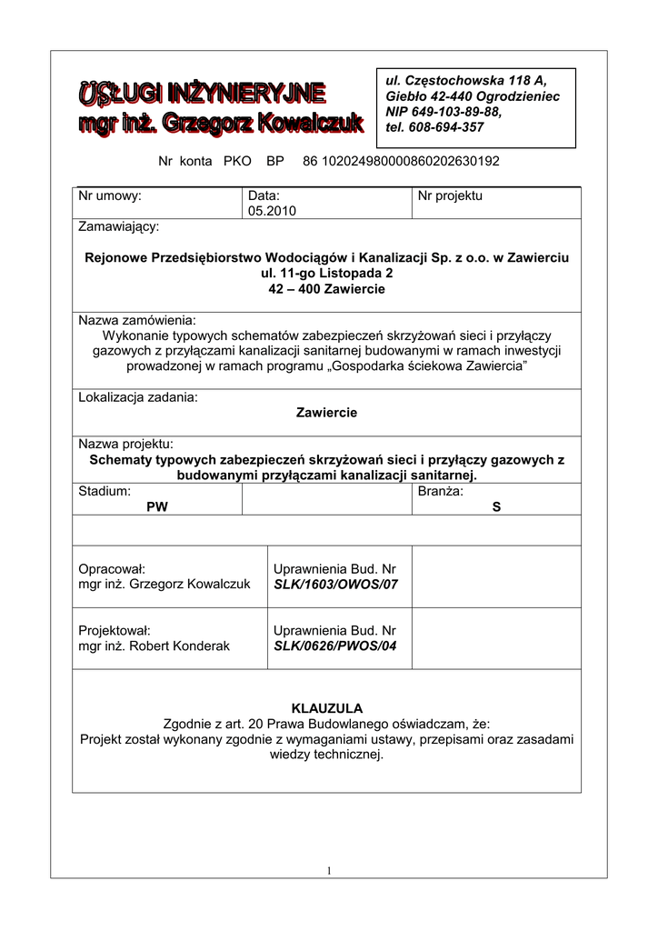 ul. Częstochowska 118 A, Giebło 42-440 Ogrodzieniec NIP 649-103-89-88, tel. 608-694-357 Nr konta PKO Nr umowy: BP 86 102024980000860202630192 Data: 05.2010 Nr projektu Zamawiający: Rejonowe Przedsiębiorstwo Wodociągów i Kanalizacji Sp. z o.o. w Zawierciu ul. 11-go Listopada 2 42 – 400 Zawiercie Nazwa zamówienia: Wykonanie typowych schematów zabezpieczeń skrzyŜowań sieci i przyłączy gazowych z przyłączami kanalizacji sanitarnej budowanymi w ramach inwestycji prowadzonej w ramach programu „Gospodarka ściekowa Zawiercia” Lokalizacja zadania: Zawiercie Nazwa projektu: Schematy typowych zabezpieczeń skrzyŜowań sieci i przyłączy gazowych z budowanymi przyłączami kanalizacji sanitarnej. Stadium: BranŜa: PW S Opracował: mgr inŜ. Grzegorz Kowalczuk Uprawnienia Bud. Nr SLK/1603/OWOS/07 Projektował: mgr inŜ. Robert Konderak Uprawnienia Bud. Nr SLK/0626/PWOS/04 KLAUZULA Zgodnie z art. 20 Prawa Budowlanego oświadczam, Ŝe: Projekt został wykonany zgodnie z wymaganiami ustawy, przepisami oraz zasadami wiedzy technicznej. 1 A – CZĘŚĆ OPISOWA 1. Temat i zakres opracowania. 2. Podstawa opracowania. 3. Analiza poszczególnych przypadków skrzyŜowania/zbliŜeń przyłączy kanalizacji sanitarnej z sieciami i przyłączami gazowymi wraz z wytycznymi dotyczącymi ich zabezpieczenia. 3.1. SkrzyŜowanie gazociągu lub przyłącza gazowego o ciśnieniu nominalnym do 0,4 MPa (wybudowanego przed 30 lipca 2001) z przyłączem kanalizacji sanitarnej ułoŜonym poniŜej w/w gazociągów. 3.2. ZbliŜenie równoległe gazociągu lub przyłącza gazowego o ciśnieniu nominalnym do 0,4 MPa (wybudowanego przed 30 lipca 2001) z przyłączem kanalizacji sanitarnej ułoŜonym poniŜej w/w gazociągów. 3.3. SkrzyŜowanie gazociągu lub przyłącza gazowego o ciśnieniu nominalnym do 0,5 MPa (wybudowanego po 30 lipca 2001) z przyłączem kanalizacji sanitarnej ułoŜonym poniŜej w/w gazociągów. 3.4. ZbliŜenie równoległe gazociągu lub przyłącza gazowego o ciśnieniu nominalnym do 0,5 MPa (wybudowanego po 30 lipca 2001) z przyłączem kanalizacji sanitarnej ułoŜonym poniŜej w/w gazociągów 4. Technologia robót. 4.1. Wykonanie skrzyŜowania gazociągu z przyłączem kanalizacji sanitarnej dla przypadków opisanych w pkt. 3.1.b. i 3.3.b. 4.2. Wykonanie zbliŜenia gazociągu z przyłączem kanalizacji sanitarnej dla przypadków opisanych w pkt. 3.2. i 3.4. 5. Uwagi końcowe. B – ZAŁĄCZNIKI 1. 2. 3. 4. Wykaz ulic objętych opracowaniem. Umowa z dnia 27.05.2010 dotycząca przedmiotowego opracowania. Uprawnienia budowlane. Zaświadczenie z ŚOIIB. C – CZEŚĆ GRAFICZNA 1. 2. 3. 4. 5. 6. 7. 8. 9. 10. Schemat nr 1, Schemat nr 2, Schemat nr 3, Schemat nr 4, Schemat nr 5, Schemat nr 6, Schemat nr 7, Schemat nr 8, Schemat nr 9, Schemat nr 10. 2 1. Temat i zakres opracowania. Tematem niniejszego opracowania jest projekt wykonawczy typowych zabezpieczeń skrzyŜowań sieci i przyłączy gazowych z przyłączami kanalizacji sanitarnej. Przedmiotowym opracowaniem objęte są ulice zlokalizowane w miejscowości Zawiercie w rejonie których budowano nowe sieci i przyłącza kanalizacji sanitarnej w ramach projektu „Uporządkowanie gospodarki ściekowej w mieście Zawierciu”, szczegółowy wykaz ulic (przygotowany przez Rejonowe Przedsiębiorstwo Wodociągów i Kanalizacji w Zawierciu) objętych przedmiotowym projektem załączono do niniejszego opracowania jako załącznik nr 1. Zakres opracowania obejmuje wykonanie następujących typowych schematów: • skrzyŜowanie gazociągu stalowego z przyłączem kanalizacji sanitarnej, • skrzyŜowanie gazociągu PE z przyłączem kanalizacji sanitarnej. 2. Podstawa opracowania. • Umowa o dzieło zawarta pomiędzy Inwestorem, a Wykonawcą, • Rozporządzenie Ministra Przemysłu i Handlu z dnia 14.11.1995 w sprawie warunków technicznych jakim powinny odpowiadać sieci gazowe, • Rozporządzenie Ministra Gospodarki z dnia 30.07.2001 w sprawie warunków technicznych jakim powinny odpowiadać sieci gazowe, • Polska Norma PN-91, M-34501, • uzgodnienia branŜowe z GSG. 3. Analiza poszczególnych przypadków skrzyŜowania/zbliŜeń przyłączy kanalizacji sanitarnej z sieciami i przyłączami gazowymi wraz z wytycznymi dotyczącymi ich zabezpieczenia. Dla poniŜszej analizy przyjęto następujące załoŜenia: • gazociąg niskiego ciśnienia – do 5kPa włącznie, • gazociągi średniego ciśnienia powyŜej 5 kPa do 0,4 MPa włącznie, • gazociąg niskiego ciśnienia – do 10kPa włącznie (dotyczy gazociągów wybudowanych po 30 lipca 2001), • gazociągi średniego ciśnienia powyŜej 10 kPa do 0,5 MPa włącznie (dotyczy gazociągów wybudowanych po 30 lipca 2001), • odległość podstawowa – odległości określone w załączniku nr 1 do Rozporządzenie Ministra Przemysłu i Handlu z dnia 14.11.1995 w sprawie warunków technicznych jakim powinny odpowiadać sieci gazowe, • klasa lokalizacji – na potrzeby niniejszego opracowania zgodnie z § 6.2. Rozporządzenie Ministra Gospodarki z dnia 30.07.2001 w sprawie warunków technicznych jakim powinny odpowiadać sieci gazowe przyjęto I klasę lokalizacji dla gazociągów wybudowanych po 30 lipca 2001, 3.1. SkrzyŜowanie gazociągu lub przyłącza gazowego o ciśnieniu nominalnym do 0,4 MPa (wybudowanego przed 30 lipca 2001) z przyłączem kanalizacji sanitarnej ułoŜonym poniŜej w/w gazociągów. a. w przypadku, jeŜeli odległość pomiędzy zewnętrzną ścianką gazociągu oraz zewnętrzną ścianką przyłącza kanalizacji sanitarnej jest równa lub większa od odległości podstawowej dopuszcza się nie stosowanie rury ochronnej na gazociągu, b. w przypadku kiedy odległość pomiędzy zewnętrzną ścianką gazociągu oraz zewnętrzną ścianką przyłącza kanalizacji sanitarnej zawiera się pomiędzy od 1,5 do 0,15 [m] konieczne jest zabezpieczenie gazociągu rurą ochronną zgodnie z rys. nr 3 i 4, przy czym odległość pionowa między zewnętrzną ścia