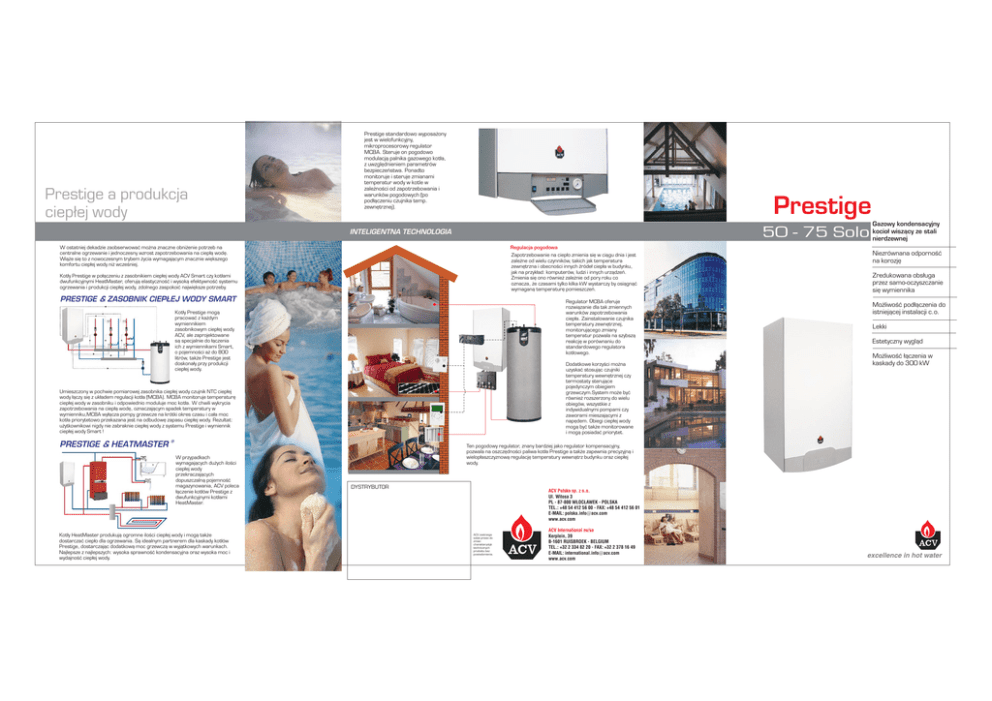 Prestige a produkcja ciep³ej wody Prestige standardowo wyposa¿ony jest w wielofunkcyjny, mikroprocesorowy regulator MCBA. Steruje on pogodowo modulacj¹ palnika gazowego kot³a, z uwzglêdnieniem parametrów bezpieczeñstwa. Ponadto monitoruje i steruje zmianami temperatur wody w kotle w zale¿noœci od zapotrzebowania i warunków pogodowych (po pod³¹czeniu czujnika temp. zewnêtrznej). Prestige 50 - 75 Solo INTELIGENTNA TECHNOLOGIA Regulacja pogodowa W ostatniej dekadzie zaobserwowaæ mo¿na znaczne obni¿enie potrzeb na centralne ogrzewanie i jednoczesny wzrost zapotrzebowania na ciep³¹ wodê. Wi¹¿e siê to z nowoczesnym trybem ¿ycia wymagaj¹cym znacznie wiêkszego komfortu ciep³ej wody ni¿ wczeœniej. Zapotrzebowanie na ciep³o zmienia siê w ci¹gu dnia i jest zale¿ne od wielu czynników, takich jak temperatura zewnêtrzna i obecnoœci innych Ÿróde³ ciep³a w budynku, jak na przyk³ad: komputerów, ludzi i innych urz¹dzeñ. Zmienia siê ono równie¿ zale¿nie od pory roku co oznacza, ¿e czasami tylko kilka kW wystarczy by osi¹gn¹æ wymagan¹ temperaturê pomieszczeñ. Kot³y Prestige w po³¹czeniu z zasobnikiem ciep³ej wody ACV Smart czy kot³ami dwufunkcyjnymi HeatMaster, oferuj¹ elastycznoœæ i wysok¹ efektywnoœæ systemu ogrzewania i produkcji ciep³ej wody, zdolnego zaspokoiæ najwiêksze potrzeby. PRESTIGE & ZASOBNIK CIEP£EJ WODY SMART Regulator MCBA oferuje rozwi¹zanie dla tak zmiennych warunków zapotrzebowania ciep³a. Zainstalowanie czujnika temperatury zewnêtrznej, monitoruj¹cego zmiany temperatur pozwala na szybsz¹ reakcjê w porównaniu do standardowego regulatora kot³owego. Kot³y Prestige mog¹ pracowaæ z ka¿dym wymiennikiem zasobnikowym ciep³ej wody ACV, ale zaprojektowane s¹ specjalnie do ³¹czenia ich z wymiennikami Smart, o pojemnoœci a¿ do 800 litrów, tak¿e Prestige jest doskona³y przy produkcji ciep³ej wody. Dodatkowe korzyœci mo¿na uzyskaæ stosuj¹c czujniki temperatury wewnêtrznej czy termostaty steruj¹ce pojedynczym obiegiem grzewczym.System mo¿e byæ równie¿ rozszerzony do wielu obiegów, wszystkie z indywidualnymi pompami czy zaworami mieszaj¹cymi z napêdem. Obiegi ciep³ej wody mog¹ byæ tak¿e monitorowane i mog¹ posiadaæ priorytet. Umieszczony w pochwie pomiarowej zasobnika ciep³ej wody czujnik NTC ciep³ej wody ³¹czy siê z uk³adem regulacji kot³a (MCBA). MCBA monitoruje temperaturê ciep³ej wody w zasobniku i odpowiednio moduluje moc kot³a. W chwili wykrycia zapotrzebowania na ciep³¹ wodê, oznaczaj¹cym spadek temperatury w wymienniku,MCBA wy³¹cza pompy grzewcze na krótki okres czasu i ca³a moc kot³a priorytetowo przekazana jest na odbudowê zapasu ciep³ej wody. Rezultat: u¿ytkownikowi nigdy nie zabraknie ciep³ej wody z systemu Prestige i wymiennik ciep³ej wody Smart ! PRESTIGE & HEATMASTER ® W przypadkach wymagaj¹cych du¿ych iloœci ciep³ej wody przekraczaj¹cych dopuszczaln¹ pojemnoœæ magazynowania, ACV poleca ³¹czenie kot³ów Prestige z dwufunkcyjnymi kot³ami HeatMaster. Kot³y HeatMaster produkuj¹ ogromne iloœci ciep³ej wody i mog¹ tak¿e dostarczaæ ciep³o dla ogrzewania. S¹ idealnym partnerem dla kaskady kot³ów Prestige, dostarczaj¹c dodatkow¹ moc grzewcz¹ w wyj¹tkowych warunkach. Najlepsze z najlepszych: wysoka sprawnoœæ kondensacyjna oraz wysoka moc i wydajnoœæ ciep³ej wody. Ten pogodowy regulator, znany bardziej jako regulator kompensacyjny, pozwala na oszczêdnoœci paliwa kot³a Prestige a tak¿e zapewnia precyzyjn¹ i wielop³aszczyznow¹ regulacjê temperatury wewn¹trz budynku oraz ciep³ej wody. DYSTRYBUTOR ACV Polska sp. z o.o. Ul. Witosa 3 PL - 87-800 W£OC£AWEK - POLSKA TEL.: +48 54 412 56 00 - FAX: +48 54 412 56 01 E-MAIL: [email protected] www.acv.com ACV zastrzega sobie prawo do zmian charakterystyk technicznych produktu bez powiadomienia. ACV International nv/sa Kerplein, 39 B-1601 RUISBROEK - BELGIUM TEL.: +32 2 334 82 20 - FAX: +32 2 378 16 49 E-MAIL: [email protected] www.acv.com Gazowy kondensacyjny kocio³ wisz¹cy ze stali nierdzewnej Niezrównana odpornoœæ na korozjê Zredukowana obs³uga przez samo-oczyszczanie siê wymiennika Mo¿liwoœæ pod³¹czenia do istniej¹cej instalacji c.o. Lekki Estetyczny wygl¹d Mo¿liwoœæ ³¹czenia w kaskady do 300 kW 4 POWODY ZAINSTALOWANIA KASKADY INSTALACJA KASKAD Sercem kot³a Prestige jest nowy, specjalnie przez ACV zaprojektowany wymiennik ciep³a ze stali nierdzewnej. Wyprodukowany zosta³ na podstawie 80 lat doœwiadczeñ firmy ACV w produkcji urz¹dzeñ grzewczych. Spaliny przep³ywaj¹ ku do³owi przez kana³y spalin wymiennika ciep³a i kondensuj¹. Nastêpuje maksymalne wykorzystanie energii wytwarzanej w procesie spalania. Wynikiem zastosowania takiej konstrukcji jest wysokosprawny i bardzo wydajny kocio³ o wyj¹tkowej mocy przy ma³ych gabarytach. WYJ¥TKOWA ODPORNOŒÆ NA KOROZJÊ Stal nierdzewna oferuje wysok¹ odpornoœæ na korozjê wody obiegu grzewczego, która mo¿e zawieraæ rozpuszczony tlen oraz ró¿ne dodatki i zanieczyszczenia. Stal wymiennika jest tak¿e odporna na kwaœny kondensat, powstaj¹cy w kana³ach spalin, a nawet na obecnoœæ siarki pozosta³ej po spalaniu gazu ziemnego czy propanu. ZREDUKOWANA OBS£UGA Wymiennik ciep³a ze stali nierdzewnej kot³a Prestige oczyszcza siê samoczynnie - kondensat sp³ywaj¹cy w dó³ kana³ów spalin oczyszcza je z resztek po spalaniu. Zapewnia to ci¹g³¹ pracê kot³a, przy sta³ej maksymalnej sprawnoœci podczas ca³ego okresu u¿ytkowania i redukuje koniecznoœæ czyszczenia i konserwacji. STABILNOŒÆ TEMPERATURY KOT£A W wiêkszoœci kot³ów stosuje siê przewody wodne w komorze spalania, natomiast wymiennik ciep³a ze stali nierdzewnej kot³a Prestige ma kana³y spalinowe biegn¹ce wzd³u¿ zamkniêtego p³aszcza wodnego. Powoduje to co prawda wzrost iloœci wody w instalacji, ale utrzymuje stabiln¹ temperaturê kot³a i minimalizuje ryzyko przegrzania z powodu zmieniaj¹cych siê warunków odbioru WYSOK