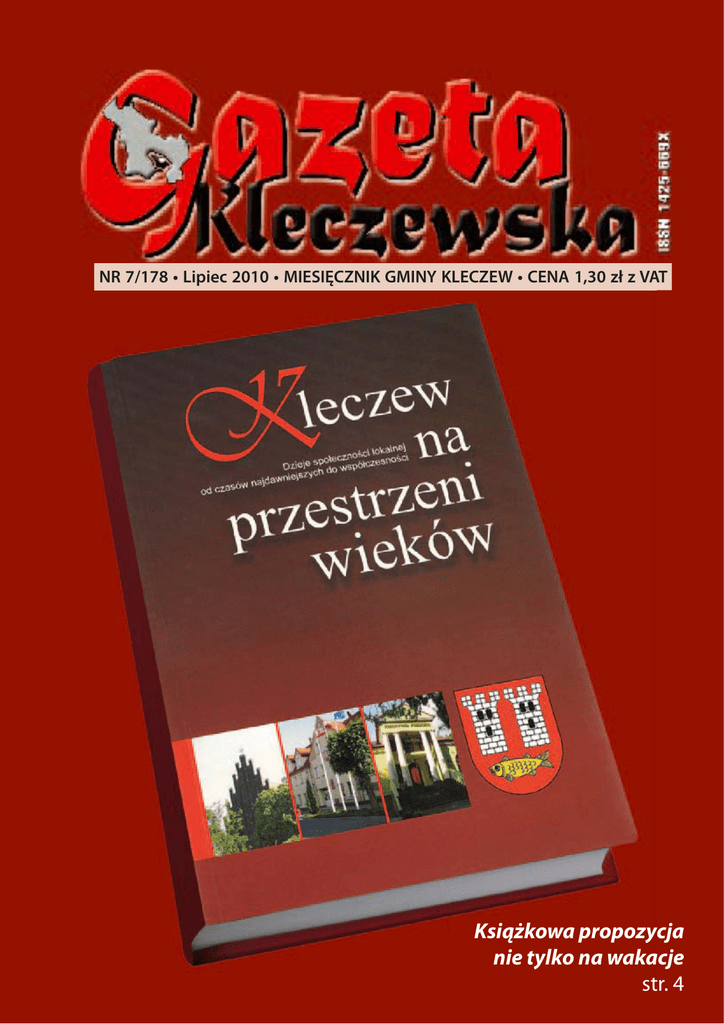 /3t-JQJFDt.*&4*Ɩ$;/*,(.*/:,-&$;&8t$&/"[[7"5 Książkowa propozycja nie tylko na wakacje str. 4 Noc Świętojańska T radycją już się stało, że MiejskoGminne Centrum Kultury podczas najkrótszej nocy w roku organizuje wieczór sobótkowy. W tym roku również nad Kleczewskim jeziorem Stępa od godz. 20.00 rozpoczęliśmy konkursem wianków świętojańskich. Mile zaskoczyła nas ilość wianków, dostarczono ich aż 16. 2 Szanowne Jury: Burmistrzowie Gminy i Miasta Kleczew p. Marek Wesołowski i p. Stanisław Maciejewski oraz Przewodniczący Rady Miejskiej w Kleczewie p. Maciej Trzewiczyński wyłonili najpiękniej wypleciony wianek przygotowany przez Dawida Biegasiewicza, który otrzymał nagrodę główną, pozostali uczestnicy konkursu otrzymali nagrody pocieszenia. Po wręczeniu nagród mogliśmy obejrzeć obrzęd nocy świętojańskiej przygotowany przez młodzież działającą w kole teatralnym przy Centrum Kultury w Kleczewie. Opiekunem grupy jest p. Sylwia Depińska. Na zakończenie wszyscy mogli podziwiać przepiękny pokaz sztucznych ognii i pląsać w rytm muzyki zespołu Ever Green Band. MS Wybory Prezydenta Rzeczypospolitej Polskiej W naszej gminie w głosowaniu, które odbyło się 20 czerwca 2010 r. udział wzięło 3.996 wyborców na uprawnionych 7.731. Frekwencja wyniosła 51,69%. Wyniki głosowania (głosy ważne) na poszczególnych kandydatów w I turze wyborów przedstawiały się następująco: 1. JUREK Marek - 15 głosów - 0,38% 2. KACZYŃSKI Jarosław Aleksander - 1.926 głosów - 48,56% 3. KOMOROWSKI Bronisław Maria - 955 głosów - 24,08% 4. KORWIN-MIKKE Janusz Ryszard - 60 głosów - 1,51% 5. LEPPER Andrzej Zbigniew - 66 głosów - 1,66% 6. MORAWIECKI Kornel Andrzej - 8 głosów - 0,20% 7. NAPIERALSKI Grzegorz Bernard - 774 głosy - 19,52% 8. OLECHOWSKI Andrzej Marian - 32 głosy - 0,81% 9. PAWLAK Waldemar - 122 głosy - 3,08% 10. ZIĘTEK Bogusław Zbigniew - 8 głosów - 0,20%. CZERWIEC 2010 W kraju pierwszą turę wyborów prezydenckich wygrał Bronisław Komorowski, zdobywając ponad 41% głosów. Prawie 37% głosów wyborcy oddali na Jarosława Kaczyńskiego. Pomiędzy tymi dwoma kandydatami rozstrzygnięta została II tura wyborów. Głosowanie ponowne, które odbyło się 4 lipca, wygrał w kraju Bronisław Komorowski, uzyskując 53,1% poparcia. Jarosław Kaczyński uzyskał 46,99% poparcia. W gminie Kleczew kandydaci ci uzyskali następujące wyniki: 1. KACZYŃSKI Jarosław Aleksander - 2.638 głosów - 65,59% 2. KOMOROWSKI Bronisław Maria - 1.384 głosy - 34,41%. W pięciu obwodach głosowania w naszej gminie zagłosowało 4.079 wyborców na uprawnionych 7.845. W II turze frekwencja wyniosła 51,99%. Państwowa Komisja Wyborcza po przeliczeniu głosów ze wszystkich obwodów wyborczych w kraju, w dniu 5 lipca br. opublikowała oficjalne wyniki drugiej tury wyborów prezydenckich, a dzień później wręczyła na Zamku Królewskim w Warszawie Panu Bronisławowi Komorowskiemu uchwałę stwierdzającą wybór na Prezydenta RP. Urzędnik wyborczy Sesja Rady Miejskiej 22 czerwca odbyła się LX sesja Rady Miejskiej w Kleczewie. Obradom przewodniczył Marian Kapela – wiceprzewodniczący RM, który zgodnie z porządkiem obrad, po stwierdzeniu quorum, zaproponował przyjęcie pod głosowanie dodatkowej uchwały dotyczącej pomocy finansowej dla Powiatu Konińskiego, z przeznaczeniem na modernizację dróg powiatowych i chodników przy drodze Budzisław Kościelny – Budzisław Górny. Przyjęty nowy porządek obrad przewidywał najpierw interpelacje i wnioski radnych: radny J. Sucholas wnioskował o oczyszczenie parku w Nieborzynie oraz o remont schodów wejściowych do świetlicy wiejskiej w Nieborzynie, a wiceprzewodniczący RM J. Ruszkowski wnioskował o zakrycie kilku studzienek kanalizacyjnych deklami, ponieważ zostały one skradzione. Z zapytań do rad- nych powiatowych zadano pytanie o wykoszenie poboczy dróg. Rada Miejska na tej sesji podjęła uchwały m.in. o zmianie statutu Związku Powidzkiego Parku Krajobrazowego, którego członkiem jest Gmina Kleczew, uchwałę o sprzedaży lokalu mieszkalnego stanowiącego własność gminy, położonego w Kleczewie na ul. Poznańskiej, uchwałę w sprawie przejęcia na rzecz Gminy Kleczew nieruchomości gruntowej stanowiącej własność Skarbu Państwa, położonej w obrębie Marszewo, uchwałę o zmianach w budżecie Gminy Kleczew oraz uchwałę o udzieleniu pomocy Powiatowi Konińskiemu na modernizację drogi i budowę chodników przy drodze powiatowej Budzisław Górny. Podczas sesji Rada Miejska przyznała wyróżnienia dla pana Daniela Bednarka, c.d. na str. 5 NA ŚWIECIE: W Rostowie nad Donem miał miejsce szczyt Rosja-Unia Europejska • 52-letni taksówkarz zabił 12 osób w regionie Lake District w północno-zachodniej Anglii • 63-letni Naoto Kan, dotychczasowy minister finansów, został premierem Japonii • Papież Benedykt XVI odwiedził prawosławną część Cypru • Węgierski premier Viktor Orbán przedstawił w parlamencie 29-punktowy plan naprawy finansów publicznych • 21-letni Piotr Kosiński, student Akademii Muzycznej w Krakowie, wygrał Amerykański Konkurs Pianistyczny im. Ignacego Jana Paderewskiego, który odbył się w Los Angeles • Rozpoczęły się piłkarskie mistrzostwa świata w Republice Południowej Afryki • W Afganistanie zginęło kolejnych trzech polskich żołnierzy: kapral Miłosz Górka, starszy szeregowy Grzegorz Bukowski i kapral Paweł Stypuła • Trybunał Praw Człowieka w Strasburgu orzekł, iż brak stopnia z religii/etyki na polskim świadectwie szkolnym łamie prawo do milczenia w sprawach religii • W wieku 72 lat zmarła w Nowym Jorku znana aktorka Elżbieta Czyżewska, a w wieku 87 lat, na hiszpańskiej wyspie Lanzarote, portugalski pisarz, laureat literackiego Nobla w 1998 roku – José Saramago • Po rezygnacji Andżeliki Borys nową szefową Związku Polaków na Białorusi została Andżelika Orechwo • 41-letnia Mari Kiviniemi