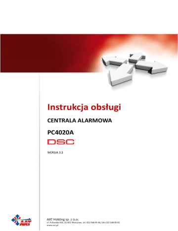Instrukcja obsługi CENTRALA ALARMOWA PC4020A WERSJA 3.3 Centrala alarmowa – Instrukcja obsługi Szanowni Państwo Mamy przyjemność przekazać Państwu kilka podstawowych informacji o właśnie zainstalowanym systemie alarmowym MAXSYS, którego sercem jest centrala PC4020A produkowana przez wiodący kanadyjski koncern DSC (Digital Security Controls Ltd.) oferujący swoje produkty na całym świecie. Prosimy o zapoznanie się niniejszą instrukcją obsługi. Mamy nadzieję, Ŝe pomoŜe ona Państwu sprawnie korzystać ze systemu alarmowego oraz wyjaśni wątpliwości, jakie mogą się pojawić w trakcie eksploatacji. Ze względu na to, Ŝe instrukcja zawiera informacje dotyczące Państwa systemu alarmowego prosimy o trzymanie jej w bezpiecznym miejscu. Wszelkie zastrzeŜenia odnośnie pracy systemu alarmowego prosimy kierować do Państwa Instalatora, którego dane naleŜy wpisać na końcu tej instrukcji. Zachęcamy równieŜ do podpisania z Instalatorem umowy na serwis pogwarancyjny systemu. śyczymy Państwu, aby centrala PC4020A nie musiała nigdy informować o napadzie czy włamaniu, z powaŜaniem Wyłączny Dystrybutor firmy w Polsce: AAT Trading Company Sp. z o.o. ul. Puławska 431, 02-801 Warszawa AAT Holding sp. z o.o. Wszelkie prawa zastrzeżone. 3 Centrala alarmowa – Instrukcja obsługi Spis treści Wprowadzenie 1. 1.1 1.2 1.3 1.4 1.5 1.6 1.7 6 Podstawowa obsługa 7 Włączanie w dozór ......................................................................... 7 Tryby włączania w dozór ............................................................... 8 Wyłączanie z dozoru ..................................................................... 9 Pamięć alarmów [*][3] ................................................................... 10 Sygnalizacja alarmowa .................................................................. 10 Blokowanie linii [*][1] ................................................................... 10 Przegląd usterek [*][2] ................................................................... 11 2. Kody dostępu 14 2.1 Programowanie kodów .................................................................. 14 2.2 Rodzaje kodów .............................................................................. 17 2.3 Kody programowane przez instalatora .......................................... 17 3. Funkcje i opcje systemowe 18 3.1 Szybkie włączenie [*][6][kod dostępu][0][0]................................. 18 3.2 Szybkie wyjście [*][6][kod dostępu][0][1] .................................... 18 3.3 Komunikat specjalny [*][6][kod dostępu][0][2] ............................ 18 3.4 T-kod [*][6][kod dostępu][0][3]..................................................... 18 3.5 Wejście muzyczne [*][6][kod dostępu][0][4] ................................ 18 3.6 Test systemu [*][6][kod dostępu][1][0] ......................................... 18 3.7 Test sygnalizacji poŜarowej [*][6][kod dostępu][1][1].................. 18 3.8 UŜytkownik wywołuje komputer [*][6][kod dostępu][1][2] ......... 18 3.9 Test wyjść modułu PC4216 [*][6][kod dostępu][1][3] .................. 19 3.10 Szybka blokada [*][6][kod dostępu][1][4].................................... 19 3.11 Kontrola autowłączenia [*][6][kod dostępu][2] ............................ 19 3.12 Ustawienia klawiatury [*][6][kod dostępu][3] .............................. 19 3.13 Wyjścia uŜytkowe [*][7] ............................................................... 19 3.14 Gong [*][4] .................................................................................... 20 3.15 Główne opcje systemowe ............................................................. 20 3.15.1 Zobacz pamięć zdarzeń ............................................................. 20 3.15.2 Ustawianie czasu systemowego ................................................. 20 3.15.3 Ustawianie daty systemowej ..................................................... 20 3.15.4 Zezwolenie na DLS 1H .............................................................. 20 3.15.5 Reset systemu ............................................................................. 20 3.15.6 Aktywacja PC - LINKa .............................................................. 20 4. Dodatkowe funkcje klawiatury 21 4.1 Przyciski alarmowe......................................................................... 21 4.2 Przyciski funkcyjne ........................................................................ 21 4.3 Blokowanie klawiatury................................................................... 21 AAT Holding sp. z o.o. Wszelkie prawa zastrzeżone. 4 Centrala alarmowa – Instrukcja obsługi 5. Funkcje specjalne 22 5.1 Programowanie instalatorskie [*][8][kod instalatora] ................... 22 5.2 Testowanie instalacji [*][6][kod testowania] ................................. 22 6. Funkcje kontroli dostępu 23 6.1 Czytniki (PC4820).......................................................................... 23 6.2 Włączanie i wyłączanie systemu alarmowego kartą ...................... 23 6.3 Konfigurowanie karty (PC4820) .................................................... 24 6.4 Numer telefoniczny lokatora (PC4850) ......................................... 24 6.5 Kod lokatora (PC4850) .................................................................. 24 Tabela znaków klawiatury AAT Holding sp. z o.o. Wszelkie prawa zastrzeżone. 25 5 Centrala alarmowa – Instrukcja obsługi Wprowadzenie System alarmowy to zespół elementów i urządzeń, których zadaniem jest informowanie o zagroŜeniach takich jak: napad, włamanie, poŜar, ulatniający się gaz, mogących wystąpić w Państwa obiekcie (biurze, sklepie, magazynie, itp.). Praca poszczególnych fragmentów systemu alarmowego nadzorowana jest przez centralę alarmową, zaprogramowaną przez Instalatora. Do komunikowania się z centralą słuŜy klawiatura. Wszystkie czynności, związane z obsługą 