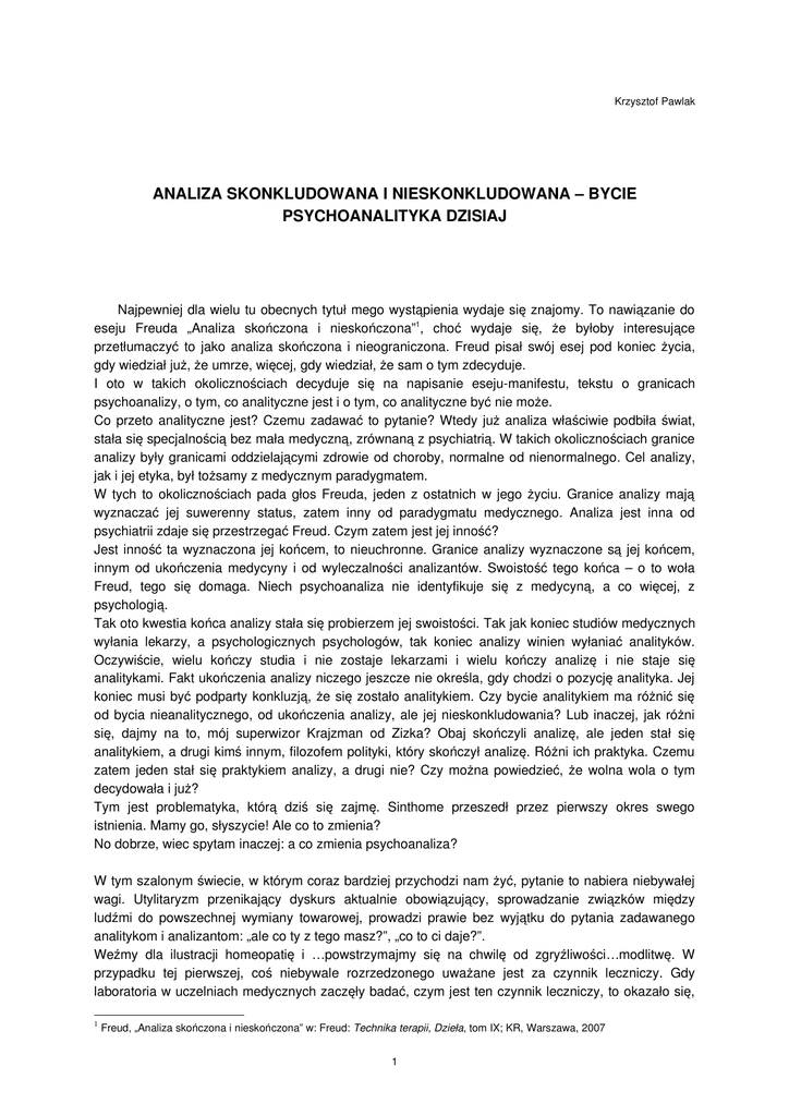 Krzysztof Pawlak ANALIZA SKONKLUDOWANA I NIESKONKLUDOWANA – BYCIE PSYCHOANALITYKA DZISIAJ Najpewniej dla wielu tu obecnych tytuł mego wystąpienia wydaje się znajomy. To nawiązanie do eseju Freuda „Analiza skończona i nieskończona”1, choć wydaje się, że byłoby interesujące przetłumaczyć to jako analiza skończona i nieograniczona. Freud pisał swój esej pod koniec życia, gdy wiedział już, że umrze, więcej, gdy wiedział, że sam o tym zdecyduje. I oto w takich okolicznościach decyduje się na napisanie eseju-manifestu, tekstu o granicach psychoanalizy, o tym, co analityczne jest i o tym, co analityczne być nie może. Co przeto analityczne jest? Czemu zadawać to pytanie? Wtedy już analiza właściwie podbiła świat, stała się specjalnością bez mała medyczną, zrównaną z psychiatrią. W takich okolicznościach granice analizy były granicami oddzielającymi zdrowie od choroby, normalne od nienormalnego. Cel analizy, jak i jej etyka, był tożsamy z medycznym paradygmatem. W tych to okolicznościach pada głos Freuda, jeden z ostatnich w jego życiu. Granice analizy mają wyznaczać jej suwerenny status, zatem inny od paradygmatu medycznego. Analiza jest inna od psychiatrii zdaje się przestrzegać Freud. Czym zatem jest jej inność? Jest inność ta wyznaczona jej końcem, to nieuchronne. Granice analizy wyznaczone są jej końcem, innym od ukończenia medycyny i od wyleczalności analizantów. Swoistość tego końca – o to woła Freud, tego się domaga. Niech psychoanaliza nie identyfikuje się z medycyną, a co więcej, z psychologią. Tak oto kwestia końca analizy stała się probierzem jej swoistości. Tak jak koniec studiów medycznych wyłania lekarzy, a psychologicznych psychologów, tak koniec analizy winien wyłaniać analityków. Oczywiście, wielu kończy studia i nie zostaje lekarzami i wielu kończy analizę i nie staje się analitykami. Fakt ukończenia analizy niczego jeszcze nie określa, gdy chodzi o pozycję analityka. Jej koniec musi być podparty konkluzją, że się zostało analitykiem. Czy bycie analitykiem ma różnić się od bycia nieanalitycznego, od ukończenia analizy, ale jej nieskonkludowania? Lub inaczej, jak różni się, dajmy na to, mój superwizor Krajzman od Zizka? Obaj skończyli analizę, ale jeden stał się analitykiem, a drugi kimś innym, filozofem polityki, który skończył analizę. Różni ich praktyka. Czemu zatem jeden stał się praktykiem analizy, a drugi nie? Czy można powiedzieć, że wolna wola o tym decydowała i już? Tym jest problematyka, którą dziś się zajmę. Sinthome przeszedł przez pierwszy okres swego istnienia. Mamy go, słyszycie! Ale co to zmienia? No dobrze, wiec spytam inaczej: a co zmienia psychoanaliza? W tym szalonym świecie, w którym coraz bardziej przychodzi nam żyć, pytanie to nabiera niebywałej wagi. Utylitaryzm przenikający dyskurs aktualnie obowiązujący, sprowadzanie związków między ludźmi do powszechnej wymiany towarowej, prowadzi prawie bez wyjątku do pytania zadawanego analitykom i analizantom: „ale co ty z tego masz?”, „co to ci daje?”. Weźmy dla ilustracji homeopatię i …powstrzymajmy się na chwilę od zgryźliwości…modlitwę. W przypadku tej pierwszej, coś niebywale rozrzedzonego uważane jest za czynnik leczniczy. Gdy laboratoria w uczelniach medycznych zaczęły badać, czym jest ten czynnik leczniczy, to okazało się, 1 Freud, „Analiza skończona i nieskończona” w: Freud: Technika terapii, Dzieła, tom IX; KR, Warszawa, 2007 1 że jego w ogóle nie ma, fizycznie nie ma. Zaczęto więc głosić, że to oszustwo, żerowanie na naiwności i wierze chorych. Od zawsze mówiono i pisano, że można modlitwą osiągnąć to czy owo. Laboratoria medyczne zajęły się i tym. I co stwierdzono? Że nie zaobserwowano żadnych efektów leczniczych. Szarlatani homeopatii i szarlatani modlitwy nie dają ludziom nic, stwierdzają w konsekwencji naukowcy, lub lepiej, wciskają ludziom kit. Mówią to wszystko wbrew świadectwom pacjentów. „Sama woda”, jak nazywają miksturę homeopatyczną naukowcy oraz żarliwość proszących przez modlitwę, zostaje pominięta i poniżona, a poddający się temu ludzie okrzyknięci sekciarzami. Czyż psychoanalityków nie spotyka to samo? Przecież słowo jest tym, co dajemy, tylko słowo, coś bez wartości użytkowej. Tak sprawa wygląda dziś, chociaż to dziś było już obecne przynajmniej przed 14 lipca 1953 roku. W swym liście z tego akurat dnia, pisanym do swego analityka, Lacan napisał – podaję we własnym, swobodnym epistolarnym stylu, w jakim to przetłumaczyłem: „Strony mego listu nie są pisane by ci coś wyjaśnić w znanej ci sprawie, ale po to by dać ci w możliwie otwarty sposób, na jaki pozwala nasza wyjątkowa relacja, żywe świadectwo, bez którego historia ta nie mogłaby być w ogóle napisana. W sprawach ludzi tyczących, żaden obiektywizm nie może być dostępny bez podstaw subiektywnych.”2 „ Żywe świadectwo” – to pojęcie, które teraz poddam refleksji. Koniec analizy – czy można go pozostawić poza obiektywizacją? Przypomnijmy dla wyłuskania istoty sprawy, że analityk Lacana, nie byle kto tylko wielki analityk, miał do końca swego życia głębokie przekonanie, że analiza tego „bufona”, „kobieciarza”, „ekscentryka”, „niereformowalnego psychopaty” , że użyję tylko kilku stwierdzeń z jego opinii kierowanej do komitetu członkowskiego Psychoanalitycznego Stowarzyszenia Francuskiego, nic nie dała i nie zrobił on w swej analizie żadnych postępów. W swej opinii prosił dalej o nie przyznawanie Lacanowi rangi członka, powiedzielibyśmy, zwyczajnego. Ostrzegał, że spowoduje on scysje i rozłamy, bo jest indywidualistą nad indywidualistami, nie podporządkowującym się nikomu. Cokolwiek by nie myśleć, Loewenstein się nie mylił – trafił w swej opinii w dziesiątkę. A jednak? Jego analizant wkrótce dowiódł, że a