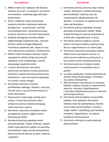 DLA DZIECKA: 1. Mleko matki jest najlepsze dla dziecka. Zmienia się wraz z rozwojem i wzrostem niemowlęcia, zaspokaja jego potrzeby żywieniowe. 2. Wraz z mlekiem matka przekazuje swojemu dziecku substancje aktywne biologicznie – przeciwciała, czynniki przeciwbakteryjne i przeciwwirusowe, enzymy, hormony, komórki macierzyste. 3. Rzadziej występują choroby układu oddechowego (zapalenie płuc, oskrzeli, astma) i pokarmowego (biegunki, martwicze zapalenie jelit, zaparcia oraz inne zaburzenia trawienia i wchłaniania) 4. Mleko matki zmniejsza również ryzyko wystąpienia infekcji dróg moczowych, zapalenia ucha środkowego, anemii, atopowego zapalenia skóry 5. U dzieci karmionych naturalnie obserwuje się lepszy rozwój poznawczy (zawarte w pokarmie kwasy tłuszczowe, cholesterol i cukry korzystnie wpływają na rozwój i pracę mózgu) 6. Karmienie naturalne stanowi profilaktykę nadwagi i otyłości, cukrzycy, chorób serca i naczyń krwionośnych w wieku dojrzałym. 7. Ssanie piersi wspomaga rozwój jamy ustnej. U dzieci karmionych tylko i wyłącznie piersią rzadziej występują wady wymowy i zgryzu. 8. Karmienie naturalne zmniejsza ryzyko wystąpienia zespołu nagłej śmierci łóżeczkowej (SIDS) 9. Karmienie piersią zaspokaja wiele potrzeb dziecka. Ciepło, bliskość, zapach matki mają ogromny wpływ na psychikę niemowlęcia i jego rozwój emocjonalny. Dzieci karmione piersią są ufne, radosne i pogodne. DLA MATKI: 1. Karmienie piersią umacnia więź miedzy matką i dzieckiem. Kobieta karmiąca piersią łatwiej i szybciej uczy się rozpoznawać sygnały płynące od dziecka. To sprawia, że opieka nad nim staje się łatwiejsza. 2. Karmienie piersią zaspokaja również potrzeby emocjonalne matek. Wiele kobiet karmiących piersią wspomina te chwile jako najpiękniejsze w życiu. 3. Karmienie piersią zwiększa zużycie kalorii. Karmiące kobiety szybciej tracą tłuszcz nagromadzony w czasie ciąży. 4. Karmienie naturalne powoduje szybsze obkurczanie się mięśnia macicy, co chroni przed nadmierną utratą krwi, a tym samym przed niedokrwistością. 5. Karmienie piersią zmniejsza ryzyko zachorowania na nowotwór piersi i jajnika. 6. w wieku podeszłym rzadziej dochodzi do złamań stawu biodrowego i zmniejsza się ryzyko osteoporozy 7. Jeśli karmienie trwa ponad 12 miesięcy, kobiety rzadziej chorują na nadciśnienie tętnicze, cukrzycę, hiperlipidemię i chorobę niedokrwienną serca w okresie pomenopauzalnym. 8. Karmienie piersią wpływa na psychikę kobiety. Pod wpływem karmienia kobieta staje się spokojniejsza, łatwiej znosi trudy macierzyństwa, czerpie z niego radość i satysfakcję, jest bardziej cierpliwa i łagodniejsza, ma lepsze podejście wychowawcze. 9. Karmienie zmniejsza ryzyko depresji poporodowej.