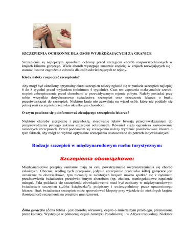SZCZEPIENIA OCHRONNE DLA OSÓB WYJEŻDŻAJĄCYCH ZA GRANICĘ Szczepienia są najlepszym sposobem ochrony przed szeregiem chorób rozpowszechnionych w krajach klimatu gorącego. Wiele chorób występuje znacznie częściej w krajach rozwijających się i stanowi istotne zagrożenie zdrowia dla osób odwiedzających te rejony. Kiedy należy rozpocząć szczepienia? Aby mógł być określony optymalny okres szczepień należy zgłosić się w punkcie szczepień najlepiej 6 do 8 tygodni przed wyjazdem (minimum 4 tygodnie). Czas ten zapewnia maksymalnie szeroki stopień zabezpieczenia przed chorobami w przewidywanym rejonie pobytu. Należy posiadać przy sobie wszystkie dotychczasowe świadectwa szczepień oraz orzeczenie lekarza o braku przeciwwskazań do szczepień. Niektóre kraje nie zezwalają na wjazd osób, które nie poddały się pełnej serii szczepień przeciwko określonym chorobom. O czym powinno się poinformować zlecającego szczepienia lekarza? Niektóre choroby alergiczne i przewlekłe, stosowanie leków bywają przeciwwskazaniem do przeprowadzenia pełnego zakresu szczepień ochronnych. Również ciąża ogranicza zastosowanie niektórych szczepionek. Przed poddaniem się szczepieniu należy wyraźnie poinformować lekarza o tych faktach, aby mógł on wybrać optymalne szczepienia dostosowane do potrzeb indywidualnych. Rodzaje szczepień w międzynarodowym ruchu turystycznym: Szczepienia obowiązkowe: Międzynarodowe przepisy sanitarne mają na celu powstrzymanie rozprzestrzeniania się chorób zakaźnych. Obecnie, według tych przepisów, jedynie szczepienie przeciwko żółtej gorączce jest uznawane za obowiązkowe, tym niemniej w niektórych krajach można spotkać się z żądaniem przedstawienia świadectwa przeciwko innym chorobom (np. cholera, meningokokowe zapalenie mózgu). Fakt poddania się szczepieniu obowiązkowemu musi być zapisany w międzynarodowym świadectwie szczepień („żółta książeczka"), podpisany i uwierzytelniony przez uprawnionego lekarza. Brak świadectwa szczepień może spowodować kłopoty przy wjeździe do niektórych krajów (konieczność szczepienia na przejściu granicznym). Żółta gorączka (Żółta febra) - jest chorobą wirusową, często o śmiertelnym przebiegu, przenoszoną przez komary. Występuje w północnej części Ameryki Południowej i w Afryce tropikalnej. Niektóre kraje wymagają szczepienia przeciwko żółtej gorączce od wszystkich podróżnych wjeżdżających na ich terytorium. Wiele krajów wymaga go tylko od przyjeżdżających z krajów, w których żółta gorączka występuje endemicznie. U dzieci szczepienie to jest obligatoryjne zazwyczaj dopiero po ukończeniu 1 roku życia. Dokładne informacje dostępne są w punktach szczepień przeciwko żółtej gorączce. Szczepienie jest bardzo dobrze tolerowane i daje doskonałą, utrzymującą się co najmniej 10 lat odporność. Szczepienie przeciwko żółtej gorączce jest wskazane na całym obszarze występowania tej choroby, również jeśli nie jest tam obowiązkowe. Szczepienia zalecane: Najczęstszym zakażeniem są wirusowe zapalenie wątroby typu A i typu B. Aby uzyskać pełną ochronę przed WZW typu A oraz WZW typu B zgodnie ze schematem podstawowym, podaje się trzy dawki szczepionki skojarzonej – druga przypada po miesiącu od pierwszego wkłucia, a trzecia po 6 miesiącach od pierwszej dawki. Odporność uzyskujemy już po 4 tygodniach od przyjęcia pierwszej dawki. Nigdy zatem nie jest za późno, aby ochronić się na długie lata i rozkoszować bezpiecznym wyjazdem na urlop. Pamiętajmy także, że wszyscy już zaszczepieni przeciwko żółtaczce wszczepiennej (WZW typu B) powinni zaszczepić się przeciwko żółtaczce pokarmowej (WZW typu A) – należy przyjąć dwie dawki szczepionki, przy czym drugą przyjmujemy w odstępie 6-12 miesięcy od pierwszej dawki. Pierwsza dawka szczepionki zapewnia odporność już po dwóch tygodniach. Również zaszczepieni przeciwko WZW typu A przed wyjazdem powinni zaszczepić się przeciwko WZW typu B – dwie dawki przyjmujemy w odstępie miesiąca przed wyjazdem, a trzecią po 6 miesiącach od pierwszej dawki już po powrocie z urlopu. Uodpornienie na zakażenie durem brzusznym jest wskazane dla osób wyjeżdżających na dłużej w wiejskie regiony tropikalne. Należy także pamiętać o szczepionce przeciw tężcowi, która uodparnia na 10 lat. Szczepionka przeciwko kleszczowemu zapaleniu opon mózgowych chroni na 3 lata, należy o niej szczególnie pamiętać wyjeżdżając do krajów Europy Środkowej i Wschodniej, Austrii, Czech, Słowacji i południowych Niemiec. W krajach rozwijających się wciąż dużym zagrożeniem jest polio. Przed wyjazdem do kraju, w którym choroba występuje, należy się zaszczepić. Pamiętajmy, że przed podaniem szczepionki należy przejść badania lekarskie! SZCZEPIENIA OCHRONNE ZALECANE W POSZCZEGÓLNYCH REGIONACH GEOGRAFICZNYCH REGION GEOGRAFICZNY Afryka Północna Afryka na południe od Sahary Afryka Południowa Ameryka Północna Ameryka Środkowa (kontynentalna) Ameryka Południowa (strefa tropikalna) Ameryka Południowa (strefa umiarkowana) Azja Wschodnia Azja Południowo-Wschodnia Azja Południowo-Środkowa Azja Południowo-Zachodnia Europa Północna Europa Południowa ZALECANE SZCZEPIENIE Dur brzuszny, poliomyelitis, wścieklizna, WZW A i B Cholera, dur brzuszny, poliomyelitis, wścieklizna, żółta gorączka, WZW A i B Dur brzuszny, WZW A i B, poliomyelitis Wścieklizna Cholera, dur brzuszny, wścieklizna, WZW A i B Cholera, meningokokowe zapalenie mózgu (Brazylia), wirusowe zapalenie mózgu, żółta gorączka, WZW A i B Cholera, dur brzuszny Cholera, meningokokowe zapalenie mózgu (Mongolia), WZW A i B, japońskie zapalenie mózgu Cholera, dur brzuszny, japońskie zapalenie mózgu, poliomyelitis, wścieklizna, WZW A i B Cholera, dur brzuszny, japońskie zapalenie mózgu, meningokokowe zapalenie mózgu (Indie, Nepal), wścieklizna, WZW A i B, 