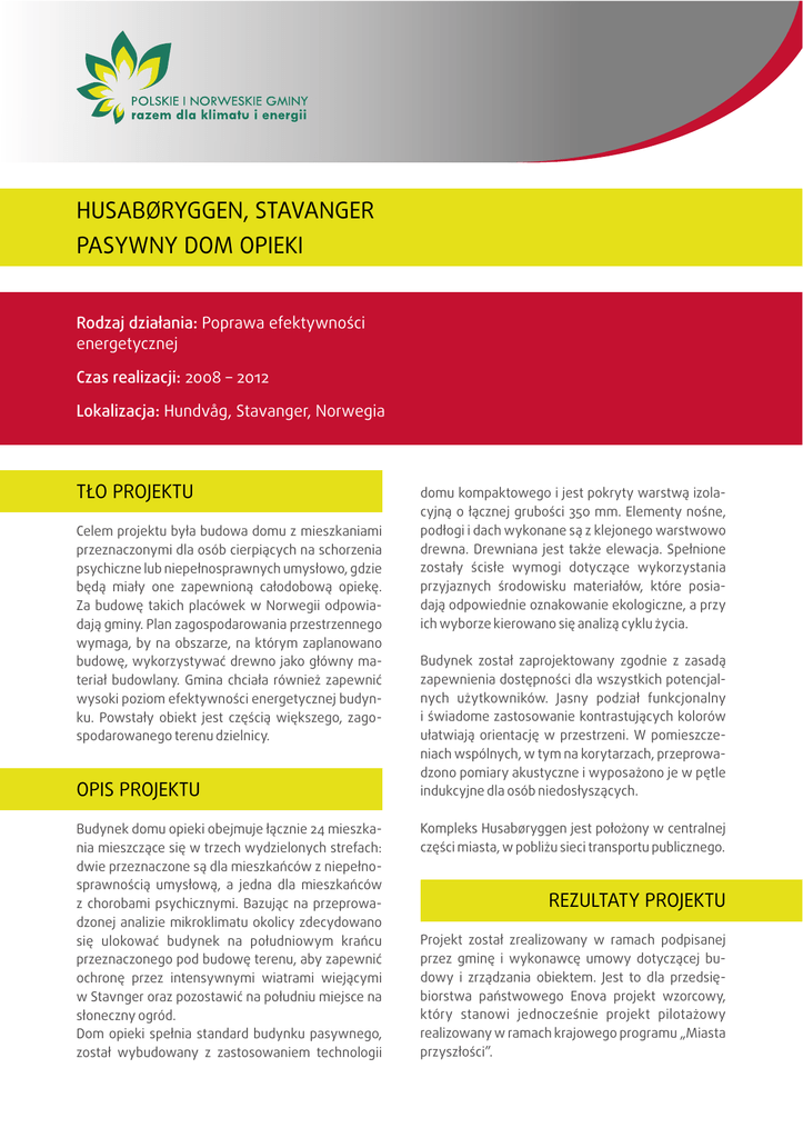 HUSABØRYGGEN, STAVANGER PASYWNY DOM OPIEKI Rodzaj działania: Poprawa efektywności energetycznej Czas realizacji: 2008 – 2012 Lokalizacja: Hundvåg, Stavanger, Norwegia TŁO PROJEKTU Celem projektu była budowa domu z mieszkaniami przeznaczonymi dla osób cierpiących na schorzenia psychiczne lub niepełnosprawnych umysłowo, gdzie będą miały one zapewnioną całodobową opiekę. Za budowę takich placówek w Norwegii odpowiadają gminy. Plan zagospodarowania przestrzennego wymaga, by na obszarze, na którym zaplanowano budowę, wykorzystywać drewno jako główny materiał budowlany. Gmina chciała również zapewnić wysoki poziom efektywności energetycznej budynku. Powstały obiekt jest częścią większego, zagospodarowanego terenu dzielnicy. OPIS PROJEKTU Budynek domu opieki obejmuje łącznie 24 mieszkania mieszczące się w trzech wydzielonych strefach: dwie przeznaczone są dla mieszkańców z niepełnosprawnością umysłową, a jedna dla mieszkańców z chorobami psychicznymi. Bazując na przeprowadzonej analizie mikroklimatu okolicy zdecydowano się ulokować budynek na południowym krańcu przeznaczonego pod budowę terenu, aby zapewnić ochronę przez intensywnymi wiatrami wiejącymi w Stavnger oraz pozostawić na południu miejsce na słoneczny ogród. Dom opieki spełnia standard budynku pasywnego, został wybudowany z zastosowaniem technologii domu kompaktowego i jest pokryty warstwą izolacyjną o łącznej grubości 350 mm. Elementy nośne, podłogi i dach wykonane są z klejonego warstwowo drewna. Drewniana jest także elewacja. Spełnione zostały ścisłe wymogi dotyczące wykorzystania przyjaznych środowisku materiałów, które posiadają odpowiednie oznakowanie ekologiczne, a przy ich wyborze kierowano się analizą cyklu życia. Budynek został zaprojektowany zgodnie z zasadą zapewnienia dostępności dla wszystkich potencjalnych użytkowników. Jasny podział funkcjonalny i świadome zastosowanie kontrastujących kolorów ułatwiają orientację w przestrzeni. W pomieszczeniach wspólnych, w tym na korytarzach, przeprowadzono pomiary akustyczne i wyposażono je w pętle indukcyjne dla osób niedosłyszących. Kompleks Husabøryggen jest położony w centralnej części miasta, w pobliżu sieci transportu publicznego. REZULTATY PROJEKTU Projekt został zrealizowany w ramach podpisanej przez gminę i wykonawcę umowy dotyczącej budowy i zrządzania obiektem. Jest to dla przedsiębiorstwa państwowego Enova projekt wzorcowy, który stanowi jednocześnie projekt pilotażowy realizowany w ramach krajowego programu „Miasta przyszłości”. Dom opieki spełnia standard budynku pasywnego (klasa energetyczna B). Powierzchnia ogrzewana: 2984 m² Zużycie energii: 93,9 kWh/m²/rok Energia dostarczona: 67,4kWh/m²/rok Podstawowe źródło energii: pompa ciepła Dodatkowe/zastępcze źródło energii: energia elektryczna Wykorzystanie drewna zamiast nieodnawialnych materiałów budowlanych oznacza ważny krok w kierunku zmniejszenia globalnego ocieplenia. Zakłada się, że w przyszłości coraz większa będzie rola lasów jako tzw. „rezerwuarów dwutlenku węgla”, który jest magazynowany w drzewach przez cały okres ich wzrostu lub wykorzystania drewna w strukturach i konstrukcjach. Tereny zewnętrzne otaczające kompleks Husabøryggen zostały ukształtowane jako nowoczesny ogród sensoryczny. Stanowią naturalne przedłużenie wspólnych przestrzeni rekreacyjnych wokół domu opieki i wzbogacają codzienne życie mieszkańców i personelu. WIĘCEJ INFORMACJI Strona internetowa projektu: www.arkitektur.no/husaboryggen-medicalhomes OSOBA DO KONTAKTU: Espen Svendsen Gmina Stavanger Wydział ds. funkcjonowania miasta i energii tel. +47 51 50 74 09 e-mail: [email protected]