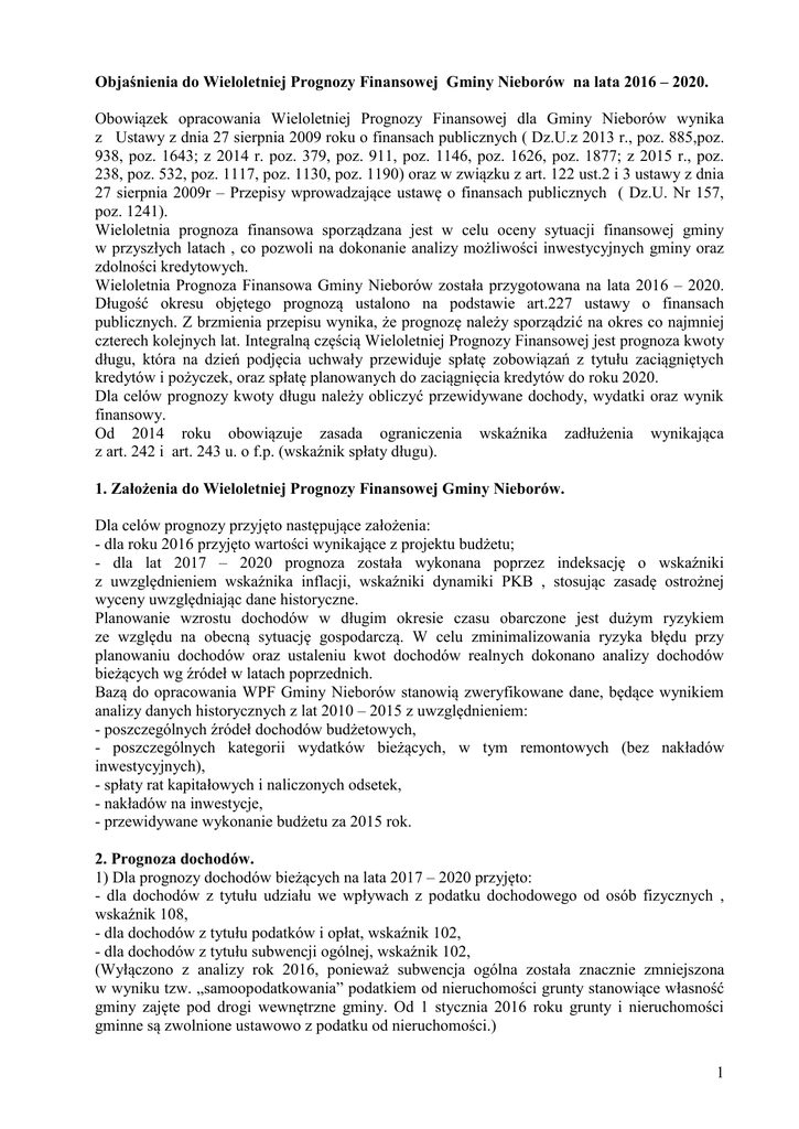 Objaśnienia do Wieloletniej Prognozy Finansowej Gminy Nieborów na lata 2016 – 2020. Obowiązek opracowania Wieloletniej Prognozy Finansowej dla Gminy Nieborów wynika z Ustawy z dnia 27 sierpnia 2009 roku o finansach publicznych ( Dz.U.z 2013 r., poz. 885,poz. 938, poz. 1643; z 2014 r. poz. 379, poz. 911, poz. 1146, poz. 1626, poz. 1877; z 2015 r., poz. 238, poz. 532, poz. 1117, poz. 1130, poz. 1190) oraz w związku z art. 122 ust.2 i 3 ustawy z dnia 27 sierpnia 2009r – Przepisy wprowadzające ustawę o finansach publicznych ( Dz.U. Nr 157, poz. 1241). Wieloletnia prognoza finansowa sporządzana jest w celu oceny sytuacji finansowej gminy w przyszłych latach , co pozwoli na dokonanie analizy możliwości inwestycyjnych gminy oraz zdolności kredytowych. Wieloletnia Prognoza Finansowa Gminy Nieborów została przygotowana na lata 2016 – 2020. Długość okresu objętego prognozą ustalono na podstawie art.227 ustawy o finansach publicznych. Z brzmienia przepisu wynika, że prognozę należy sporządzić na okres co najmniej czterech kolejnych lat. Integralną częścią Wieloletniej Prognozy Finansowej jest prognoza kwoty długu, która na dzień podjęcia uchwały przewiduje spłatę zobowiązań z tytułu zaciągniętych kredytów i pożyczek, oraz spłatę planowanych do zaciągnięcia kredytów do roku 2020. Dla celów prognozy kwoty długu należy obliczyć przewidywane dochody, wydatki oraz wynik finansowy. Od 2014 roku obowiązuje zasada ograniczenia wskaźnika zadłużenia wynikająca z art. 242 i art. 243 u. o f.p. (wskaźnik spłaty długu). 1. Założenia do Wieloletniej Prognozy Finansowej Gminy Nieborów. Dla celów prognozy przyjęto następujące założenia: - dla roku 2016 przyjęto wartości wynikające z projektu budżetu; - dla lat 2017 – 2020 prognoza została wykonana poprzez indeksację o wskaźniki z uwzględnieniem wskaźnika inflacji, wskaźniki dynamiki PKB , stosując zasadę ostrożnej wyceny uwzględniając dane historyczne. Planowanie wzrostu dochodów w długim okresie czasu obarczone jest dużym ryzykiem ze względu na obecną sytuację gospodarczą. W celu zminimalizowania ryzyka błędu przy planowaniu dochodów oraz ustaleniu kwot dochodów realnych dokonano analizy dochodów bieżących wg źródeł w latach poprzednich. Bazą do opracowania WPF Gminy Nieborów stanowią zweryfikowane dane, będące wynikiem analizy danych historycznych z lat 2010 – 2015 z uwzględnieniem: - poszczególnych źródeł dochodów budżetowych, - poszczególnych kategorii wydatków bieżących, w tym remontowych (bez nakładów inwestycyjnych), - spłaty rat kapitałowych i naliczonych odsetek, - nakładów na inwestycje, - przewidywane wykonanie budżetu za 2015 rok. 2. Prognoza dochodów. 1) Dla prognozy dochodów bieżących na lata 2017 – 2020 przyjęto: - dla dochodów z tytułu udziału we wpływach z podatku dochodowego od osób fizycznych , wskaźnik 108, - dla dochodów z tytułu podatków i opłat, wskaźnik 102, - dla dochodów z tytułu subwencji ogólnej, wskaźnik 102, (Wyłączono z analizy rok 2016, ponieważ subwencja ogólna została znacznie zmniejszona w wyniku tzw. „samoopodatkowania” podatkiem od nieruchomości grunty stanowiące własność gminy zajęte pod drogi wewnętrzne gminy. Od 1 stycznia 2016 roku grunty i nieruchomości gminne są zwolnione ustawowo z podatku od nieruchomości.) 1 - dla pozostałych dochodów( niepodatkowe), wskaźnik 101, - dla dochodów z tytułu dotacji, wskaźnik 100 (z uwzględnieniem kwoty dotacji dla przedszkoli), Na 2016 rok przyjęto do projektu budżetu plan dotacji celowej dla przedszkoli ustalony na podstawie ustawy przedszkolnej, która określa limity dotacji na jednego przedszkolaka w 2016 r. w wysokości 1 305,00 zł , oraz na podstawie sprawozdania SIO (System Informacji Oświatowej), w którym na dzień 30.09.2015 r. podana jest liczba przedszkolaków 253, mnożąc przez 1 305,00 zł. stanowi kwotę dotacji 330 165,00 zł. Dotacja została określona dla rozdz. 80103 w wysokości 137 025,00 zł i dla rozdz. 80104 kwota 165 490,00 zł. 2) Dla prognozy dochodów majątkowych uwzględniono: - Uchwały Rady Gminy w sprawie przeznaczenia do sprzedaży mienie gminne: a) Uchwała Nr L/254/2014 Rady Gminy Nieborów z dnia 28.05.2014 r. w sprawie przeznaczenia do sprzedaży działek nr 5 i nr 6 położonych w Karolewie. b) Uchwała Nr V/17/2015 Rady Gminy Nieborów z dnia 30.01.2015 r. w sprawie przeznaczenia do sprzedaży działki położonej w Dzierzgowie, nr 318/2. 3. Prognoza wydatków. Wydatki bieżące budżetu gminy są ograniczane przez dochody bieżące, które odgrywają istotną rolę dla finansów gminy. Zwiększenie wydatków bieżących może nastąpić tylko w przypadku istotnego zwiększenia dochodów bieżących. Dlatego przy prognozowaniu wydatków bieżących zastosowano minimalne wzrosty kwot, ponieważ gmina musi dostosować prognozy budżetu do wymagań wynikających z art. 242 i 243 ustawy o finansach publicznych . Dla prognozy wydatków bieżących przyjęto główne założenie, że musi nastąpić optymalizacja wydatków bieżących. Na 2016 r. założono utrzymanie poziomu wydatków na działalność statutową na poziomie planu roku 2015, uwzględniając zabezpieczenie środków finansowych na sfinansowanie koniecznych remontów. W latach następnych założono niewielki wzrost wydatków bieżących ( głównie minimalizowanie skutków inflacji). W rzeczywistości powinno nastąpić ograniczenie wydatków bieżących. Założenie to przyjęto dla osiągnięcia głównego celu – zwiększania w każdym roku nadwyżki operacyjnej co daje gwarancję dochowania wymogów ustawowych w zakresie możliwości zadłużania się gminy ( przeznaczając kredyty na inwestycje), oraz możliwości spłaty zaciągniętych zobowiązań. Dla obliczenia nominalnych wartości wydatków budżetowych w kolejnych latach prognozy jako podstawę przyjęto wartości ustalone w budżecie na 2016
