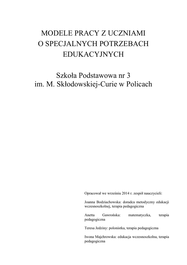 MODELE PRACY Z UCZNIAMI O SPECJALNYCH POTRZEBACH EDUKACYJNYCH Szkoła Podstawowa nr 3 im. M. Skłodowskiej-Curie w Policach Opracował we wrześniu 2014 r. zespół nauczycieli: Joanna Bodziachowska: doradca metodyczny edukacji wczesnoszkolnej, terapia pedagogiczna Anetta Gawrońska: pedagogiczna matematyczka, terapia Teresa Jedziny: polonistka, terapia pedagogiczna Iwona Majchrowska: edukacja wczesnoszkolna, terapia pedagogiczna Zgodnie z Rozporządzeniem MEN z dnia 30 kwietnia 2007 r. w sprawie warunków i sposobu oceniania, klasyfikowania i promowania uczniów i słuchaczy oraz przeprowadzania sprawdzianów i egzaminów w szkołach publicznych (Dz. U. Nr 83, poz. 562, ze zm.) nauczyciel jest obowiązany dostosować wymagania edukacyjne do indywidualnych potrzeb psychofizycznych i edukacyjnych ucznia. Podstawowym celem dostosowania wymagań jest wyrównanie szans edukacyjnych uczniów oraz zapobieganie wtórnym zaburzeniom sfery emocjonalno-motywacyjnej. Dostosowanie polega na modyfikacji procesu edukacyjnego, umożliwiającego uczniom sprostanie wymaganiom. Obszary dostosowania obejmują: – warunki procesu edukacyjnego tj. zasady, metody, formy, środki dydaktyczne, – zewnętrzną organizację nauczania (np. posadzenie ucznia słabosłyszącego w pierwszej ławce), – warunki sprawdzania poziomu wiedzy i umiejętności (metody i formy sprawdzania i kryteria oceniania). UCZEŃ Z DYSLEKSJĄ Ogólne zasady postępowania z uczniem z dysleksją rozwojową: 1. Unikać głośnego odpytywania z czytania przy całej klasie; wskazówka ta dotyczy przede wszystkim dzieci młodszych. Jeśli nauczycielowi dla oceny umiejętności ucznia niezbędne jest głośne czytanie, należy przeprowadzić je na przerwie, po zakończeniu lekcji. 2. Ograniczać czytanie obszernych lektur do rozdziałów istotnych ze względu na omawianą tematykę, akceptować korzystanie z nagrań fonicznych, w wyjątkowych przypadkach z ekranizacji, jako uzupełnienia samodzielnie przeczytanych rozdziałów. 3. Kontrolować stopień zrozumienia samodzielnie przeczytanych przez ucznia poleceń, szczególnie podczas sprawdzianów (wolne tempo czytania, słabe rozumienie jednorazowo przeczytanego tekstu może uniemożliwić wykazanie się wiedzą z danego materiału). 4. Ze względu na wolne tempo czytania lub/i pisania zmniejszyć ilość zadań (poleceń) do wykonania w przewidzianym dla całej klasy czasie lub wydłużyć czas pracy dziecka. Formy te należy stosować zamiennie – uczeń pozostawiony w klasie dłużej niż rówieśnicy, narażony na komentarze z ich strony sam zacznie rezygnować z dodatkowego czasu. 5. Ograniczać teksty do czytania i pisania na lekcji do niezbędnych notatek, których nie ma w podręczniku; jeśli to możliwe dać dziecku gotową notatkę do wklejenia. Zalecenie to jest szczególnie istotne w przypadku dzieci małych lub starszych, u których stwierdzono dysgrafię. 6. Pisemne sprawdziany powinny ograniczać się do sprawdzanych wiadomości, wskazane jest, zatem stosowanie testów wyboru, zdań niedokończonych, tekstów z lukami – pozwoli to uczniowi skoncentrować się na kontrolowanej tematyce, a nie na poprawności pisania. 7. Wskazane jest preferowanie wypowiedzi ustnych. Sprawdzanie wiadomości powinno odbywać się często i dotyczyć krótszych partii materiału. Pytania kierowane do ucznia powinny być precyzyjne. 8. W przedmiotach ścisłych podczas wykonywania ścisłych operacji wymagających wielokrotnych przekształceń, należy umożliwić dziecku ustne skomentowanie wykonywanych działań. W ocenie pracy ucznia wskazane jest uwzględnienie poprawności toku rozumowania, a nie tylko prawidłowości wyniku końcowego. W przypadku prac pisemnych z przedmiotów ścisłych i im pokrewnych, nauczyciel powinien zwrócić uwagę na graficzne rozplanowanie sprawdzianów – pod treścią zadania powinno być wolne miejsce na rozwiązanie. Pozwoli to uniknąć niepotrzebnych pomyłek przy przepisywaniu zadań na inną stronę np. gubienia, mylenia znaków, cyfr, symboli, tak charakterystycznych dla dzieci z dysleksją. Materiał programowy wymagający znajomości wielu wzorów, symboli, przekształceń można podzielić na mniejsze partie. Tam, gdzie jest taka możliwość, pozwolić na korzystanie z gotowych wzorów, tablic itp. 9. Materiał programowy wymagający znajomości wielu wzorów, symboli, przekształceń można podzielić na mniejsze partie. Tam, gdzie jest taka możliwość, pozwolić na korzystanie z gotowych wzorów, tablic itp. 10. Unikać „wyrywania do odpowiedzi”. Jeśli to możliwe uprzedzić ucznia (na przerwie lub na początku lekcji), że będzie dzisiaj pytany. W ten sposób umożliwiamy dziecku przypomnienie wiadomości, skoncentrowaniu się, a także opanowanie zapięcia emocjonalnego często blokującego wypowiedź. 11. Dobrze jest posadzić dziecko blisko nauczyciela, dzięki temu zwiększy się jego koncentracja uwagi, ograniczeniu ulegnie ilość bodźców rozpraszających, wzrośnie bezpośrednia kontrola nauczyciela, bliskość tablicy pozwoli zmniejszyć ilość błędów przy przepisywaniu. 12. Złagodzić kryteria wymagań z języków obcych. Uczeń mający problemy z opanowaniem ojczystego języka prawie zawsze ma trudności z mówieniem, rozumieniem, czytaniem i pisaniem w języku obcym. 13. Podczas oceny prac pisemnych nie uwzględniać poprawności ortograficznej lub oceniać ją opisowo. Należałoby pozwolić uczniom na korzystanie ze słowników ortograficznych podczas pisania wypracowań, prac klasowych. Postępy w zakresie ortografii sprawdzać za pomocą dyktand z komentarzem, okienkiem ortograficznym, pisania z pamięci. Zakres sprawdzianu powinien obejmować jeden rodzaj trudność ortograficznych - umożliwi to skoncentrowanie się na zagadnieniu, tym samym zmniejszając ilość błędów i dając poczucie sukcesu. 14. W przypadku ucznia z dysgrafią wskazane jest akceptowanie pisma drukowanego, pisma na maszynie, komputerze, 