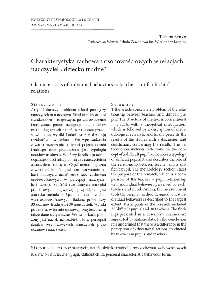 HORYZONTY PSYCHOLOGII, 2013, TOM III ARTYKUŁY NAUKOWE, s. 91-105 Tatiana Senko Państwowa Wyższa Szkoła Zawodowa im. Witelona w Legnicy Charakterystyka zachowań osobowościowych w relacjach nauczyciel-„dziecko trudne” Characteristics of individual behaviors in teacher – ‘difficult child’ relations Streszczenie Artykuł dotyczy problemu relacji pomiędzy nauczycielem a uczniem. Struktura tekstu jest standardowa – rozpoczyna go wprowadzenie teoretyczne, potem następuje opis podstaw metodologicznych badań, a na końcu przedstawione są wyniki badań wraz z dyskusją rezultatów i wnioskami. We wprowadzeniu zawarto rozważania na temat pojęcia ucznia trudnego oraz przytoczona jest typologia uczniów trudnych. Wieńczy je refleksja odnosząca się do roli relacji pomiędzy nauczycielem a „uczniem trudnym”. Część metodologiczna zawiera cel badań – jest nim porównanie relacji nauczyciel-uczeń oraz tzw. zachowań osobowościowych w percepcji nauczyciela i ucznia. Spośród stosowanych narzędzi pomiarowych najszerzej przybliżona jest autorska metoda służąca do badania zachowań osobowościowych. Badana próba liczy 30 uczniów trudnych i 30 nauczycieli. Wyniki podane są w formie opisowej, przytoczone są także dane statystyczne. We wnioskach położony jest nacisk na rozbieżność w percepcji działań wychowawczych nauczycieli przez uczniów i nauczycieli. Summary TThe article concerns a problem of the relationship between teachers and ‘difficult pupils’. The structure of the text is conventional – it starts with a theoretical introduction, which is followed by a description of methodological research, and finally presents the results of the studies with a discussion and conclusions concerning the results. The introduction includes reflections on the concept of a ‘difficult pupil’, and quotes a typology of ‘difficult pupils’. It also describes the role of the relationship between teacher and a ‘difficult pupil’. The methodology section states the purpose of the research, which is a comparison of the teacher – pupil relationship with individual behaviors perceived by each, teacher and pupil. Among the measurement tools the original method designed to test individual behaviors is described to the largest extent. Participants of the research included 30 ‘difficult pupils’ and 30 teachers. The findings presented in a descriptive manner are supported by statistic data. In the conclusion it is underlined that there is a difference in the perception of educational actions conducted by teachers in pupils and teachers. S ł o w a k l u c z o w e: nauczyciel, uczeń, „dziecko trudne”, formy zachowań osobowościowych K e y w o r d s: teacher, pupil, ‘difficult child’, personal characteristic behaviour forms 92 T. Senko, Charakterystyka zachowań osobowościowych w relacjach nauczyciel-„dziecko trudne” HORYZONTY PSYCHOLOGII, 2013, TOM III – ARTYKUŁY NAUKOWE Wprowadzenie Problem relacji nauczyciel-uczeń jest bardzo ważny z punktu widzenia edukacyjnej roli szkoły XXI wieku. Wiele czynników może mieć wpływ na tę relację, jednak warto przyjrzeć się znaczeniu, jaką w tym zakresie odgrywa osobowość oraz tzw. zachowania osobowościowe zarówno nauczyciela, jak i ucznia. Szkoła jest instytucją, w której dziecko spędza dużą ilość czasu, rozwija się i zdobywa w jej ramach nowe umiejętności. Istotne jest, aby proces wzbogacania wiedzy nie był w żaden sposób zakłócany (Chętkowski 2010; Bajan, Żurek 2011; Hamer 1994; Mieszalski 1997; Robertson 1998; Rogers 2006; Szołtysek 2010). Bywają jednakże klasy, w których tworzy się zespół uczniów nieprzystosowanych społecznie. Potrafią oni utrudniać, a czasami nawet uniemożliwiać prowadzenie zajęć dydaktycznych. Zespół ten wciąż pozyskuje nowych członków, którym imponuje niepoprawne zachowanie kolegów, poszerzając w ten sposób grono „uczniów trudnych”. Relacje pomiędzy nauczycielami a tymi uczniami mogą być przyjazne lub wrogie. Nauczyciel dostarczający uczniowi ciągłych przykrości bywa narażony na traktowanie go z ukrytą niechęcią. Z kolei ten, który stale pomaga dzieciom w ich dążeniach, nieustannie dodaje ducha w trakcie pokonywania różnych trudności i wspólnie cieszy się z ich powodzenia, będzie akceptowany i lubiany (Łaski 1999, s. 40). Problem „trudnego ucznia” poddawany jest bardzo ożywionym dyskusjom. Mówiąc o „trudnych uczniach”, mamy na myśli tych uczniów, których cechują niskie osiągnięcia szkolne, niechęć wobec nauczyciela i szkoły, manifestowanie własnej nieograniczonej wolności, zachowania buntownicze. Często zdarza się, że wśród uczniów z problemami znajdują się tacy, którzy mają skomplikowaną sytuację rodzinną czy powikłania zdrowotne. Jedną z głównych przyczyn trudności, jak pokazują najbardziej zaawansowane obecnie techniki neuroobrazowania, jest to, że mózg osób dorastających zmienia się intensywnie. Rozwijają się i wzmacniają połączenia, różnicują się drogi neuronalne, dojrzewają struktury mózgu. Zmiany neuroanatomiczne i metaboliczne stają się podłożem przeobrażeń w tak istotnych sferach, jak: funkcjonowanie poznawcze, ekspresja i kontrola emocji. Równocześnie w okresie adolescencji układ nerwowy człowieka jest szczególnie wrażliwy na urazy, adysfunkcje struktur mózgowych mogą skutkować np. podejmowaniem zachowań nadmiernie ryzykownych lub agresywnych (Daj, Chiu, Hendren 2005). Zadaniem nauczyciela jest zdiagnozowanie i zrozumienie przyczyn trudności w funkcjonowaniu dziecka, a potem podjęcie trudu wspomożenia go w procesie zmian i w realizacji oczekiwań związanych z rolą ucznia i wychowanka. W tym celu niezbędna staje się współpraca z innymi nauczycielami, psychologami, pedagogami, rodzicami bądź opiekunami dziecka. Powodzenie takich działań zależeć może m.in. od charakteru wzajemnych relacji pomiędzy nauczyci
