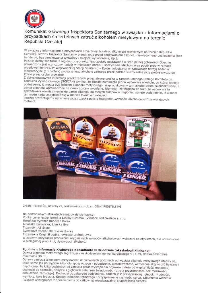 Komunikat Głównego Inspektora Sanitarnego w związku z informacjami o przypadkach śmiertelnych zatruć alkoholem metylowym na terenie Republiki Czeskiej W związku z informacjami o przypadkach Śmiertelnych zatruĆ alkoholem metylowym na terenie Republiki Czeskiej, GłównY InsPektor Sanita_rny przestrzega przed spozywaniem alkoholu niewiadońelo pocnoozenia (bez banderoli, bez oznakowania wytwórcy i miejsca wytworzenia, itp.). Polskie słuŻbY sanitarne z regionu przygranicznego zostały postawione w stan pełnej gotowości, obecnie ProwadzonY jest Wzmozony nadzór w miejscach obrotu i spożywania alkoholu oru, po-ból. prob w ramach urzędowej kontroli. W Wo.1ewódzkie; Stacji Sanitarno - Epidemiologicznej w Katowicach trwają badania |aboratorYjne (13 Próbek) podejrzanego alkoholu zajętego prze, pólskie iłuzby celne p.ry próól" wwozu do przez Polski osoby prywatne, Z dotYchczasowYch informacji przekazanych przez stronę czeską w ramach unijnego Stałego Komitetu ds. Łańcucha ZYwnoŚciowego (SCFCAH) *ynika, że została zamknięia jedna wytwórnia alkoholu, co której istnieje Podejrzenie, iŹ mogła byĆ Źródłem alkoholu metylowego, Wyprodukowany tam alkohol zostai skonfiskowany, a alkoholu wProwadzone Partie na rynek zostały wycofane, Niemniej, ze względu na fakt, że wytwórnia ta sprzedawała równieŻ niewielkie partie alkoholu do małych sklepóń'w regionie, istnieje podejrzenie, iz alkoho| ten moze nadal znajdować się w małych lokalnych sklepach. Ponizej .prezentujemy ujawnione przez czeską po|icję fotografie ,,wyrobów alkoholowych,, zaWierających metanol. Źrodło: Policie ćR. novinky,cz, ceskenoviny,cz, clo,cr, cELNi ńEDITELSTVi Na podrobionych etykietach zna;dowały się napisy: Vodka Lunar extra jemnó a Laśsk! tuzemók; vfrobce Pod Skalkou s, r. o. Meruńka; vlrobce Radovan Borók Albónskó borovićka; Likerka Eva Tuzemók; AB Style Svestkovó vodka; Ostravskó likerka Tuzemók a Originól vodka; vyrobce Likerka Drak W Żadnym przypadku producenci oryginalnych wyrobów alkoholowych wskazani na etykietach, nie uczestnicżyli w nielegalnej produkc;i, dystrybucji alkoholu. Zgodnie z informacją Krajowego Konsultanta w dziedzinie toksykologii klinicznej: Dawka alkoholu metylowego zagrazająca uszkodzeniem nerwu wzrokowego 4-15 ml, dawka śmiertelna minimalna 30 ml. ObjawY zatrucia alkoholem metylowym: W pierwszych godzinach od wypicia alkoholu metylowego objawy są takie same jak Po wyPiciu alkoholu spożywczego - pobudzenie, wesołkowatoSe, wzmózona ur.ivńnosć flzycziai PsYchiczna. Po kilku godzinach od zatrucia (czas wystąpienia objawów zależy od wypitej ilościmetanolu) dochodzi do sennoŚci, Śpiączki igłębokich zaburzeń śwladomośii(utrata przytomności,-bez możliwości dobudzenia zatrutego). Dochodzi do zaburzeń oddychania, oddech jest przyśpieszonv,'giębotl. t,luoności, WYmiotY, bóle brzucha, Spadek ciśnieniatętniczego iprzyspieszenló czynnóści ,"rru','.ibirienia - -- - widzenla (czasem występujące z opóźnieniem) do całkowitej nieodwracalneJ (najczęści";l śr"poiv.