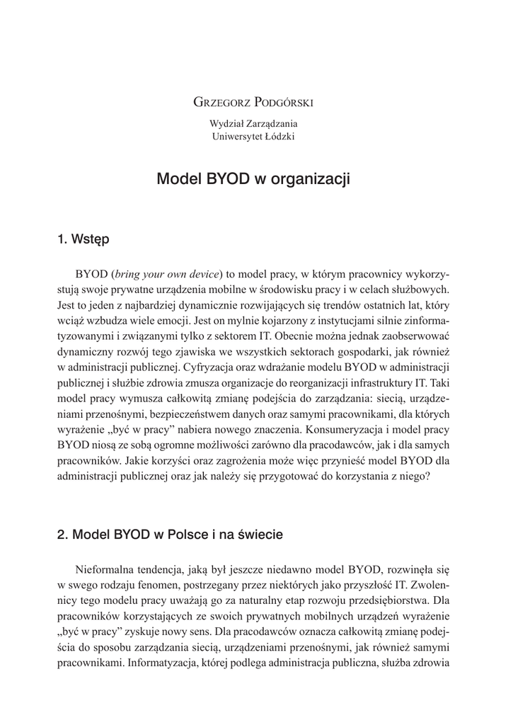 Grzegorz Podgórski Wydział Zarządzania Uniwersytet Łódzki Model BYOD w organizacji 1. Wstęp BYOD (bring your own device) to model pracy, w którym pracownicy wykorzystują swoje prywatne urządzenia mobilne w środowisku pracy i w celach służbowych. Jest to jeden z najbardziej dynamicznie rozwijających się trendów ostatnich lat, który wciąż wzbudza wiele emocji. Jest on mylnie kojarzony z instytucjami silnie zinformatyzowanymi i związanymi tylko z sektorem IT. Obecnie można jednak zaobserwować dynamiczny rozwój tego zjawiska we wszystkich sektorach gospodarki, jak również w administracji publicznej. Cyfryzacja oraz wdrażanie modelu BYOD w administracji publicznej i służbie zdrowia zmusza organizacje do reorganizacji infrastruktury IT. Taki model pracy wymusza całkowitą zmianę podejścia do zarządzania: siecią, urządzeniami przenośnymi, bezpieczeństwem danych oraz samymi pracownikami, dla których wyrażenie „być w pracy” nabiera nowego znaczenia. Konsumeryzacja i model pracy BYOD niosą ze sobą ogromne możliwości zarówno dla pracodawców, jak i dla samych pracowników. Jakie korzyści oraz zagrożenia może więc przynieść model BYOD dla administracji publicznej oraz jak należy się przygotować do korzystania z niego? 2. Model BYOD w Polsce i na świecie Nieformalna tendencja, jaką był jeszcze niedawno model BYOD, rozwinęła się w swego rodzaju fenomen, postrzegany przez niektórych jako przyszłość IT. Zwolennicy tego modelu pracy uważają go za naturalny etap rozwoju przedsiębiorstwa. Dla pracowników korzystających ze swoich prywatnych mobilnych urządzeń wyrażenie „być w pracy” zyskuje nowy sens. Dla pracodawców oznacza całkowitą zmianę podejścia do sposobu zarządzania siecią, urządzeniami przenośnymi, jak również samymi pracownikami. Informatyzacja, której podlega administracja publiczna, służba zdrowia 204 Grzegorz Podgórski oraz sektor edukacyjny, w dużej mierze opierała się na tradycyjnym modelu projektowania infrastruktury IT, który zakłada koncentrację bezpieczeństwa na obrzeżach sieci oraz jawne rozgraniczenie sieci od reszty świata. Zresztą taką samą zasadą kierowały się organizacje komercyjne. W związku z tym taka implementacja w żaden sposób nie radzi sobie ze zjawiskiem BYOD, które zaciera wiele granic. W tych sektorach, gdzie wymiana informacji o stanie zdrowia (HIE’s), wirtualizacja, cloud computing, e-aplikacje, elektroniczne dzienniki, e-nauczanie, e-podręczniki, BYOD oraz sieci bezprzewodowe stają się rzeczywistością, istnieje bardzo duża potrzeba ponownego przemyślenia i przeprojektowania infrastruktury IT, jak również infrastruktury odpowiadającej za bezpieczeństwo IT. Jeśli dodamy do tego zwiększoną liczbę urządzeń prywatnych (zarówno pracowników, jak i pacjentów, petentów, studentów) korzystających z dostępu do informacji oraz usług wewnątrz organizacji, problem staje się jeszcze bardziej naglący. Również na uczelniach wyższych można zaobserwować aktywne wykorzystanie prywatnych urządzeń w głównej mierze przez nauczycieli akademickich. W mniejszym stopniu zjawisko to oddziałuje na jednostki administracji i dziekanaty. Dzieje się tak głównie ze względu na specjalistyczne oprogramowanie, z którego korzystają takie jednostki, jak również na dostęp w dużej mierze do danych osobowych i zamkniętych systemów (dziekanaty). Funkcjonowanie modelu BYOD w sektorze administracji publicznej i na uczelniach wyższych wynika z niedostatku sprzętu lub z faktu, że sprzęt ten jest przestarzały, nie nadaje się do prowadzenia zajęć czy też uniemożliwia wykorzystanie nowoczesnych technologii. Jak pokazują rozwiązania ze świata, wprowadzenie modelu BYOD w takich instytucjach jak szpitale, muzea oraz inne organizacje z sektora publicznego ma wiele zalet. Za przykład może posłużyć holenderskie muzeum Rijksmuseum, które dzięki temu modelowi i mobilnym aplikacjom pozwala na interaktywne zwiedzanie z wirtualnym przewodnikiem na swoim własnym urządzeniu. Innym przykładem z Norwegii jest kompleks leczniczo-badawczo-uniwersytecki w Trondheim. Cały teren, obejmujący 25 hektarów, stanowił wyzwanie w kontekście sprawnego poruszania się nie tylko dla pacjentów czy studentów, ale także dla samych lekarzy. Rozwiązaniem było wprowadzenie modelu BYOD oraz MazeMap, dzięki którym użytkownicy, wykorzystując swoje własne urządzenia mobilne, mogą sprawnie poruszać się po całym kompleksie. W ciągu 3 pierwszych miesięcy skorzystało z tego rozwiązania ponad 10 tys. pacjentów, studentów i pracowników. Jak widać, model ten ma swoje zastosowanie zarówno w firmach komercyjnych, jak i w sektorach publicznych, służbie zdrowia i edukacji. Funkcjonowanie modelu BYOD w sektorze publicznym oraz w sektorze komercyjnym nie różni się bardzo pod względem działania, zalet, wad i zagrożeń. Firmy komercyjne ze względu na swoją dynamikę rozwoju szybciej reagują na tego typu zmiany, wprowadzając wszelkie udogodnienia szybciej niż sektor publiczny. Nie Model BYOD w organizacji 205 oznacza to jednak, iż sam proces wdrożenia czy też zabezpieczenia przed zagrożeniami różni się zasadniczo. Z modelu BYOD korzystają głównie młodzi ludzie w przedziale wiekowym 20–29 lat, uważani za reprezentantów generacji Y. Jest to pokolenie, które aktywnie wykorzystując nowinki technologiczne, korzysta z mediów i technologii cyfrowych. Cechuje je również podejście do pracy zgoła inne niż to, które reprezentowały poprzednie pokolenia. Dużą wagę przywiązują do życia prywatnego, oczekując od pracodawcy swobody i elastycznego czasu pracy1. Według różnych badań przeprowadzanych na całym świecie, trend BYOD staje się coraz bardziej popularny wśród organizacji, nie tylko tych działających w sferze IT. Jak na razie nie przeprowadzono badań stricte odnoszących się do sektora administracji publicznej lub s