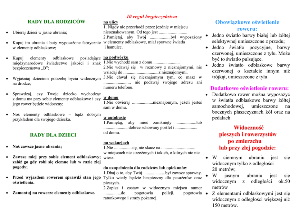 RADY DLA RODZICÓW 10 reguł bezpieczeństwa na ulicy Obowiązkowe oświetlenie 1. Nigdy nie przechodź przez jezdnię w miejscu roweru: nieoznakowanym. Od tego jest ................. ........ Ubieraj dzieci w jasne ubrania; 2.Pamiętaj, aby Twój ...................był wyposażony Jedno światło barwy białej lub żółtej selektywnej umieszczone z przodu; Kupuj im ubrania i buty wyposażone fabrycznie w elementy odblaskowe, miał sprawne światła i hamulce. Jedno światło pozycyjne, barwy w elementy odblaskowe; Kupuj elementy odblaskowe posiadające na podwórku międzynarodowe świadectwo jakości i znak 1.Nie wychodź sam z domu ........................ 2.Nie wdawaj się w rozmowy z nieznajomymi, nie bezpieczeństwa „B”; wsiadaj do ................................z nieznajomymi. Wyjaśniaj dzieciom potrzebę bycia widocznym 3.Nie chwal się nieznajomym tym, co masz w ........................, nie podawaj swojego adresu ani na drodze; numeru telefonu. Sprawdzaj, czy Twoje dziecko wychodząc z domu ma przy sobie elementy odblaskowe i czy w domu 1.Nie otwieraj ...................nieznajomym, jeżeli jesteś jego rower będzie widoczny; sam w domu. Noś elementy odblaskowe – bądź dobrym w autobusie przykładem dla swojego dziecka. 1.Pamiętaj, aby mieć zamknięty ..................lub ....................., dobrze schowany portfel i .................... od domu. RADY DLA DZIECI czerwonej, umieszczone z tyłu. Może być to światło pulsujące. Jedno światło odblaskowe barwy czerwonej o kształcie innym niż trójkąt, umieszczone z tyłu. Dodatkowe oświetlenie roweru: Dodatkowo rower można wyposażyć w światła odblaskowe barwy żółtej samochodowej, umieszczone na bocznych płaszczyznach kół oraz na pedałach. Widoczność pieszych i rowerzystów po zmierzchu lub przy złej pogodzie: na wakacjach 1.Nie ................się, nie skacz na ............................... w miejscach nie strzeżonych i takich, o których nic nie Zawsze miej przy sobie element odblaskowy; wiesz. W ciemnym ubraniu jest się załóż go gdy robi się ciemno lub w razie złej widocznym tylko z odległości pogody; do uzupełnienia dla rodziców lub opiekunów 20 metrów; 1.Dbaj o to, aby Twój ....................był zawsze sprawny. jasnym ubraniu jest się Przed wyjazdem rowerem sprawdź stan jego Tylko wtedy będzie bezpieczny dla pasażerów oraz W widocznym z odległości ok.50 oświetlenia. pieszych. metrów 2.Zapisz i zostaw w widocznym miejscu numer Zamontuj na rowerze elementy odblaskowe. ................do pogotowia policji, pogotowia Z elementami odblaskowymi jest się ratunkowego i straży pożarnej. widocznym z odległości większej niż Noś zawsze jasne ubrania; 150 metrów. „Dziecko w wieku do lat 15, poruszające się po drodze po zmierzchu poza obszarem zabudowanym, jest obowiązane używać elementów odblaskowych w sposób widoczny dla innych uczestników ruchu” Ustawa Prawo o ruchu drogowym Nawet, jeśli masz więcej niż 15 lat, noś elementy odblaskowe – DAJ SZANSĘ KIEROWCY NIE RYZYKUJ BĄDŹ OSTROŻNY WAŻNE TELEFONY POLICJA STRAŻ POŻARNA POGOTOWIE STRAŻ MIEJSKA NUMER ALARMOWY 997 998 999 986 112 „Kierujący rowerem, korzystając z drogi dla rowerów i pieszych jest obowiązany zachowywać szczególną ostrożność wobec pieszych i ustąpić im pierwszeństwa” KIEROWCY HULAJNOGI 1. Nie bądź piratem drogowym – twoja hulajnoga wygląda, co prawda niegroźnie, ale jeśli wjedziesz na kogoś, możesz solidnie go poturbować. 2. Przed sklepem parkuj swój pojazd tak, aby wychodzący nie potykali się o niego. 3. Hulajnogę zostawiaj w szatni – do poruszania się po szkolnych korytarzach używaj własnych nóg. Wyobraź sobie, jaki korek powstałby, gdyby wszyscy chcieli jeździć w szkole na hulajnogach. 4. Składaj swoją hulajnogę i chowaj tak, aby zajmowała jak najmniej miejsca. 5. Jeśli jesteś wielbicielem dużych prędkości i skomplikowanych ewolucji – na sportowe wyczyny wybieraj miejsca, gdzie nikomu nie będą zagrażać twoje akrobacje. Odradzamy zjeżdżanie po schodach w domu i pędzenie z nadmierną prędkością po zatłoczonym chodniku. 6. Pamiętaj o kasku i ochraniaczach na kolana, jeśli zamierzasz poszaleć na swojej hulajnodze. 7. Dbaj o swoją hulajnogę. Przede wszystkim używaj jej zgodnie z zaleceniami producenta, a wtedy będziesz jeździł na niej bardzo długo. Bezpieczni – JA, TY, MY Odblaskowa „DWÓJKA” CHROŃMY SWOJE ŻYCIE TO, że TY widzisz samochód wcale nie oznacza, że jego kierowca widzi Ciebie Publiczna Szkoła Podstawowa nr 2 im. Mikołaja Kopernika w Dąbrowie Tarnowskiej Broszurka opracowana przez koordynatorów akcji „Odblaskowa szkołą”