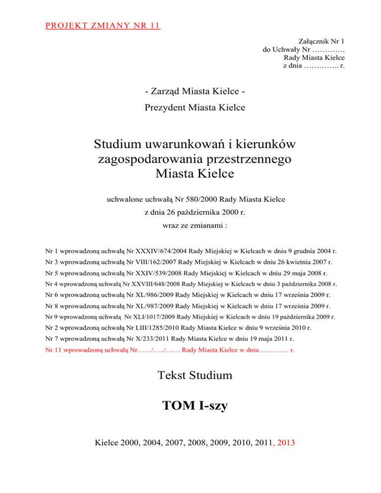 PROJEKT ZMIANY NR 11 Załącznik Nr 1 do Uchwały Nr …………. Rady Miasta Kielce z dnia ………….. r. - Zarząd Miasta Kielce Prezydent Miasta Kielce Studium uwarunkowań i kierunków zagospodarowania przestrzennego Miasta Kielce uchwalone uchwałą Nr 580/2000 Rady Miasta Kielce z dnia 26 października 2000 r. wraz ze zmianami : Nr 1 wprowadzoną uchwałą Nr XXXIV/674/2004 Rady Miejskiej w Kielcach w dniu 9 grudnia 2004 r. Nr 3 wprowadzoną uchwałą Nr VIII/162/2007 Rady Miejskiej w Kielcach w dniu 26 kwietnia 2007 r. Nr 5 wprowadzoną uchwałą Nr XXIV/539/2008 Rady Miejskiej w Kielcach w dniu 29 maja 2008 r. Nr 4 wprowadzoną uchwałą Nr XXVIII/648/2008 Rady Miejskiej w Kielcach w dniu 3 października 2008 r. Nr 6 wprowadzoną uchwałą Nr XL/986/2009 Rady Miejskiej w Kielcach w dniu 17 września 2009 r. Nr 8 wprowadzoną uchwałą Nr XL/987/2009 Rady Miejskiej w Kielcach w dniu 17 września 2009 r. Nr 9 wprowadzoną uchwałą Nr XLI/1017/2009 Rady Miejskiej w Kielcach w dniu 19 października 2009 r. Nr 2 wprowadzoną uchwałą Nr LIII/1285/2010 Rady Miasta Kielce w dniu 9 września 2010 r. Nr 7 wprowadzoną uchwałą Nr X/233/2011 Rady Miasta Kielce w dniu 19 maja 2011 r. Nr 11 wprowadzoną uchwałą Nr……/…../…… Rady Miasta Kielce w dniu ………… r. Tekst Studium TOM I-szy Kielce 2000, 2004, 2007, 2008, 2009, 2010, 2011, 2013 Studium uwarunkowań i kierunków zagospodarowania przestrzennego Miasta Kielce zostało przyjęte Uchwałą nr 580/2000 Rady Miejskiej w Kielcach z dnia 26 października 2000 r., a nastepnie zmienione Uchwałą Nr XXXIV/674/2004 Rady Miejskiej w Kielcach z dnia 9 grudnia 2004 r. (zmiana nr 1 Studium uwarunkowań i kierunków zagospodarowania przestrzennego Miasta Kielce nie wprowadzająca zmian do tomu I), Uchwałą Nr VIII/162/2007 Rady Miejskiej w Kielcach z dnia 26 kwietnia 2007 r. (zmiana nr 3 Studium uwarunkowań i kierunków zagospodarowania przestrzennego Miasta Kielce), Uchwałą Nr XXIV/539/2008 Rady Miejskiej w Kielcach z dnia 29 maja 2008 r. (zmiana nr 5 Studium uwarunkowań i kierunków zagospodarowania przestrzennego Miasta Kielce), Uchwałą Nr XXVIII/648/2008 Rady Miejskiej w Kielcach z dnia 3 paxdziernika 2008 r. (zmiana nr 4 Studium uwarunkowań i kierunków zagospodarowania przestrzennego Miasta Kielce), Uchwałą Nr XL/987/2009 Rady Miejskiej w Kielcach z dnia 17 września 2009 r. (zmiana nr 6 Studium uwarunkowań i kierunków zagospodarowania przestrzennego Miasta Kielce), Uchwałą Nr XL/987/2009 Rady Miejskiej w Kielcach z dnia 17 września 2009 r. (zmiana nr 8 Studium uwarunkowań i kierunków zagospodarowania przestrzennego Miasta Kielce) oraz Uchwałą Nr XLI/1017/2009 Rady Miejskiej w Kielcach z dnia 19 października 2009 r. (zmiana nr 9 Studium uwarunkowań i kierunków zagospodarowania przestrzennego Miasta Kielce). W dniu 20 października 2005 r. Rada Miejska w Kielcach podjęła Uchwałę nr LI/965/2005 w sprawie przystąpienia do zmiany nr 2 Studium uwarunkowań i kierunków zagospodarowania przestrzennego miasta Kielce. Zmiana nr 2 Studium uwarunkowań i kierunków zagospodarowania przestrzennego miasta Kielce dotyczy terenu w południowo-wschodniej części miasta – „Dyminy” (w rejonie ulic Ściegiennego, Kalinowej, Sukowskiej – do granic administracyjnych miasta). Wszelkie uzupełnienia i zmiany w tekście oraz na załączniku graficznym odnoszą się wyłącznie do tego obszaru. Z tego teŜ powodu w przedmiotowej zmianie Studium nie wpisywano ograniczeń jakie mogą wynikać dla tego terenu z tytułu połoŜenia w odległości około 1 km od obszaru NATURA 2000. W celu dostosowania dokumentu studium do aktualnych przepisów, dopisane zostały dla obszaru objętego zmianą ustalenia zgodnie z wymogami Ustawy o planowaniu i zagospodarowaniu przestrzennym z dnia 27 marca 2003 r. oraz przepisami szczególnymi. -2- SPIS TREŚCI TOM I ZAŁOśENIA METODYCZNE I DANE OGÓLNE............................................................................. 5 I-1. USTAWOWY ZAKRES STUDIUM UWARUNKOWAŃ I KIERUNKÓW ZAGOSPODAROWANIA ........ PRZESTRZENNEGO GMINY ........................................................................................................................... 5 I-2. PODSTAWY FORMALNO - PRAWNE OPRACOWANIA STUDIUM .............................................. 7 I-3. PRZEBIEG PRAC NAD STUDIUM .............................................................................................. 7 I-4. ELEMENTY OPRACOWANIA ................................................................................................... 9 I-5. ZESPÓŁ AUTORSKI ............................................................................................................... 11 II. UWARUNKOWANIA ZEWNĘTRZNE DO KSZTAŁTOWANIA KIERUNKÓW I POLITYKI ZAGOSPODAROWANIA PRZESTRZENNEGO MIASTA KIELCE .................... 14 POŁOśENIE I POWIĄZANIA Z OTOCZENIEM .......................................................................... 14 UWARUNKOWANIA ZWIĄZANE Z PEŁNIENIEM FUNKCJI OŚRODKA METROPOLITALNEGO I SUBREGIONALNEGO, ................................................................................................................................. 15 II-3. UWARUNKOWANIA ZWIĄZANE Z KIERUNKAMI POLITYKI PRZESTRZENNEJ PAŃSTWA NA TERENIE MIASTA I W JEGO OTOCZENIU ..................................................................................................... 16 II-4. MIEJSCE KIELC W SYSTEMIE TERENÓW CHRONIONYCH REGIONU ŚWIĘTOKRZYSKIEGO .... 19 II-1. II-2. III. UWARUNKOWANIA WEWNĘTRZNE DO KSZTAŁTOWANIA KIERUNKÓW ZAGOSPODAROWANIA PRZESTRZENNEGO I POLITYKI PRZESTRZENNEJ MIASTA KIELCE .................................................................................................................................................. 21 III-1. UWARUNKOWANIA WYNIKAJĄCE ZE STANU ŚRODOWISKA PRZYRODNICZEGO, ORAZ ROLNICZEJ PRZESTRZENI PRODUKCYJNEJ. ............................................................................