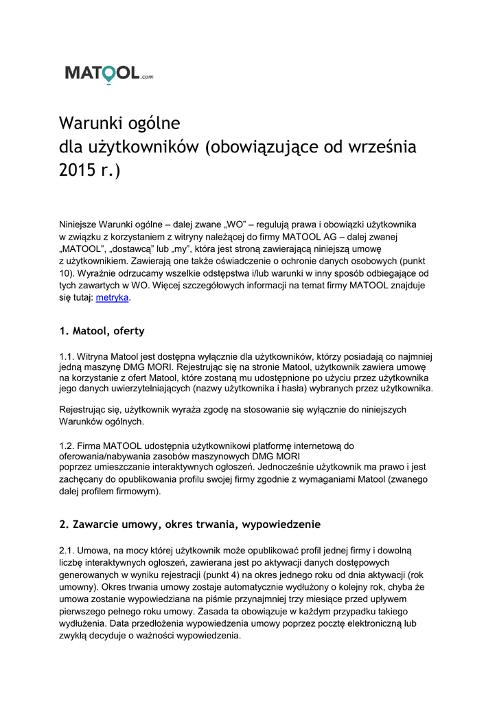Warunki ogólne dla użytkowników (obowiązujące od września 2015 r.) Niniejsze Warunki ogólne – dalej zwane „WO” – regulują prawa i obowiązki użytkownika w związku z korzystaniem z witryny należącej do firmy MATOOL AG – dalej zwanej „MATOOL”, „dostawcą” lub „my”, która jest stroną zawierającą niniejszą umowę z użytkownikiem. Zawierają one także oświadczenie o ochronie danych osobowych (punkt 10). Wyraźnie odrzucamy wszelkie odstępstwa i/lub warunki w inny sposób odbiegające od tych zawartych w WO. Więcej szczegółowych informacji na temat firmy MATOOL znajduje się tutaj: metryka. 1. Matool, oferty 1.1. Witryna Matool jest dostępna wyłącznie dla użytkowników, którzy posiadają co najmniej jedną maszynę DMG MORI. Rejestrując się na stronie Matool, użytkownik zawiera umowę na korzystanie z ofert Matool, które zostaną mu udostępnione po użyciu przez użytkownika jego danych uwierzytelniających (nazwy użytkownika i hasła) wybranych przez użytkownika. Rejestrując się, użytkownik wyraża zgodę na stosowanie się wyłącznie do niniejszych Warunków ogólnych. 1.2. Firma MATOOL udostępnia użytkownikowi platformę internetową do oferowania/nabywania zasobów maszynowych DMG MORI poprzez umieszczanie interaktywnych ogłoszeń. Jednocześnie użytkownik ma prawo i jest zachęcany do opublikowania profilu swojej firmy zgodnie z wymaganiami Matool (zwanego dalej profilem firmowym). 2. Zawarcie umowy, okres trwania, wypowiedzenie 2.1. Umowa, na mocy której użytkownik może opublikować profil jednej firmy i dowolną liczbę interaktywnych ogłoszeń, zawierana jest po aktywacji danych dostępowych generowanych w wyniku rejestracji (punkt 4) na okres jednego roku od dnia aktywacji (rok umowny). Okres trwania umowy zostaje automatycznie wydłużony o kolejny rok, chyba że umowa zostanie wypowiedziana na piśmie przynajmniej trzy miesiące przed upływem pierwszego pełnego roku umowy. Zasada ta obowiązuje w każdym przypadku takiego wydłużenia. Data przedłożenia wypowiedzenia umowy poprzez pocztę elektroniczną lub zwykłą decyduje o ważności wypowiedzenia. 2.2. Dostawca zastrzega sobie prawo do uzależnienia aktywowania danych do logowania oraz rozpoczęcia umowy od zebrania minimalnej liczby użytkowników na danym terytorium. 2.3. Użytkownik może sprawdzić bieżące terytoria objęte umowami na formularzu Terytoria umowy; ceny obowiązujące na danym terytorium znajdują się w Cenniku. 2.4. Firma Matool ma prawo rozwiązać umowę zawartą z użytkownikiem bez wcześniejszego wypowiedzenia oraz uniemożliwić dostęp do witryny ze skutkiem natychmiastowym, jeśli zachodzi uzasadnione podejrzenie, że użytkownik nie będzie wywiązywać się z umowy, zwłaszcza jeśli użytkownik dopuści się celowego naruszenia warunków umowy lub obowiązującego prawa. 2.5. Każda ze Stron ma prawo do rozwiązania umowy z uzasadnionej przyczyny. 3. Rejestracja 3.1. W momencie rejestracji użytkownik zobowiązany jest do podania dokładnych i pełnych informacji, zwłaszcza nazwy firmy, adresu z ulicą, kodem pocztowym, miejscowością i krajem, imienia, płci (do celów wyboru odpowiedniego powitania we wiadomościach), telefonu, adresu e-mail oraz danych konta bankowego. Firma Matool ma prawo zażądać od użytkownika niezwłocznego przesłania dokumentów potwierdzających te dane. 3.2. Podczas okresu trwania niniejszej umowy dostawca jest zobowiązany przechowywać wszystkie informacje przekazane przez użytkownika, zwłaszcza w punkcie 3.1 oraz wszystkie dokumenty przesłane wcześniej przez użytkownika. Niezbędne zmiany można wprowadzić, używając funkcji dostarczanych przez Matool. 3.3. Użytkownik ponosi wyłączną odpowiedzialność za dane podane podczas rejestracji oraz inne przekazane w związku z rejestracją. Użytkownik oświadcza, że dane te są prawdziwe. Podanie błędnych danych może spowodować rozwiązanie umowy bez wypowiedzenia oraz natychmiastowe zablokowanie dostępu do witryny. 4. Dane do logowania 4.1. Obowiązuje zakaz ujawniania danych do logowania stronie trzeciej. Dopuszcza się ujawnienie takich danych pracownikom użytkownika do celów służbowych, jednakże wcześniej należy się upewnić, że pracownicy ci będą stosować się do Warunków ogólnych. 4.2. Użytkownik powinien wybrać maksymalnie bezpieczne hasło oraz we własnym interesie podjąć niezbędne środki, aby je chronić przed nieautoryzowanym dostępem. 4.3. Użytkownik zobowiązany jest do niezwłocznego poinformowania centrum obsługi Matool, jeśli odnosi wrażenie, że jego konto jest używane przez osobę nieupoważnioną. W razie uzasadnionego podejrzenia nieupoważnionego użycia danych dostępowych użytkownika firma Matool zastrzega sobie prawo do podjęcia niezbędnych środków, w szczególności do zawieszenia lub uniemożliwienia dostępu do konta. Jeśli osoba trzecia korzysta z danych uwierzytelniających użytkownika z winy użytkownika, będzie on zobowiązany do poniesienia kosztów szkód oraz wszelkich opłat za takie użycie. 5. Informacje i komunikacja 5.1. Użytkownik będzie regularnie informowany o udogodnieniach dotyczących użytkowania Matool, szczególnie za pośrednictwem biuletynów oraz codziennych wiadomości e-mail. W momencie rejestracji oraz akceptując ważność niniejszych Warunków ogólnych użytkownik tym samym wyraża zgodę na otrzymywanie ofert promocyjnych, np. w treści biuletynu. Poza tym w razie wszelkich pytań użytkownik może zwrócić się do centrum obsługi. Użytkownik będzie otrzymywać takie informacje głównie pocztą elektroniczną, jeśli podał adres e-mail. 6. Sposób użycia 6.1. Matool podejmuje wszelkie wysiłki, aby zapobiec ograniczeniu, pogorszeniu jakości lub przerwie w dostępie lub innym limitom w użytkowaniu witryny w miarę swoich możliwości technicznych. Jednakże w związku z naturą takich technologii komunikacji firma Matool nie