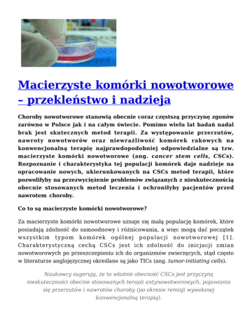 Macierzyste komórki nowotworowe – przekleństwo i nadzieja Choroby nowotworowe stanowią obecnie coraz częstszą przyczynę zgonów zarówno w Polsce jak i na całym świecie. Pomimo wielu lat badań nadal brak jest skutecznych metod terapii. Za występowanie przerzutów, nawroty nowotworów oraz niewrażliwość komórek rakowych na konwencjonalną terapię najprawdopodobniej odpowiedzialne są tzw. macierzyste komórki nowotworowe (ang. cancer stem cells, CSCs). Rozpoznanie i charakterystyka tej populacji komórek daje nadzieje na opracowanie nowych, ukierunkowanych na CSCs metod terapii, które pozwoliłyby na przezwyciężenie problemów związanych z nieskutecznością obecnie stosowanych metod leczenia i ochroniłyby pacjentów przed nawrotem choroby. Co to są macierzyste komórki nowotworowe? Za macierzyste komórki nowotworowe uznaje się małą populację komórek, które posiadają zdolność do samoodnowy i różnicowania, a więc mogą dać początek wszystkim typom komórek ogólnej populacji nowotworowej [1]. Charakterystyczną cechą CSCs jest ich zdolność do inicjacji zmian nowotworowych po przeszczepieniu ich do organizmów zwierzęcych, stąd często w literaturze anglojęzycznej określane są jako TICs (ang. tumor-initiating cells). Naukowcy sugerują, że to właśnie obecność CSCs jest przyczyną nieskuteczności obecnie stosowanych terapii antynowotworowych, pojawiania się przerzutów i nawrotów choroby (po okresie remisji wywołanej konwencjonalną terapią). Pierwsze przesłanki wskazujące na istnienie CSCs pochodzą z 1963 roku, kiedy to Bruce i Van der Gaag zaobserwowali, że niewielka liczba komórek mysiego chłoniaka była zdolna do proliferacji in vivo [2]. W latach 90-tych XX wieku naukowcom udało się już wyodrębnić frakcję komórek wykazujących cechy CSCs z ogólnej populacji komórek ostrej białaczki szpikowej (AML). Jedynie niewielka grupa komórek AML, która wykazywała ekspresję markerów CD34+ CD38-, była zdolna do wywołania nowotworu po wprowadzeniu ich do organizmów myszy z wywołanym niedoborem odporności [3,4]. Od tego czasu występowanie CSCs stwierdzono także m.in. w nowotworach prostaty, płuc, jajnika, mózgu, pęcherza moczowego, trzustki, głowy i szyi, jelita grubego, okrężnicy czy wątroby. Skąd się biorą macierzyste komórki nowotworowe? Pochodzenie CSCs pozostaje na chwile obecną kwestią niewyjaśnioną. Jedna z zaproponowanych teorii zakłada, że powstają one w konsekwencji nagromadzenia się licznych mutacji w „normalnych” komórkach macierzystych (ang. normal stem cells, NSCs), bądź w bardziej zróżnicowanych komórkach progenitorowych. Koncepcja ta bazuje na występowaniu pewnych podobieństw pomiędzy CSCs a komórkami macierzystymi, takich jak np. ekspresja markerów, fenotyp komórek czy ich funkcja. Dodatkowo CSCs wykazują (tak jak NSCs) zdolność do asymetrycznego podziału i dają początek dwóm populacjom komórek: jedną z nich stanowią komórki zdolne do samoodnowy i inicjacji nowotworów (tak jak rodzicielska CSC), natomiast druga populacja to komórki, które ulegają jedynie różnicowaniu. Inna teoria sugeruje, że CSCs mogą wywodzić się z dojrzałych komórek somatycznych, które na skutek działania różnych genetycznych i epigenetycznych czynników uległy transróżnicowaniu (ang. transdifferentiation, nieodwracalna przemiana zróżnicowanej komórki jednego typu w inny typ komórki zróżnicowanej) lub odróżnicowaniu (ang. dedifferentiation, wyspecjalizowana, zróżnicowana komórka powraca do stadium niezróżnicowanego) [1, 5]. CSCs a NSCs – podobne ale jednak inne CSCs posiadają część cech wspólnych z NSC, jednak wykazują także pewne swoiste właściwości. Podobieństwo przejawia się nie tylko w zdolności do samoodnowy i różnicowania w różne typy komórek, ale także w niskiej aktywności proliferacyjnej i odporności na działanie czynników, które uszkadzają DNA. Ponadto CSCs wykazują ekspresję markerów powierzchniowych charakterystycznych dla komórek macierzystych jak np. CD24, CD133 czy CD44, a także ekspresję genów zaangażowanych w proces samoodnowy komórek macierzystych (Sox-1, Notch, Oct4). Natomiast swoiste cechy CSCs to zdolność do przerzutowania, czyli migracji komórek z wnętrza guza do innych tkanek oraz oporność na apoptozę m.in. poprzez nadekspresję białek antyapoptotycznych takich jak surwiwina oraz produkcję IL-4 na drodze autokrynnej . Niezwykle ważną cechą CSCs jest odporność zarówno na chemio- jak i radioterapię. Osiągana jest ona m.in. poprzez: utrzymywanie stanu hipoksji, zwiększoną pojemność detoksykacji wewnątrzkomórkowych wolnych rodników, obecność wydajnych mechanizmów odpowiedzialnych za wykrywanie i naprawę uszkodzonego DNA, nadprodukcję transporterów ABC oraz zdolność do unikania nadzoru komórek układu immunologicznego. Nowotworowe komórki macierzyste – nowy cel terapii antynowotworowych Zidentyfikowanie i charakterystyka CSCs ma ogromne znaczenie z punktu widzenia rozumienia biologii nowotworu jak i rozwoju nowych metod terapii ukierunkowanych na te konkretne komórki w celu całkowitej likwidacji zmian nowotworowych. Najprawdopodobniej, CSCs ze względu na swoje właściwości, nie są eliminowane z organizmu podczas stosowania konwencjonalnych metod terapii antynowotworowych. Ich pozostawienie prowadzi w konsekwencji do nawrotu choroby oraz przerzutowania. Na chwilę obecną rozważane są cztery możliwe drogi eliminacji CSCs. Pierwsza z nich zakłada wykorzystanie czynników ukierunkowanych na CSCs, które będą je eliminować w sposób bezpośredni. Dzięki takiemu podejściu w organizmie pozostaną jedynie komórki nowotworowe nie wykazujące cech komórek macierzystych, które w dalszej kolejności mogą ulegać apoptozie, biologicznemu starzeniu czy terminalnemu różnicowaniu. Są one także wrażliwe na chemio- i radioterapię. Druga koncepcja opiera się na