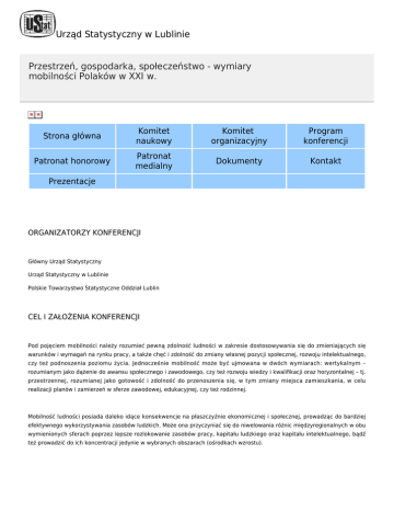 Urząd Statystyczny w Lublinie Przestrzeń, gospodarka, społeczeństwo - wymiary mobilności Polaków w XXI w. Strona główna Komitet naukowy Komitet organizacyjny Program konferencji Patronat honorowy Patronat medialny Dokumenty Kontakt Prezentacje ORGANIZATORZY KONFERENCJI Główny Urząd Statystyczny Urząd Statystyczny w Lublinie Polskie Towarzystwo Statystyczne Oddział Lublin CEL I ZAŁOŻENIA KONFERENCJI Pod pojęciem mobilności należy rozumieć pewną zdolność ludności w zakresie dostosowywania się do zmieniających się warunków i wymagań na rynku pracy, a także chęć i zdolność do zmiany własnej pozycji społecznej, rozwoju intelektualnego, czy też podnoszenia poziomu życia. Jednocześnie mobilność może być ujmowana w dwóch wymiarach: wertykalnym – rozumianym jako dążenie do awansu społecznego i zawodowego, czy też rozwoju wiedzy i kwalifikacji oraz horyzontalnej – tj. przestrzennej, rozumianej jako gotowość i zdolność do przenoszenia się, w tym zmiany miejsca zamieszkania, w celu realizacji planów i zamierzeń w sferze zawodowej, edukacyjnej, czy też rodzinnej. Mobilność ludności posiada daleko idące konsekwencje na płaszczyźnie ekonomicznej i społecznej, prowadząc do bardziej efektywnego wykorzystywania zasobów ludzkich. Może ona przyczyniać się do niwelowania różnic międzyregionalnych w obu wymienionych sferach poprzez lepsze rozlokowanie zasobów pracy, kapitału ludzkiego oraz kapitału intelektualnego, bądź też prowadzić do ich koncentracji jedynie w wybranych obszarach (ośrodkach wzrostu). Waga i znaczenie mobilności ludności znalazły swoje odzwierciedlenie w ramach priorytetów polityki spójności na lata 20142020, stając się jednym z jedenastu celów tematycznych wspierających wzrost gospodarczy (cel 8, jako jeden z 4 celów szczegółowych Europejskiego Funduszu Społecznego). W powszechnej opinii Polacy należą do narodów mało mobilnych. Przeczyć temu zdają się jednak obserwacje dotyczące procesów migracyjnych, w tym przede wszystkim migracji zagranicznych, a także obserwacje dotyczące rynku pracy, czy też rynku edukacji, w tym szkolnictwa wyższego. Mając to na uwadze, zasadniczym celem konferencji jest próba zdiagnozowania oraz oceny mobilności Polaków w wymiarze przestrzennym, gospodarczym i społecznym. W trakcie konferencji poruszone zostaną również następujące zagadnienia: - mobilność ludności w kontekście wyzwań współczesnego rynku pracy - mobilność ludności a procesy konwergencji i dywergencji w poziomie rozwoju społeczno-gospodarczego - mobilność a przekwalifikowania zawodowe - migracje zagraniczne i wewnętrzne - migracje sezonowe, wahadłowe oraz mobilność młodzieży (wyjazd wakacyjne, program Erasmus+) - dojazdy do pracy - mobilność kadry naukowej - dostępność komunikacyjna i dostępność przestrzenna a mobilność ludności - mobilność a edukacja, w tym szkolnictwo wyższe - proces uczenia się przez całe życie - mobilność ludności a mieszkalnictwo (zróżnicowanie przestrzenne liczby mieszkań oddanych do użytkowania, proces suburbanizacji) - rynek nieruchomości w kontekście mobilności ludności - mobilność ludności w kontekście aspiracji społecznych - mobilność ludności a konsekwencje dla relacji społecznych i rodzinnych Zaplanowana konferencja będzie stanowiła ważny element debaty i wymiany poglądów na temat wyzwań stojących przed statystyką publiczną w procesie monitorowania mobilności ludności w kontekście działań i efektów Polityki Spójności UE. Stanie się ona okazją do wymiany poglądów pomiędzy przedstawicielami statystyki publicznej, władz samorządowych, środowiska naukowego oraz przedsiębiorców, jednocześnie przekładając się na integrację ww. środowisk. Konferencja przyczyni się również do zwiększenia obecności statystyki w świadomości publicznej, poprawę jej dostępności oraz pozyskanie przychylności społeczności regionalnej i lokalnej. Stanie się to możliwe dzięki ukazaniu roli i znaczenia statystyki publicznej w działaniach związanych z diagnozą, obserwacją i oceną bieżących procesów społecznych i gospodarczych. TERMIN KONFERENCJI: 26-27 września 2016 r. MIEJSCE KONFERENCJI: Kazimierz Dolny Hotel Król Kazimierz **** ul. Puławska 86 24-120 Kazimierz Dolny tel. 81 880 99 99 fax 81 880 98 98 e-mail: [email protected] ZAKWATEROWANIE: Pensjonat Kazimierski Dwa Księżyce Austeria Kazimierska DOKUMENTY Formularz uczestnictwa