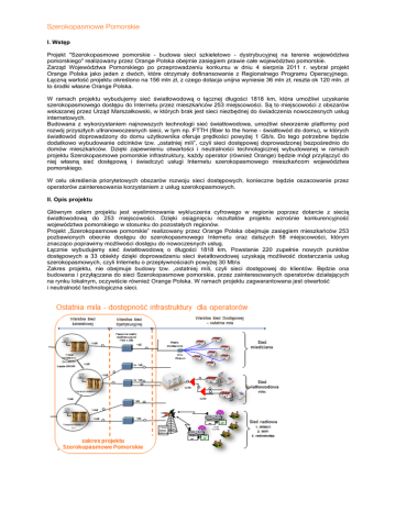 Szerokopasmowe Pomorskie I. Wstęp Projekt "Szerokopasmowe pomorskie - budowa sieci szkieletowo - dystrybucyjnej na terenie województwa pomorskiego" realizowany przez Orange Polska obejmie zasięgiem prawie całe województwo pomorskie. Zarząd Województwa Pomorskiego po przeprowadzeniu konkursu w dniu 4 sierpnia 2011 r. wybrał projekt Orange Polska jako jeden z dwóch, które otrzymały dofinansowanie z Regionalnego Programu Operacyjnego. Łączną wartość projektu określono na 156 mln zł, z czego dotacja unijna wyniesie 36 mln zł, reszta ok 120 mln. zł to środki własne Orange Polska. W ramach projektu wybudujemy sieć światłowodową o łącznej długości 1818 km, która umożliwi uzyskanie szerokopasmowego dostępu do Internetu przez mieszkańców 253 miejscowości. Są to miejscowości z obszarów wskazanej przez Urząd Marszałkowski, w których brak jest sieci niezbędnej do świadczenia nowoczesnych usług internetowych. Budowana z wykorzystaniem najnowszych technologii sieć światłowodowa, umożliwi stworzenie platformy pod rozwój przyszłych ultranowoczesnych sieci, w tym np. FTTH (fiber to the home - światłowód do domu), w których światłowód doprowadzony do domu użytkownika oferuje prędkości powyżej 1 Gb/s. Do tego potrzebne będzie dodatkowo wybudowanie odcinków tzw. „ostatniej mili”, czyli sieci dostępowej doprowadzonej bezpośrednio do domów mieszkańców. Dzięki zapewnieniu otwartości i neutralności technologicznej wybudowanej w ramach projektu Szerokopasmowe pomorskie infrastruktury, każdy operator (również Orange) będzie mógł przyłączyć do niej własną sieć dostępową i świadczyć usługi Internetu szerokopasmowego mieszkańcom województwa pomorskiego. W celu określenia priorytetowych obszarów rozwoju sieci dostępowych, konieczne będzie oszacowanie przez operatorów zainteresowania korzystaniem z usług szerokopasmowych. II. Opis projektu Głównym celem projektu jest wyeliminowanie wykluczenia cyfrowego w regionie poprzez dotarcie z siecią światłowodową do 253 miejscowości. Dzięki osiągnięciu rezultatów projektu wzrośnie konkurencyjność województwa pomorskiego w stosunku do pozostałych regionów. Projekt „Szerokopasmowe pomorskie” realizowany przez Orange Polska obejmuje zasięgiem mieszkańców 253 pozbawionych obecnie dostępu do szerokopasmowego Internetu oraz dalszych 58 miejscowości, którym znacząco poprawimy możliwości dostępu do nowoczesnych usług. Łącznie wybudujemy sieć światłowodową o długości 1818 km, Powstanie 220 zupełnie nowych punktów dostępowych a 33 obiekty dzięki doprowadzeniu sieci światłowodowej uzyskają możliwość dostarczania usług szerokopasmowych, czyli Internetu o przepływnościach powyżej 30 Mb\s Zakres projektu, nie obejmuje budowy tzw. „ostatniej mili, czyli sieci dostępowej do klientów. Będzie ona budowana i przyłączana do sieci Szerokopasmowe pomorskie, przez zainteresowanych operatorów działających na rynku lokalnym, oczywiście również Orange Polska. W ramach projektu zagwarantowana jest otwartość i neutralność technologiczna sieci. Technologicznie, zakres inwestycji polega na rozbudowie istniejącej sieci światłowodowej Orange Polska dzięki czemu możliwe jest dotarcie do tak dużej liczby miejscowości. Sieć światłowodowa układana będzie doziemnie oraz wciągana do istniejących zasobów z wykorzystaniem prawa drogi. . Jako architekturę logiczną dla sieci zaplanowano zastosowanie dwuwarstwowej sieci hierarchicznej, na którą złożą się: sieć szkieletowa (budowana w topologii pierścienia) oraz sieć dystrybucyjna (w topologii drzewa i w miarę wolnych zasobów w topologii pierścienia). Jako medium transmisyjne zastosowany jest światłowód jednomodowy, a zalecany sposób transmisji to transmisja bez wykorzystania zwielokrotnienia falowego w sieci dystrybucyjnej oraz ze zwielokrotnieniem falowym DWDM, CWDM w sieci szkieletowej. Jako protokół transmisyjny zakłada się wykorzystanie IP/ MPLS. a) Warstwa szkieletowa W warstwie szkieletowej planowane jest zastosowanie transmisji z wykorzystaniem zwielokrotnienia falowego (DWDM i CWDM). DWDM jest wielousługową, pojemną platformą transportową umożliwiającą przesyłanie dowolnych sygnałów na duże odległości (dziesiątki, setki, kilometrów). Pozwala ona na jednoczesną, niezależną transmisję wielu (10, 30, 80, 100, …) strumieni optycznych o różnych długościach fali (kanałów optycznych) w jednym włóknie światłowodowym. Dzięki zaimplementowanym mechanizmom zabezpieczeń możliwe jest budowanie niezawodnych uniwersalnych sieci transportowych dużych przepływności. W celu osiągnięcia większej efektywności kosztowej przedsięwzięcia planuje się zastosować również CWDM. CWDM są to proste systemy o małej pojemności: 4,8, rzadko 16 kanałów po max 2,5 Gbit/s, głównie do budowy łączy punkt-punkt lub sieci gwiazdowych. b) Warstwa dystrybucyjna W warstwie dystrybucyjnej sieci planuje się wybudowanie węzłów agregujących IP/MPLS oraz pasywnych szaf zewnątrzbudynkowych. Szafy oraz wyznaczone obiekty ORANGE będą pełniły funkcję punktów styku z siecią. Będą one zapewniały maksymalne zbliżenie się z technologią optotelekomunikacyjną do użytkownika końcowego z jednoczesnym umożliwieniem budowy odcinka dostępowego po światłowodzie Tabela 1 – Wykaz miejscowości, objętych projektem Szerokopasmowe Pomorskie lp MIEJSCOWOŚĆ 1 Rzepnica 2 Udorpie 3 Jasień 4 Kozy 5 Mikorowo 6 Rokity 7 Łubno 8 Borowy Młyn 9 Brzeźno Szlacheckie 10 Zapceń 11 Kamnica 12 Role 13 Słosinko 14 Świerzenko 15 Świerzyno 16 Trzcinno 17 Sominy 18 Czyczkowy 19 Kosobudy 20 Leśno 21 Wielkie Chełmy 22 Zalesie 23 Chojniczki 24 Ciechocin GMINA POWIAT Bytów Czarna Dąbrówka Kołczygłowy Lipnica bytowski Miastko Studzienice chojnicki Brusy Chojnice 25 Krojanty 26 Lichnowy 27 Nowa Cerkiew 28 Nowa Cerkiew Szlachetna 29 Ostrowite 30 Paw