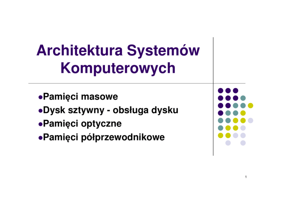 Architektura Systemów Komputerowych Pamięci masowe Dysk sztywny - obsługa dysku Pamięci optyczne Pamięci półprzewodnikowe 1 Pamięci masowe Pamięć masowa to trwała pamięć przeznaczona do długotrwałego przechowywania danych bez konieczności zasilania energią elektryczną. Pamięci masowe odznaczają się zazwyczaj dużo większymi pojemnościami od pamięci operacyjnej komputera. Dostęp do danych w pamięci masowej jest wolniejszy, niż w przypadku pamięci operacyjnej. 2 Pamięci masowe Klasyfikacja nośników pamięci masowych: •Magnetyczne – dyski sztywne, taśma magnetyczna •Optyczne – płyty CD, DVD, HD DVD, Blue-Ray-Disk •Półprzewodnikowe – pamięci FLASH 3 Pamięci masowe Historia rozwoju nośników pamięci masowych: Karta perforowana Taśma magnetyczna Taśma perforowana Źródło: http://pclab.pl/ Dysk elastyczny (dyskietka) 4 Dysk sztywny (twardy) •Dysk sztywny – urządzenie integrujące we wspólnej obudowie magnetyczny nośnik danych w postaci systemu talerzy umieszczonych na jednej osi, układy napędowe oraz sterujące. •Popularna nazwa: dysk twardy, jest używana błędnie, gdyż istotną cechą tego rodzaju dysku jest sztywność talerzy, a nie ich twardość. •Głowice zapisująco-odczytujące unoszą się podczas pracy dysku na poduszce powietrznej nad talerzami. 5 Budowa dysku sztywnego Źródło: http://wwwnt.if.pwr.wroc.pl 6 Parametry dysku sztywnego •Pojemność – obecnie mierzona w gigabajtach (GB) lub terabajtach (TB) •Prędkość obrotowa talerzy – liczba obrotów na minutę, obecnie 5000 do 20000 obr/min •Czas dostępu – czas pomiędzy początkiem wirowania i rozpoczęciem przesyłania danych 7 Połączenie dysku sztywnego z magistralami komputera Płyta główna Bufor transmisji danych Kontroler dysku sztywnego (procesor DSP) 8 Standardy łączenia dysku z systemem mikroprocesorowym •IDE - równoległa magistrala pozwalająca na podłączenie dwóch dysków (master-slave), szybkość transferu danych 504Mb/s. •SCSI - równoległa magistrala, pozwalająca na podłączenie wielu dysków tworzących rodzaj minisieci, komunikacją zarządzają kontrolery SCSI. •SATA – magistrala szeregowa pozwalająca na łatwe łączenie dysku z płytą dzięki wąskim przewodom, szybkość transferu danych 1,5Gb/s (SATA2 – 3Gb/s). 9 Obsługa dysku sztywnego Zadania kontrolera dysku sztywnego •Konwersja formatu danych z magistrali do szeregowej postaci, dającej się zapisać na powierzchni nośnika (RLL) •Konwersja danych odczytanych z dysku do postaci, w jakiej będą wysyłane na magistralę •Dodawanie sum kontrolnych CRC i danych sterujących oraz synchronizujących •Sprzętowa kontrola i korekcja błędów odczytu •Zarządzanie pracą silnika i ruchem głowicy zapisującoodczytującej 10 Obsługa dysku sztywnego Operacje dyskowe składają się z cykli programowania kontrolera dysku sztywnego Fazy cyklu programowania kontrolera: •Przekazania rozkazu •Przekazania danych •końcowa 11 Fizyczna organizacja danych na dysku Ścieżka, sektor, cylinder Źródło: http://www.linuxpl.org 12 System kodowania danych na dysku Dane na dysku magnetycznym są kodowane w postaci ciągu impulsów przemagnesowujących. MFM (Modified Frequency Modulation) – metoda kodowania stosowana na dyskach elastycznych RLL (Run Length Limited) – metoda kodowania danych stosowana na dyskach sztywnych, nie wymagająca sygnału synchronizującego, zapewniająca bardzo dobre upakowanie danych. 13 System kodowania danych na dysku Idea kodowania RLL(2,7) - liczba zer zawiera się zawsze w przedziale od 2 do 7. Wejściowy strumień danych poddawany jest takiemu przekodowaniu, które gwarantuje spełnienie tego wymogu. Kodowanie: Dane wejściowe Dane wyjściowe 000 000100 10 0100 010 100100 0010 00100100 11 1000 011 001000 0011 00001000 14 System kodowania danych na dysku Porównanie MFM i RLL(2,7) 15 Organizacja i tworzenie struktury dysku Partycja - ciągły obszar dysku wykrywany przez system operacyjny jako oddzielny dysk logiczny. Informacja o partycjach jest zapisana w tablicy partycji. Formatowanie niskiego poziomu - proces nanoszenia na powierzchnię dysku ścieżek i sektorów wykonywany fabrycznie podczas produkcji dysku Formatowanie wysokiego poziomu - proces budowania logicznej struktury partycji. Formatowanie nie niszczy poprzedniej zawartości dysku, a jedynie jego logiczną strukturę. 16 Popularne systemy plików FAT (File Allocation Table - tablica alokacji plików) - tablica opisująca, w których klastrach dysku twardego system operacyjny ma szukać danego pliku. Podczas zapisu pliku informacje o nim są automatycznie zachowywane w tablicy FAT. NFS - sieciowy system plików firmy Sun NTFS - system plików z księgowaniem pod Windows NT i nowsze wersje UFS - Unix File System - podstawowy system plików Solarisa 17 Dyskowe pamięci optyczne Idea przechowywania danych na dysku optycznym Pojedyncza ścieżka jest ciągiem wzniesień (land) odbijających podczerwone światło lasera i zagłębień (pit) rozpraszających światło. Ciąg wzniesień i zagłębień koduje dane binarne. Źródło: http://student.agh.edu.pl 18 Rodzaje pamięci optycznych •CD-ROM – płyta o średnicy 120mm. Dane są zapisywane podczas produkcji przez tłoczenie struktury płyty w specjalnej prasie. Pojemność 650 do 700 MB. •CD-R – płyta pozwalająca na jednokrotne zapisanie danych w nagrywarce komputerowej. Dane są zapisywane przez modyfikację właściwości optycznych barwnika pod akrylową powierzchnią płyty wskutek naświetlenia laserem większej mocy niż podczas odczytu. •CD-RW – nośnik do wielokrotnego zapisu danych przez modyfikację odwracalnych zmian właściwości optycznych płyty za pomocą promienia lasera. Pojemność wszystkich technologii CD jest porównywalna. 19 Rodzaje pamięci optycznych •DVD ROM – płyta o średnicy 120mm, jak CD, ale o pojemności 4,7GB. Zwiększoną pojemność uzyskuje się przez