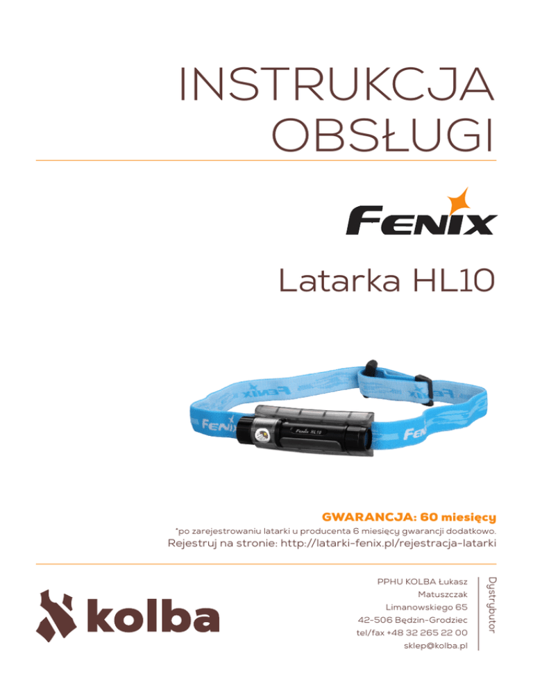 INSTRUKCJA OBSŁUGI Latarka HL10 GWARANCJA: 60 miesięcy *po zarejestrowaniu latarki u producenta 6 miesięcy gwarancji dodatkowo. Rejestruj na stronie: http://latarki-fenix.pl/rejestracja-latarki Matuszczak Limanowskiego 65 42-506 Będzin-Grodziec tel/fax +48 32 265 22 00 [email protected] Dystrybutor PPHU KOLBA Łukasz 2 Zasilanie • 1 × bateria alkaliczna AAA 1,5 V lub akumulator AAA Ni-MH 1,2 V samym poziomie naładowania • Jeżeli latarka nie będzie używana przez dłuższy czas zaleca się wyjęcie baterii, w celu uniknięcia wycieku elektrolitu lub eksplozji baterii Ważne • Na czas transportu oraz dłuższego przechowy- Do latarek nie stosować innych form zasilania niż wania zaleca się odkręcenie pokrywy zasobnika wymienione wyżej. Zwłaszcza wszelkich akumulato- na baterie o pół obrotu, w celu uniknięcia przy- rów o większych napięciach! padkowego włączenia latarki • W przypadku zużycia się lub uszkodzenia uszczel- Uruchomienie latarki ki, należy wymienić ją na nową Przed pierwszym uruchomieniem sprawdź po- • Zaleca się okresowe czyszczenie styków latarki, prawność rodzaju zasilania (w szczególności wysokość zwłaszcza gdy zaczyna ona mrugać lub nie moż- napięcia źródła prądu). Odkręć pojemniki na baterie, znajdujący się pod głowicą i zainstaluj baterię zgodnie na jej włączyć • Nie należy ładować baterii jednorazowych z polaryzacją. Zakręć pokrywę baterii i upewnij się, że jest dobrze dokręcona.Uruchomienie następuje poprzez wciśnięcie i przytrzymanie włącznika głównego znajdującego się na po prawej stronie korpusu. UWAGA! Nie stosowanie się do powyższych zasad może prowadzić do przegrzewania się baterii, a w konsekwencji do wybuchu i uszkodzeniu ciała! Funkcje latarki Latarka HL10 pracuje w trzech trybach. Do prze- Latarka emituje światło o bardzo dużym natę- chodzenia pomiędzy nimi używa się włącznika głów- żeniu, które może powodować uszkodzenie wzro- nego, poprzez jednorazowe naciśnięcie. ku. Nie należy kierować wiązki światła bezpośrednio w stronę oczu. Tryby ciągłe • Eko • Średni • Wysoki W komplecie oprócz latarki znajdują się: • Zapasowe oringi • Pasek • Bateria AAA • Przywieszka do kluczy Uwagi dotyczące użytkowania i konserwacji • Nie należy rozkręcać głowicy, gdyż może to prowadzić do trwałego uszkodzenia latarki i naruszenia warunków gwarancji • Należy unikać przegrzania baterii. Jeżeli korpus latarki jest gorący, należy przełączyć latarkę na niższy tryb lub wyłączyć ją w celu schłodzenia • Należy zawsze używać źródła zasilania tego samego producenta, tego samego rodzaju, o takim 3 KARTA GWARANCYJNA Nazwa towaru Typ Latarka HL10 Numer fabryczny Data sprzedaży Pieczątka i podpis punktu sprzedaży Data przyjęcia Data wydania Opis usterki Pieczęć serwisu 4 WARUNKI GWARANCJI 1. Sprawne urządzenie nie podlega wymianie. 2. Ujawnione w okresie gwarancji wady będą usuwane bezpłatnie w terminie 21 dni roboczych od daty zgłoszenia reklamacji. 3. W przypadku, gdy naprawa wymaga importu części zamiennych z zagranicy termin naprawy może ulec wydłużeniu. przekraczającej zakres normalnych czynności eksploatacyjnych. 7. Gwarancji nie podlegają części obudowy i akcesoria podlegające normalnemu zużyciu w czasie eksploatacji jak zarysowanie, zabrudzenie trudne do usunięcia, wytarcie napisów itp. 8. Gwarancja nie obejmuje materiałów eksploatacyjnych. 4. Niniejszą gwarancją są objęte usterki spowo- 9. Karta gwarancyjna jest ważna po okazaniu dowo- dowane wadliwymi częściami i/lub defektami du zakupu, jeżeli jest ostemplowana przez sprze- produkcyjnymi. dawcę, posiada czytelnie i poprawnie wypełnione 5. Nabywcy przysługuje prawo wymiany sprzętu na nowy, jeżeli w okresie gwarancji upoważniony zakład stwierdzi, że usunięcie wady nie jest możliwe wszystkie rubryki bez zmian i skreśleń. 10.Reklamujący jest zobowiązany dostarczyć urządzenie do punktu sprzedaży. lub zostaną dokonane cztery naprawy przez upo- 11. Ewentualny koszt nieuzasadnionych roszczeń wy- ważniony punkt naprawczy, a sprzęt będzie nadal nikających z warunków gwarancji oraz testowania wykazywał wady uniemożliwiające używanie go zgodnie z przeznaczeniem. 6. N abywc a traci uprawnienia gwarancy jne ponosi Nabywca. 12.W celu przyspieszenia realizacji naprawy gwarancyjnej należy wraz z reklamowanym towarem w przypadku: dostarczyć dokładny opis usterki uwzględniają- • mechanicznego lub termicznego uszkodze- cy w szczególności jej zewnętrzne objawy oraz nia sprzętu, • niewłaściwej eksploat acji (niezgodnej z instrukcją) • n i ew ł a ś c i we g o p r ze c h ow y w a n i a l u b transportowania, • uszkodzeń spowodowanych przez wypad- DOKŁADNY ADRES ZWROTNY wraz z TELEFONEM KONTAKTOWYM. 13.Ewentualne spory związane z realizacją obowiązków gwarancyjnych będą rozstrzygane przez sąd właściwy dla siedziby PPHU Kolba. 14. Zakup urządzenia objętego niniejszą gwarancją jest ki losowe (pożar, wyładowania atmosferycz- równoznaczne z przyjęciem poniższych warunków. ne, zalanie, działanie środków chemicznych 15.Gwarancja na sprzedany towar konsumpcyjny nie oraz okoliczności i sił wyższego rzedu itp.), wyłącza, nie ogranicza, ani nie zawiesza upraw- samowolnej ingerencji nabywcy oraz innych nień kupującego wynikających z niezgodności to- nieuprawnionych osób we wnętrze produktu waru z umową. OŚWIADCZAM, ŻE ZAPOZNAŁEM SIĘ I AKCEPTUJĘ WARUNKI NINIEJSZEJ GWARANCJI _____________________________________________________________________________________________________ PODPIS I DATA PUNKT SERWISU GWARANCYJNEGO I POGWARANCYJNEGO PPHU Kolba udziela niniejszej gwarancji na okres 60 miesięcy licząc od daty sprzedaży. PPHU Kolba Matuszczak Łukasz ul. Limanowskiego 65; 42-506 Będzin-Grodziec tel/fax 32 265 22 00 wew. 24 www.kolba.pl [email protected]