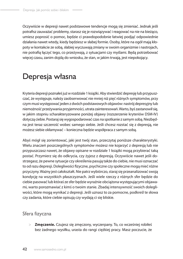 Depresja. Jak pomóc sobie i bliskim Oczywiście w depresji nawet podstawowe tendencje mogą się zmieniać. Jednak jeśli potrafisz zauważać problemy, starasz się je rozwiązywać i reagować na nie na bieżąco, umiesz poprosić o pomoc, będzie ci prawdopodobnie łatwiej podjąć odpowiednie działania nawet wtedy, kiedy będziesz w słabej formie. Osoby, które na ogół mają kłopoty w kontakcie ze sobą, słabiej wyczuwają zmiany w swoim organizmie i nastrojach, nie potrafią łączyć tego, co przeżywają, z sytuacjami czy myślami. Będą potrzebować więcej czasu, zanim dojdą do wniosku, że stan, w jakim trwają, jest niepokojący. Depresja własna Kryteria depresji poznałeś już w rozdziale 1 książki. Aby stwierdzić depresję lub przypuszczać, że występuje, należy zaobserwować nie mniej niż pięć różnych symptomów, przy czym musi występować jeden z dwóch podstawowych objawów: nastrój depresyjny lub niemożność przeżywania przyjemności, utrata zainteresowań. Warto, byś zastanowił się, w jakim stopniu scharakteryzowane poniżej objawy (rozszerzenie kryteriów DSM-IV) dotyczą ciebie. Postaraj się wygospodarować czas na spotkanie z samym sobą. Niezbędna jest teraz szczerość wobec samego siebie. Jeśli chcesz rozstać się z depresją, nie możesz siebie okłamywać – konieczna będzie współpraca z samym sobą. Abyś mógł się zorientować, jaki jest twój stan, przeczytaj poniższe charakterystyki. Wielu znaczeń poszczególnych symptomów możesz nie kojarzyć z depresją lub nie przypuszczasz nawet, że objawy opisane w rozdziale 1 książki mogą przybierać taką postać. Przymierz się do odkrycia, czy żyjesz z depresją. Oczywiście nawet jeśli dostrzegasz, że pewne sytuacje czy określenia pasują także do ciebie, nie musi oznaczać to od razu depresji. Dolegliwości fizyczne, psychiczne czy społeczne mogą mieć różne przyczyny. Ważny jest całokształt. Nie patrz wybiórczo, staraj się przeanalizować swoją kondycję na wszystkich płaszczyznach. Jeśli wiele rzeczy z różnych sfer będzie do ciebie pasować lub któraś ze sfer będzie wyraźnie obciążona występującymi objawami, warto porozmawiać z kimś o twoim stanie. Zbadaj intensywność swoich dolegliwości, które mogą wynikać z depresji. Jeśli uznasz to za pomocne, podkreśl te słowa czy zadania, które ciebie opisują czy wydają ci się bliskie. Sfera fizyczna > Zmęczenie. Czujesz się zmęczony, wyczerpany. To, co wcześniej robiłeś bez żadnego wysiłku, urasta do rangi ciężkiej pracy. Masz poczucie, że 42 www.samosedno.com.pl Rozdział 2. Z depresją twarzą w twarz, czyli co powinno cię zaniepokoić? większość zwykłych obowiązków jest ponad twoje siły i nie potrafisz im sprostać. Odczuwasz większe zmęczenie. Nie masz energii. > Ból ciała. Czujesz dolegliwości fizyczne. Boli cię głowa, kłuje w klatce piersiowej, masz zawroty głowy. Środki przeciwbólowe pomagają na chwilę, potem wszystkie dolegliwości wracają albo zaczyna boleć cię coś innego. Skupiasz się na dolegliwościach ciała. Ciągle w nim coś nie działa poprawnie. > Ociężałość. Odczuwasz ciężar swojego ciała. Zwłaszcza masz poczucie, że twoja głowa jest z ołowiu, nosisz na barkach ogromne brzemię, czujesz przeciążenie w karku i mięśniach, jakbyś dopiero co wrócił z kopalni. > Dolegliwości układu pokarmowego. Odczuwasz mdłości, częste wzdęcia, zaparcia, suchość w ustach, masz bóle brzucha, biegunki. > Kłopoty z apetytem. Nie możesz w siebie nic wcisnąć. Nawet nie czujesz głodu. Jedzenie jakby przestało cię interesować lub wprost przeciwnie, czujesz, że musisz jeść. Objadasz się, nawet nie wiesz, kiedy to się dzieje. Zapychasz jedzeniem przepełniającą cię pustkę. > Utrata zainteresowania seksem. Nie masz ochoty na seks lub jest on dla ciebie nieprzyjemny, unikasz go. Nie masz orgazmu. Trudno ci czuć podniecenie. Seks stracił dla ciebie znaczenie. Zauważasz u siebie impotencję. Nieregularnie miesiączkujesz. > Zaburzenia snu. Nie możesz wstać z łóżka. Wcześnie się wybudzasz i nie możesz zasnąć. Twój sen jest płytki, porwany niczym kartka papieru. Wieczorem, mimo zmęczenia, długo nie zasypiasz. > Lęk w ciele. Masz somatyczne objawy lęku. Występują u ciebie suchość w jamie ustnej, biegunki, wzdęcia, palpitacje serca, duszności, pocenie się, zawroty głowy, nieostre widzenie, częste oddawanie moczu. > Niepokój ruchowy. Nie możesz spokojnie siedzieć, stać, leżeć. Bawisz się palcami, włosami. Nie możesz przebywać w jednym miejscu, chodzisz po pokoju, „nosi cię”. Często wykręcasz ręce, obgryzasz paznokcie, wyrywasz włosy, przygryzasz wargi. Zauważasz u siebie drżenie rąk i nóg. Sfera emocjonalna > Niezadowolenie z życia. Kiedy patrzysz na swoje życie, widzisz prawie same porażki albo długotrwałą stagnację. Miewasz uporczywe myśli o tym, jakie jest ono beznadziejne lub nie widzisz żadnych szans na jego poprawę. Postrzegasz siebie jako nieudacznika. Przez większość czasu czujesz się nieszczęśliwy. 43 Depresja. Jak pomóc sobie i bliskim > Nieadekwatne reakcje emocjonalne. Reagujesz niewspółmiernie do tego, co się dzieje. Mała rzecz wyprowadza cię z równowagi, nagle płaczesz, złościsz się, boisz. Jesteś bardziej nerwowy i przykry niż dawniej. Jesteś stale zdenerwowany. Twoje uczucia i reakcje są jakby przesadzone. Inni nie rozumieją, dlaczego tak zareagowałeś. To, co innych śmieszy, ciebie doprowadza do łez. > Poczucie przytłoczenia uczuciami. Nie możesz opanować przypływu smutku, lęku, poczucia bezradności. Stan ten zaczyna się i nie ma końca. Czasami zmniejsza się, ale ciągle ci towarzyszy, jakby był twoim cieniem. > Brak uczuć. Czujesz się jałowy. Nic cię nie wzrusza, nie możesz wykrzesać z siebie żadnych uczuć. Wszystko jest dla ciebie takie samo, bez sensu, bez wyrazu. Czujesz wszechogarniającą nudę, ob