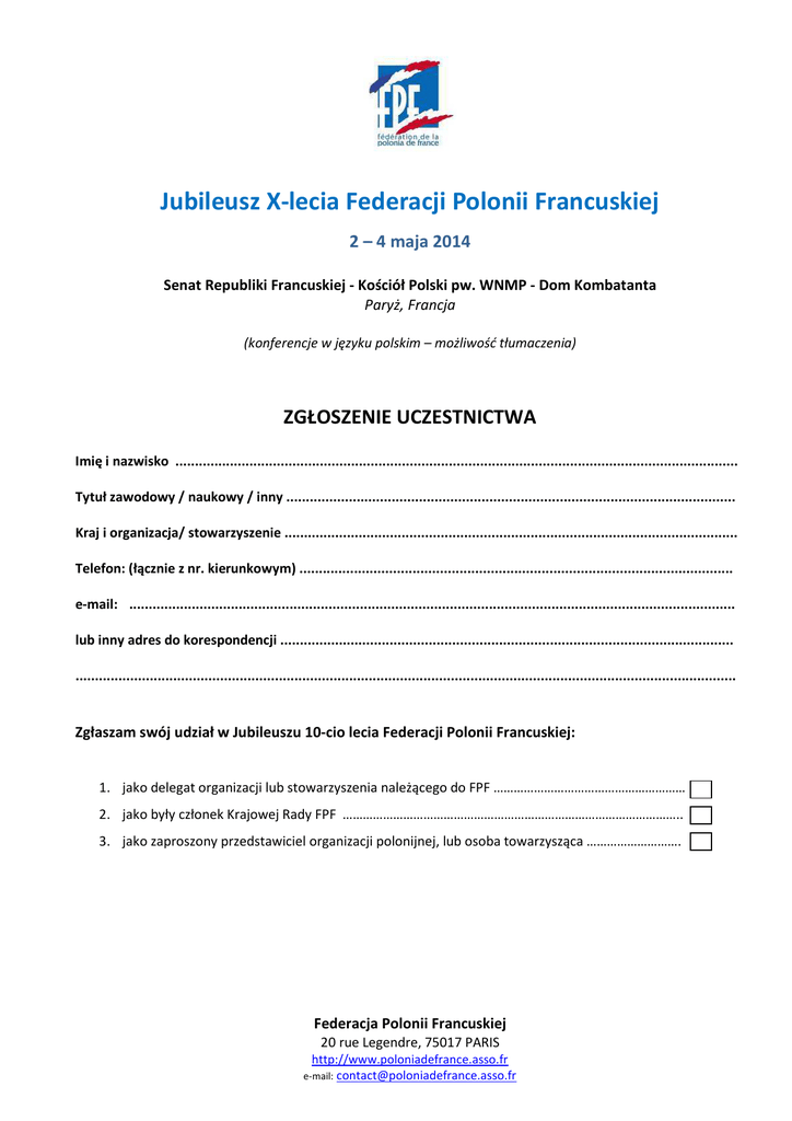 Jubileusz X-lecia Federacji Polonii Francuskiej 2 – 4 maja 2014 Senat Republiki Francuskiej - Kościół Polski pw. WNMP - Dom Kombatanta Paryż, Francja (konferencje w języku polskim – możliwość tłumaczenia) ZGŁOSZENIE UCZESTNICTWA Imię i nazwisko ................................................................................................................................................ Tytuł zawodowy / naukowy / inny ................................................................................................................... Kraj i organizacja/ stowarzyszenie .................................................................................................................... Telefon: (łącznie z nr. kierunkowym) ............................................................................................................... e-mail: ........................................................................................................................................................... lub inny adres do korespondencji .................................................................................................................... ......................................................................................................................................................................... Zgłaszam swój udział w Jubileuszu 10-cio lecia Federacji Polonii Francuskiej: 1. jako delegat organizacji lub stowarzyszenia należącego do FPF ………………………………………………… 2. jako były członek Krajowej Rady FPF ……………………………………………………………………………………….. 3. jako zaproszony przedstawiciel organizacji polonijnej, lub osoba towarzysząca ………………………. Federacja Polonii Francuskiej 20 rue Legendre, 75017 PARIS http://www.poloniadefrance.asso.fr e-mail: [email protected] Jednocześnie deklaruję swój udział w punktach jubileuszu: 2 maja 2014 • • • Święto Polonii (sesja w Senacie Republiki Francuskiej) …………………………..………………………………… Obiad (25 €) ………………………….…………………………………………………………………………………………………. Wieczorny bankiet (40 €) ………………………………………………..……………………………………………………….. 3 maja 2014 • • • Święto Konstytucji 3 Maja 2014 (Kościół Polski na Concorde) …………..…………………….……………… Obiad (25 €) ……………………..…………………………………………………………………………………………………..… Zwiedzanie wystawy oraz koncert w Domu Kombatanta ………………………..………………………………. • • 2-godzinne zwiedzanie poloników w Paryżu autokarem (10 €) ………………………………………..……… Wieczorna kolacja na statku lub w wybranej restauracji na Montmartre (55 €) .…….………………. lub 4 maja 2014 • • • Uroczystość zakończenia Jubileuszu w Domu Kombatanta ……………………………………………………….. Obiad (20 €) ………………………………………………………………………………………………………………………………. Uroczystość składania wieńców pod Łukiem Triumfalnym w Paryżu (godz. 17h30)……………….….. Prosimy o zaznaczenie wybranych przez Państwa manifestacji i o dokonanie odpowiedniej wpłaty w terminie do dnia 31.03.2014. Wpłata dokonana być może na poniższe konto bankowe przelewem lub uiszczona czekiem z banku francuskiego na korzyść FPF. W specjalnych wyjątkach, uregulowanie opłat możliwe będzie także na miejscu (prosimy o zaznaczenie tego na zgłoszeniu). FPF - 20 rue Legendre, 75017 Paris, France Crédit Mutuel - CCM Paris 17 ETOILE 75017 PARIS Compte : 0002044101 89 IBAN FR76 1027 8060 4700 0200 4410 189 BIC (SWIFT) CMCIFR2A Wypełnioną kartę zgłoszenia należy przesłać: na adres e-mail: [email protected] lub zwykłą pocztą na adres siedziby FPF . Ostateczny termin przyjmowania zgłoszeń: 10 kwietnia 2014 r. Koszty podróży, oraz rezerwacja i opłata hoteli we własnym zakresie. Polecamy tanie noclegi 35 €/noc ze śniadaniem w Polskim Seminarium (10 miejsc). Adres, 11 rue Jules Guesde; 92130 Issy-lesMoulineaux: tel.: +33-1.46.45.79.79. Miejsca są zarezerwowane na trzy noce tj. 1/2-2/3-3/4 maja 2014. Jednocześnie można skorzystać z ośrodka Jana Pawła II-go, prowadzonego przez Ojców Pallotynów w Arcueil (zarezerwowano 6 miejsc). Cena podana jest bez śniadania: 1/studio /20 m2/ dla 2 osob - cena noclegu wynosi 29 € od osoby za noc oraz mieszkanie 2 pokojowe /30 m2/ dla 4 osob - cena za nocleg wynosi 27 € od osoby za noc. Adres Résidence Internationale d'Etudiants 52, avenue Laplace; 94110 ARCUEIL; tel. : +33-1.49.12.15.30. Stacja Naukowa PAN w Paryżu także może udzielić noclegów w ramach wolnych pokoi. Federacja Polonii Francuskiej uzyskała informację, że w miarę zwolnienia się miejsc w terminie Jubileuszu wolne pokoje będą do dyspozycji uczestników Jubileuszu. Adres : Académie Polonaise des Sciences Centre Scientifique à Paris ; 74, rue Lauriston ; 75116 Paris : tél. : +33-1.56.90.18.34. Tanie noclegi można także zarezerwować indywidualnie w innych licznych hotelach w Paryżu lub znajdujących się wokół Paryża. Jednym z przykładów tanich ośrodków hotelowych jest: FIAP Jean Monet: 30 rue Cabanis, 75014 Paris, tel. +33-1.43.13.17.00 Uwaga !!! Osoby nie będące delegatami lub zaproszonymi gośćmi będą mogli być uczestniczyć w obchodach X-lecia Federacji Polonii Francuskiej w miarę wolnych miejsc po uiszczeniu jednorazowej opłaty wpisowej w wysokości 50 € (opłata ta nie uwzględnia uczestnictwa w płatnych punktach jubileuszu). Federacja Polonii Francuskiej 20 
