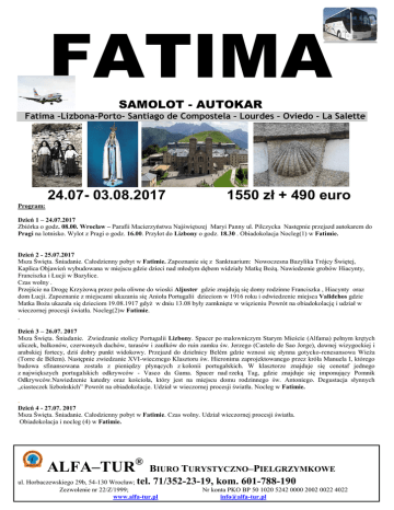 FATIMA SAMOLOT - AUTOKAR Fatima –Lizbona-Porto- Santiago de Compostela – Lourdes – Oviedo - La Salette 24.07- 03.08.2017 1550 zł + 490 euro Program: Dzień 1 – 24.07.2017 Zbiórka o godz. 08.00. Wrocław – Parafii Macierzyństwa Najświętszej Maryi Panny ul. Pilczycka Następnie przejazd autokarem do Pragi na lotnisko. Wylot z Pragi o godz. 16.00. Przylot do Lizbony o godz. 18.30 . Obiadokolacja Nocleg(1) w Fatimie. Dzień 2 - 25.07.2017 Msza Święta. Śniadanie. Całodzienny pobyt w Fatimie. Zapoznanie się z Sanktuarium: Nowoczesna Bazylika Trójcy Świętej, Kaplica Objawień wybudowana w miejscu gdzie dzieci nad młodym dębem widziały Matkę Bożą. Nawiedzenie grobów Hiacynty, Franciszka i Łucji w Bazylice. Czas wolny . Przejście na Drogę Krzyżową przez pola oliwne do wioski Aljuster gdzie znajdują się domy rodzinne Franciszka , Hiacynty oraz dom Łucji. Zapoznanie z miejscami ukazania się Anioła Portugalii dzieciom w 1916 roku i odwiedzenie miejsca Validehos gdzie Matka Boża ukazała się dzieciom 19.08.1917 gdyż w dniu 13.08 były zamknięte w więzieniu Powrót na obiadokolację i udział w wieczornej procesji światła. Nocleg(2)w Fatimie. . Dzień 3 – 26.07. 2017 Msza Święta. Śniadanie. Zwiedzanie stolicy Portugalii Lizbony. Spacer po malowniczym Starym Mieście (Alfama) pełnym krętych uliczek, balkonów, czerwonych dachów, tarasów i zaułków do ruin zamku św. Jerzego (Castelo de Sao Jorge), dawnej wizygockiej i arabskiej fortecy, dziś dobry punkt widokowy. Przejazd do dzielnicy Belém gdzie wznosi się słynna gotycko-renesansowa Wieża (Torre de Bélem). Następnie zwiedzanie XVI-wiecznego Klasztoru św. Hieronima zaprojektowanego przez króla Manuela I, którego budowa sfinansowana została z pieniędzy płynących z kolonii portugalskich. W klasztorze znajduje się cenotaf jednego z największych portugalskich odkrywców - Vasco da Gama. Spacer nad rzeką Tag, gdzie znajduje się imponujący Pomnik Odkrywców.Nawiedzenie katedry oraz kościoła, który jest na miejscu domu rodzinnego św. Antoniego. Degustacja słynnych „ciasteczek lizbońskich” Powrót na obiadokolacje. Udział w wieczornej procesji światła. Nocleg w Fatimie. . Dzień 4 - 27.07. 2017 Msza Święta. Śniadanie. Całodzienny pobyt w Fatimie. Czas wolny. Udział wieczornej procesji światła. Obiadokolacja i nocleg (4) w Fatimie. ALFA–TUR® BIURO TURYSTYCZNO–PIELGRZYMKOWE ul. Horbaczewskiego 29b, 54-130 Wrocław; tel. 71/352-23-19, kom. 601-788-190 Zezwolenie nr 22/Z/1999; www.alfa-tur.pl Nr konta PKO BP 50 1020 5242 0000 2002 0022 4022 [email protected] Dzień 5 – 28.07. 2017 Śniadanie. Wyjazd do Porto drugiego co do wielkości miasta w Portugalii. Miasto uzyskało nazwę najpiękniejszej ruiny świata ze względu na swoje zabytki przez wiele lat nierestaurowane ale ozdobione pięknie malowanymi kafelkami. Do dziś zachwycają swoja oryginalnością. Rejs statkiem po rzece Duero, degustacja wina porto z możliwością zakupów. Następnie przejazd w kierunku Santiago de Compostela . Nocleg (5) i obiadokolacja na Monte de Gozo. Dzień 6 – 29.07. 2017 Msza Święta. Śniadanie. Przejazd do Santiago de Compostela – zwiedzanie miasta i katedry św. Jakuba. Udział we Mszy Świętej dla pielgrzymów. Czas wolny. Przejazd na nocleg (6) i obiadokolację w okolicy Oviedo. Dzień 7 – 30.07.2017 Śniadanie – przejazd do katedry Najświętszego Zbawiciela w stolicy hiszpańskiej Asturii - Oviedo. Tam przytulona do katedry jest Święta Komnata pw. św. Michała – w niej przechowywana jest tzw. Święta Skrzynia a w niej wiele wspaniałych relikwii, najważniejszą z nich jest chusta ( łac. Sudarium) – dosłownie: chusta do wycierania potu- uważana za płótno, którym okryto Jezusowi po śmierci głowę. Następnie przejazd w kierunku Lourdes. Obiadokolacja i nocleg(7) w Lourdes. Dzień 8 – 31.07.2017 Msza Święta . Śniadanie – Całodzienny pobyt w Lourdes. Zapoznanie z Sanktuarium: podziemna Bazylika św. Piusa X, Bazylika Matki Bożej Różańcowej, Bazylika Niepokalanego Poczęcia., Grota Objawienia, źródło. Spacer śladami życia św. Bernadetty: miejsce urodzenia, młyn BOLY, kościół parafialny gdzie została ochrzczona św. Bernadeta. Hospicjum gdzie przebywała św. Bernadeta już po objawieniach i tam przyjęła pierwszą Komunię Świętą. Droga Krzyżowa. Czas wolny. Obiadokolacja udział w wieczornej procesji światła. Obiadokolacja. Nocleg(8) w Lourdes. . Dzień 9 - 01.08.2017 Msza Święta. Śniadanie. Przejazd do La Salette – Sanktuarium Matki Bożej - miejsca objawień gdzie w 1846 roku Matka Boża ukazała się dwojgu pastuszkom Melanii i Maksyminowi. Sanktuarium położone jest na wysokości 1750 m n.p.m. Na miejscu objawienia wytrysnęło źródełko i płynie do dnia dzisiejszego bez przerwy.Zapoznanie z historią objawień i przesłaniem Matki Bożej. Wieczorem udział w procesji światła. Obiadokolacja i nocleg(9) w La Salette. Dzień 10 – 02.08.2017 Msza Święta. Śniadanie. Pobyt w Sanktuarium – czas wolny na spacer po górach . Obiad i przejazd w kierunku Bawarii - , nocleg tranzytowy na terenie Szwajcarii Dzień 11- 03.08.2017 Śniadanie. Przejazd do Altotting - nawiedzenie słynnego Sanktuarium Matki Bożej Patronki Bawarii, Msza Święta , zapoznanie się z życiem i działalnością św. Konrada – kapucyna posługującego w miejscowym klasztorze. Obiad we własnym zakresie. Przyjazd do Polski w godzinach nocnych Świadczenia zawarte w cenie: Przejazd autokarem LUX/samolotem 10 noclegów w hotelach 2*/3*/4* 10 śniadań , 9 obiadokolacji, 1 obiad opieka duszpasterska i codzienna Msza Święta opieka licencjonowanego pilota wycieczek ubezpieczenie NW i KL do 15 000 € ubezpieczenie od skutków zaostrzenia choroby przewlekłej ! Świadczenia nie zawarte w cenie: bilety do zwiedzanych obiektów , przewodnicy miejscowi i parkingi - ok. 70 € napoje do kolacji płatne dodatkowo – tylko w niektórych miejs