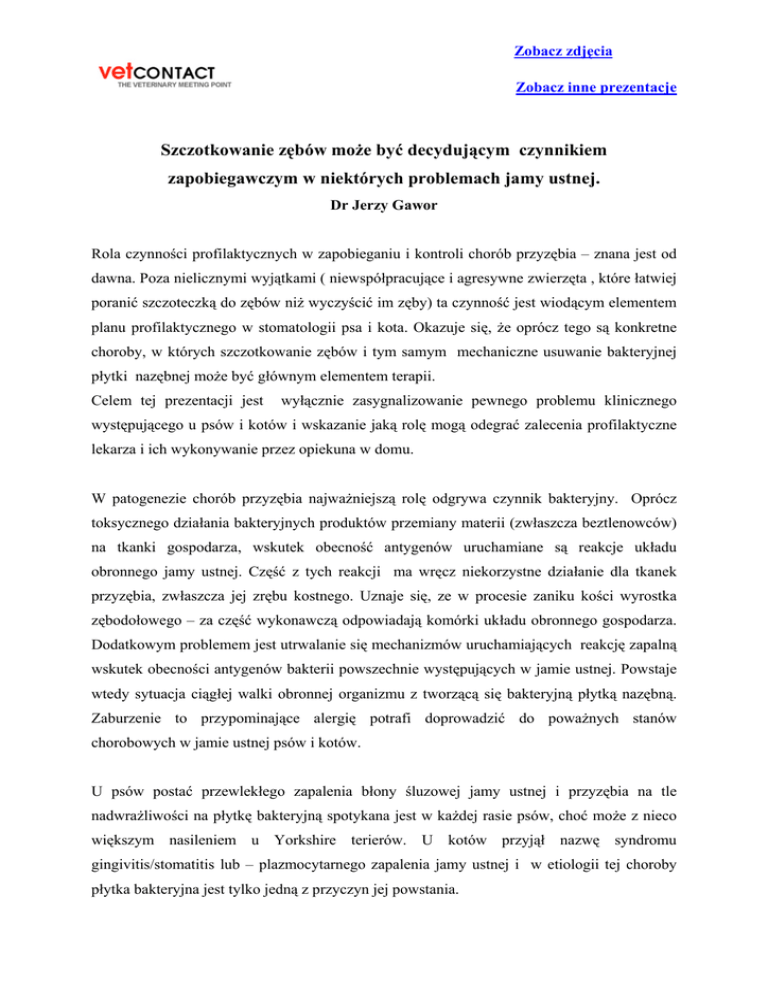Zobacz zdjęcia Zobacz inne prezentacje Szczotkowanie zębów może być decydującym czynnikiem zapobiegawczym w niektórych problemach jamy ustnej. Dr Jerzy Gawor Rola czynności profilaktycznych w zapobieganiu i kontroli chorób przyzębia – znana jest od dawna. Poza nielicznymi wyjątkami ( niewspółpracujące i agresywne zwierzęta , które łatwiej poranić szczoteczką do zębów niż wyczyścić im zęby) ta czynność jest wiodącym elementem planu profilaktycznego w stomatologii psa i kota. Okazuje się, że oprócz tego są konkretne choroby, w których szczotkowanie zębów i tym samym mechaniczne usuwanie bakteryjnej płytki nazębnej może być głównym elementem terapii. Celem tej prezentacji jest wyłącznie zasygnalizowanie pewnego problemu klinicznego występującego u psów i kotów i wskazanie jaką rolę mogą odegrać zalecenia profilaktyczne lekarza i ich wykonywanie przez opiekuna w domu. W patogenezie chorób przyzębia najważniejszą rolę odgrywa czynnik bakteryjny. Oprócz toksycznego działania bakteryjnych produktów przemiany materii (zwłaszcza beztlenowców) na tkanki gospodarza, wskutek obecność antygenów uruchamiane są reakcje układu obronnego jamy ustnej. Część z tych reakcji ma wręcz niekorzystne działanie dla tkanek przyzębia, zwłaszcza jej zrębu kostnego. Uznaje się, ze w procesie zaniku kości wyrostka zębodołowego – za część wykonawczą odpowiadają komórki układu obronnego gospodarza. Dodatkowym problemem jest utrwalanie się mechanizmów uruchamiających reakcję zapalną wskutek obecności antygenów bakterii powszechnie występujących w jamie ustnej. Powstaje wtedy sytuacja ciągłej walki obronnej organizmu z tworzącą się bakteryjną płytką nazębną. Zaburzenie to przypominające alergię potrafi doprowadzić do poważnych stanów chorobowych w jamie ustnej psów i kotów. U psów postać przewlekłego zapalenia błony śluzowej jamy ustnej i przyzębia na tle nadwrażliwości na płytkę bakteryjną spotykana jest w każdej rasie psów, choć może z nieco większym nasileniem u Yorkshire terierów. U kotów przyjął nazwę syndromu gingivitis/stomatitis lub – plazmocytarnego zapalenia jamy ustnej i w etiologii tej choroby płytka bakteryjna jest tylko jedną z przyczyn jej powstania. Zobacz zdjęcia Zobacz inne prezentacje Obu jednostkom poświęca się bardzo dużo uwagi, czego przejawem są liczne prace i projekty badawcze, ale wciąż nie ma jednoznacznie wyjaśnionego mechanizmu ich powstawania i co za tym idzie – nie ma skutecznego sposobu leczenia przyczynowego. Objawy u psów są typowe dla przewlekle obecnej choroby przyzębia: ślinienie, trudności w przyjmowaniu pokarmu, przekrwienie czynne dziąseł, z częstym ich krwawieniem, fetor ex ore, gruba warstwa miękkich i twardych osadów nazębnych. Oprócz tego na błonie śluzowej jamy ustnej, zwłaszcza w miejscach, gdzie styka się ona z uzębieniem (policzki i język) powstają krwawiące nadżerki i owrzodzenia. Węzły chłonne żuchwowe są symetrycznie powiększone. U kotów charakterystyczne jest przerost tkanek miękkich przyzębia i błony śluzowej zwłaszcza w obrębie łuków gardłowych, podniebienia miękkiego i nasady języka. Typowe dla takich pacjentów jest spektakularna poprawa po pierwszych zastosowaniach antybiotyków i leków przeciwzapalnych. Potem reakcje te są coraz słabsze. U psów zaobserwowano predyspozycji pod względem płci i wieku, u kotów okolicznościami sprzyjającymi są infekcje wirusowe osłabiające odporność ( zwłaszcza FeLV) oraz obecność odontoklastycznych nadżerek przyszyjkowych (FORL) Jeśli uznamy bakteryjną płytkę nazębną za czynnik wywołujący chorobę a za mechanizm choroby - reakcję o charakterze (w uproszczeniu) alergicznym na ta płytkę, można per analogiam z postępowaniem znanym z dermatologii uznać za najważniejsze 2 kierunki postępowania w leczeniu: 1. Zmniejszenie podaży czynnika wywołującego oraz 2. Osłabienie reakcji zapalnej gospodarza. Na tym kończą się umowne analogie z dermatozami alergicznymi, w stomatologii nie stosuje się odczulania jako metody leczenia, choć być może i taki kierunek badań przyniesie przyszłość. Dwie wspomniane metody działania często muszą być wykorzystywane jednocześnie zwłaszcza w pierwszym etapie leczenia. Ograniczanie ilości antygenów bakterii polega na Zobacz zdjęcia Zobacz inne prezentacje doprowadzeniu przyzębia do takiego stanu aby usunąć wszystkie warunki sprzyjające powstawaniu płytki bakteryjnej oraz stosowaniu czynności i środków mających wpływ na spowolnienie tego procesu. W tym celu wykonuje się szereg różnych zabiegów w znieczuleniu: usuwanie osadów nazębnych, kiretaż poddziąsłowy, wygładzanie powierzchni cementu korzeniowego, polerowanie koron zębowych, ekstrakcje chorych zębów, gingiwektomię, aplikację przeciwbakteryjnych preparatów polimeryzujących (Doxirobe) do kieszeni dziąsłowych. Po zabiegu sanacji jamy ustnej podejmuje się działania zapobiegające powstawaniu płytki nazębnej. Można tu wyróżnić działania o charakterze mechanicznym, farmakologicznym i mieszanym. Najskuteczniejszym działaniem jest codzienne szczotkowanie zębów przy użyciu odpowiedniej szczoteczki. Zastosowanie odpowiednio aromatyzowanej pasty do zębów może dodatkowo zachęcić psa lub kota do współpracy. Innymi metodami wspomagającymi mechaniczne oczyszczanie zębów to – odpowiednia dieta, której tekstura, rozmiar powierzchnia i substancje aktywne w niej zawarte decydują o skuteczności działania. Ponadto mechaniczne oczyszczanie wspomagać mogą odpowiednie gryzaki, żujki, smakołyki i zabawki. Farmakologicznie można oddziaływać na bakterie jamy ustnej preparatami przeciwbakteryjnymi. Szereg antybiotyków może mieć tu zastosowanie, zarówno w użyciu ogólnym (warto zwracać uwagę na bezpieczeństwo długotrwałego ich stosowania, koncentrację w ślinie oraz spektrum