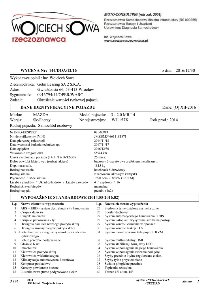 WYCENA Nr: 144/DOA/12/16 z dnia: 2016/12/30 Wykonawca opinii : inż. Wojciech Sowa Zleceniodawca: Getin Leasing SA 2 S.K.A. Adres: Gwiaździsta 66, 53-413 Wrocław Sygnatura akt: 0913794/14/OPER/WARC Zadanie: Określenie wartości rynkowej pojazdu DANE IDENTYFIKACYJNE POJAZDU Marka: MAZDA Wersja: SkyEnergy Rodzaj pojazdu: Samochód osobowy Dane: [O] XII-2016 Model pojazdu: Nr rejestracyjny: Nr INFO-EKSPERT Nr identyfikacyjny (VIN) Data pierwszej rejestracji Data ważności badania technicznego Data oględzin Wskazanie drogomierza Okres eksploatacji pojazdu (14/11/18-16/12/30) Kolor powłoki lakierowej, (rodzaj lakieru) Dop. masa całk. Rodzaj nadwozia Rodzaj silnika Pojemność / Moc silnika Liczba cylindrów / Układ cylindrów / Liczba zaworów Rodzaj skrzyni biegów Rodzaj napędu 3 - 2.0 MR`14 WI1157X Rok prod.: 2014 021-00843 JMZBM546611181871 2014/11/18 2017/11/17 2016/12/30 55544 km 25 mies. brązowy 2-warstwowy z efektem metalicznym 1815 kg hatchback 5 drzwiowy z zapłonem iskrowym (wtrysk) 1998 ccm / 88kW (120KM) 4 / rzędowy / 16 manualna przedni (4x2) WYPOSAŻENIE STANDARDOWE (2014.03-2016.02) L.p. Nazwa elementu wyposażenia 1 ABS + EBD - system dystrybucji siły hamowania 2 Czujnik deszczu 3 Czujnik zmierzchu 4 Czujniki parkowania - tył 5 Dźwignia hamulca ręcznego pokryta skórą 6 Dźwignia zmiany biegów pokryta skórą 7 + Fotel kierowcy z regulacją wysokości i odcinka lędźwiowego 8 Fotele przednie podgrzewane 9 Głośniki 6 szt. 10 Immobilizer 11 Kierownica pokryta skórą 12 Kierownica wielofunkcyjna 13 Klimatyzacja automatyczna 2 strefowa 14 Komputer pokładowy 15 Kurtyny powietrzne boczne 16 Lusterka zewnętrzne podgrzewane elektr. 3.136 9034 19034 inż. Wojciech Sowa L.p. 25 26 27 28 29 30 31 Nazwa elementu wyposażenia Siedzenia tylne dzielone asymetrycznie Spoiler dachowy System automatycznego hamowania SCBS System i-stop aut. wyłączanie silnika na postoju System kontroli ciśnienia w oponach System kontroli trakcji TCS System monitorowania tyłu pojazdu RVM 32 33 34 35 36 37 38 39 40 System multimedialny HMI System stabilizacji toru jazdy DSC System wspomagania nagłego hamowania System wspomagania ruszania pod górę Szyby przednie i tylne regulowane elektr. Szyby tylne przyciemniane Światła p/mgielne przednie Tapicerka tekstylna Tarcze kół alum. 16" System INFO-EKSPERT / SRTSiRD Strona 1 144/DOA/12/16 17 Lusterka zewnętrzne regulowane elektrycznie 18 Lusterka zewnętrzne składane elektrycznie 19 Lusterko wewnętrzne ściemniane automatycznie 20 Podłokietnik centralny przedni 21 + Podłokietnik siedzeń tylnych 22 Poduszki powietrzne boczne przednie 23 Poduszki powietrzne kierowcy i pasażera 24 Radioodtwarzacz CD + MP3 41 42 43 44 45 46 47 Tempomat Wspomaganie układu kierowniczego Wyświetlacz wielofunkcyjny 7" Zamek centralny zdalnie sterowany Zestaw głośnomówiący "Bluetooth" Złącze "AUX" Złącze "USB" WYPOSAŻENIE DODATKOWE L.p. Nazwa elementu wyposażenia 1 Autoalarm 2 +Dywaniki tekstylne 3 Lakier metalizowany Wartość [PLN] 513 61 874 OPIS ZAMONTOWANEGO W POJEŹDZIE OGUMIENIA Koło Przednie lewe: Przednie prawe: Tylne lewe: Tylne prawe: Marka, typ *TOYO 205/60 *TOYO 205/60 *TOYO 205/60 *TOYO 205/60 R16 R16 R16 R16 92V 92V 92V 92V Bieżnik [mm] Zużycie [%] 3,5 73 3,5 73 7,5 17 6,5 31 NANO ENERGY R38 TL NANO ENERGY R38 TL NANO ENERGY R38 TL NANO ENERGY R38 TL KOREKTY WARTOŚĆ BAZOWA NETTO (31 mies.) .................................... KOREKTA ZA WYPOSAŻENIE DODATKOWE .............................. KOREKTA ZA PIERWSZĄ REJESTRACJĘ ................................... KOREKTA ZA PRZEBIEG ................................................ KOREKTA ZA OGUMIENIE .............................................. KOREKTY RÓŻNE ...................................................... W tym: [%] Wartość Stan utrzymania i dbałość o pojazd Zadana szacunkowa korekta z tytułu wcześniejszych napraw Korekta ze względu na serwisowanie pojazdu Naprawy, wady, braki -1,0 -3,0 -3,0 -3,6 38 780 PLN 1 448 PLN 2 135 PLN - 995 PLN 23 PLN - 4 395 PLN - 413 -1 241 -1 241 -1 500 KOMENTARZ Oględzin pojazdu dokonano w obecności zlecającego, który przedłożył do wglądu : -dowód rejestracyjny seria: DR/BAK 4523721 -1 klucz rozruchowy ze sterownikiem zdalnym zamka centralnego -instrukcję obsługi pojazdu Numer identyfikacyjny pojazdu odczytano z natury i potwierdzono jego zgodność z zapisem w dowodzie rejestracyjnym, Brak danych o przebiegu całkowitym, sposobie serwisowania i eksploatacji pojazdu, brak książki serwisowej. I. Silnik oraz układ napędowy (weryfikacja w warunkach parkingowych). Silnik o zapłonie iskrowym - uruchomiono. Jednostka napędowa pracuje bez nadmiernej głośności i dymienia, praca silnika na biegu jałowym jest równomierna. Nie stwierdzono śladów wycieków oleju na silniku i obudowie skrzyni biegów. Nie stwierdzono śladów „przepoceń” i przedmuchów oleju na elementach silnika i jego osprzęcie. Skrzynia biegów - nie stwierdzono nieprawidłowości, zakłóceń w pracy mechanizmu. II. Układ zawieszenia, układ kierowniczy i elementy podwozia (weryfikacja w warunkach parkingowych). W wyniku badania organoleptycznego i po krótkiej jeździe próbnej nie stwierdzono widocznych uszkodzeń ani 3.136 9034 19034 inż. Wojciech Sowa System INFO-EKSPERT / SRTSiRD Strona 2 144/DOA/12/16 poszczególnych elementów zwieszenia kół ani układu kierowniczego. Nie stwierdzono nadmiernie podwyższonych luzów w połączeniach ruchowych elementów zawieszenia kół i układu kierowniczego. III. Karoseria / nadwozie. Stwierdzono ślady napraw blacharsko - lakierniczych: -drzwi przednie lewe - do 120 µm -błotnik tylny lewy - do 200 µm -błotnik tylny prawy - do 890 µm -drzwi tylne prawe - do 1,1 mm -drzwi przednie prawe - do 280 µm -błotnik przedni prawy - do 340 µm Grubość powłok lakierowych rzędu 70 - 90 µm na pozostałych elementach karoserii (poszyć z materiałów metalowych) podlegających lakierowaniu. IV. St