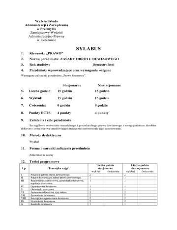 WyŜsza Szkoła Administracji i Zarządzania w Przemyślu Zamiejscowy Wydział Administracyjno-Prawny w Rzeszowie SYLABUS 1. Kierunek: „PRAWO” 2. Nazwa przedmiotu: ZASADY OBROTU DEWIZOWEGO 3. Rok studiów: 4. Przedmioty wprowadzające oraz wymagania wstępne Semestr: letni Wymagane zaliczenie przedmiotu „Prawo finansowe”. Stacjonarne Niestacjonarne 5. Liczba godzin: 15 godzin 15 godzin 6. Wykład: 15 godzin 15 godzin 7. Ćwiczenia: 0 godzin 0 godzin 8. Punkty ECTS: 4 punkty 4 punkty 9. ZałoŜenia i cele przedmiotu Szczegółowe omówienie materialnego i proceduralnego prawa dewizowego z uwzględnieniem dorobku doktryny i orzecznictwa umoŜliwiające praktyczne zastosowanie jego zastosowanie. 10. Metody dydaktyczne Wykład 11. Forma i warunki zaliczenia przedmiotu Zaliczenie na ocenę 12. Lp. I II III IV V VI VII VIII IX X Treści programowe Liczba godzin stacjonarne wykład ćwiczenia Tematyka zajęć Pojęcie i geneza prawa dewizowego. Pojęcia kształtujące zakres prawa dewizowego. Reglamentacja dewizowa, gospodarka dewizowa, regulacja dewizowa. Ograniczenia dewizowe Obowiązki dewizowe Autonomia dewizowa i jej zakres. Zezwolenia dewizowe. Szczególne ograniczenia dewizowe Działalność kantorowa Kontrola dewizowa. Liczba godzin niestacjonarne wykład ćwiczenia 2 1 1 2 1 1 1 1 2 2 2 2 1 1 1 2 2 2 2 1 13. Literatura podstawowa 1. 2. 3. 4. W. Wójtowicz, A. Gorgol: Prawo dewizowe, Warszawa 2003. E. Fojcik-Mastalska: Prawo dewizowe: komentarz 2005, Wrocław 2005, E. Fojcik-Mastalska: Prawo dewizowe: komentarz 2006, Wrocław 2006, T. Grzegorczyk: Ustawa – Prawo dewizowe. Komentarz, Warszawa 2003. 14. Literatura uzupełniająca 1. E. Fojcik-Mastalska, Nowe prawo dewizowe, Wrocław 2002, 2. E. Fojcik-Mastalska, K. Sawicka, Podstawy prawa celnego i dewizowego, Wrocław 2001. 15. Nazwisko osoby prowadzącej zajęcia na studiach stacjonarnych - wykład: dr E. Feret - ćwiczenia: 16. Nazwisko osoby prowadzącej zajęcia na studiach niestacjonarnych - wykład: dr E. Feret - ćwiczenia: