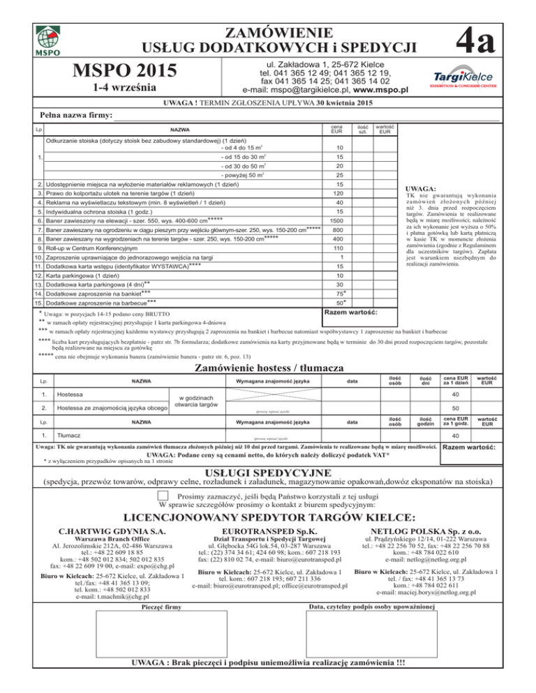 4a ZAMÓWIENIE US£UG DODATKOWYCH i SPEDYCJI ul. Zak³adowa 1, 25-672 Kielce tel. 041 365 12 49; 041 365 12 19, fax 041 365 14 25; 041 365 14 02 e-mail: [email protected], www.mspo.pl MSPO 2015 1-4 wrzeœnia UWAGA ! TERMIN ZG£OSZENIA UP£YWA 30 kwietnia 2015 Pe³na nazwa firmy: Lp. cena EUR NAZWA Odkurzanie stoiska (dotyczy stoisk bez zabudowy standardowej) (1 dzieñ) - od 4 do 15 m2 1. iloœæ szt. wartoœæ EUR 10 - od 15 do 30 m2 15 - od 30 do 50 m2 20 - powy¿ej 50 m2 25 15 2. Udostêpnienie miejsca na wy³o¿enie materia³ów reklamowych (1 dzieñ) 3. Prawo do kolporta¿u ulotek na terenie targów (1 dzieñ) UWAGA: 120 TK nie gwarantuj¹ wykonania zamówieñ z³o¿onych póŸniej ni¿ 3. dnia przed rozpoczêciem targów. Zamówienia te realizowane bêd¹ w miarê mo¿liwoœci; nale¿noœæ za ich wykonanie jest wy¿sza o 50% i p³atna gotówk¹ lub kart¹ p³atnicz¹ w kasie TK w momencie z³o¿enia zamówienia (zgodnie z Regulaminem dla uczestników targów). Zap³ata jest warunkiem niezbêdnym do realizacji zamówienia. 40 4. Reklama na wyœwietlaczu tekstowym (min. 8 wyœwietleñ / 1 dzieñ) 15 5. Indywidualna ochrona stoiska (1 godz.) 6. Baner zawieszony na elewacji - szer. 550, wys. 400-600 cm***** 1500 7. Baner zawieszany na ogrodzeniu w ci¹gu pieszym przy wejœciu g³ównym-szer. 250, wys. 150-200 cm***** 800 8. Baner zawieszany na wygrodzeniach na terenie targów - szer. 250, wys. 150-200 cm***** 400 9. Roll-up w Centrum Konferencyjnym 110 1 10. Zaproszenie uprawniaj¹ce do jednorazowego wejœcia na targi 11. Dodatkowa karta wstêpu (identyfikator WYSTAWCA)**** 15 12. Karta parkingowa (1 dzieñ) 10 13. Dodatkowa karta parkingowa (4 dni)** 30 14. Dodatkowe zaproszenie na bankiet*** 75* 15. Dodatkowe zaproszenie na barbecue*** 50* Razem wartoœæ: * Uwaga: w pozycjach 14-15 podano ceny BRUTTO ** w ramach op³aty rejestracyjnej przys³uguje 1 karta parkingowa 4-dniowa *** w ramach op³aty rejestracyjnej ka¿demu wystawcy przys³uguj¹ 2 zaproszenia na bankiet i barbecue natomiast wspó³wystawcy 1 zaproszenie na bankiet i barbecue **** liczba kart przys³uguj¹cych bezp³atnie - patrz str. 7b formularza; dodatkowe zamówienia na karty przyjmowane bêd¹ w terminie do 30 dni przed rozpoczêciem targów, pozosta³e bêd¹ realizowane na miejscu za gotówkê ***** cena nie obejmuje wykonania banera (zamówienie banera - patrz str. 6, poz. 13) Zamówienie hostess / t³umacza Lp. NAZWA Wymagana znajomoœæ jêzyka 1. Hostessa 2. Hostessa ze znajomoœci¹ jêzyka obcego Lp. 1. iloœæ osób data iloœæ dni 50 (proszê wpisaæ jêzyk) Wymagana znajomoœæ jêzyka T³umacz wartoœæ EUR 40 w godzinach otwarcia targów NAZWA cena EUR za 1 dzieñ iloœæ osób data iloœæ godzin cena EUR za 1 godz. wartoœæ EUR 40 (proszê wpisaæ jêzyk) Uwaga: TK nie gwarantuj¹ wykonania zamówieñ t³umacza z³o¿onych póŸniej ni¿ 10 dni przed targami. Zamówienia te realizowane bêd¹ w miarê mo¿liwoœci. Razem wartoœæ: UWAGA: Podane ceny s¹ cenami netto, do których nale¿y doliczyæ podatek VAT* * z wy³¹czeniem przypadków opisanych na 1 stronie US£UGI SPEDYCYJNE (spedycja, przewóz towarów, odprawy celne, roz³adunek i za³adunek, magazynowanie opakowañ,dowóz eksponatów na stoiska) Prosimy zaznaczyæ, jeœli bêd¹ Pañstwo korzystali z tej us³ugi W sprawie szczegó³ów prosimy o kontakt z biurem spedycyjnym: LICENCJONOWANY SPEDYTOR TARGÓW KIELCE: C.HARTWIG GDYNIA S.A. EUROTRANSPED Sp.K. NETLOG POLSKA Sp. z o.o. Warszawa Branch Office Al. Jerozolimskie 212A, 02-486 Warszawa tel.: +48 22 609 18 85 kom.: +48 502 012 834; 502 012 835 fax: +48 22 609 19 00, e-mail: [email protected] Dzia³ Transportu i Spedycji Targowej ul. G³êbocka 54G lok.54, 03-287 Warszawa tel.: (22) 374 34 61; 424 60 98; kom.: 607 218 193 fax: (22) 810 02 74, e-mail: [email protected] ul. Pr¹dzyñskiego 12/14, 01-222 Warszawa tel.: +48 22 256 70 52, fax: +48 22 256 70 88 kom.: +48 784 022 610 e-mail: [email protected] Biuro w Kielcach: 25-672 Kielce, ul. Zak³adowa 1 tel./fax: +48 41 365 13 09; tel. kom.: +48 502 012 833 e-mail: [email protected] Pieczêæ firmy Biuro w Kielcach: 25-672 Kielce, ul. Zak³adowa 1 Biuro w Kielcach: 25-672 Kielce, ul. Zak³adowa 1 tel. / fax: +48 41 365 13 73 tel. kom.: 607 218 193; 607 211 336 kom.: +48 784 022 611 e-mail: [email protected]; [email protected] e-mail: [email protected] Data, czytelny podpis osoby upowa¿nionej UWAGA : Brak pieczêci i podpisu uniemo¿liwia realizacjê zamówienia !!!