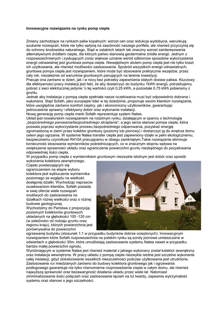 Innowacyjne rozwiązania na rynku pomp ciepła Zmiany zachodzące na rynkach paliw kopalnych: wzrost cen oraz redukcja wydobycia, warunkują szukanie rozwiązań, które nie tylko wpłyną na zasobność naszego portfela, ale również przyczynią się do ochrony środowiska naturalnego. Stąd w ostatnich latach tak znaczny wzrost zainteresowania alternatywnymi źródłami ciepła, dla których paliwo stanowią geotermalne źródła energii. Jednym z rozpowszechnianych i zyskujących coraz większe uznanie wśród odbiorców sposobów wykorzystania energii odnawialnej jest gruntowa pompa ciepła. Niewątpliwym atutem pomp ciepła jest nie tylko koszt ich użytkowania, ale również możliwości zastosowania. Spośród wszystkich energii odnawialnych, gruntowa pompa ciepła jest rozwiązaniem, które może być stosowane praktycznie wszędzie, przez cały rok, niezależnie od warunków gruntowych panujących na terenie inwestycji. Pracuje ona zarówno w dzień, jak i w nocy bez potrzeby zapewniania stałych dostaw paliwa. Kluczowy dla efektywności pracy instalacji jest fakt, że aby dostarczyć do budynku 1kWh energii, potrzebujemy pobrać z sieci elektrycznej jedynie ¼ tej wartości czyli 0,25 kWh, a pozostałe 0,75 kWh pobieramy z gruntu. Jednak aby instalacja z pompą ciepła spełniała nasze oczekiwania musi być odpowiednio dobrana i wykonana. Stąd Sofath, jako europejski lider w tej dziedzinie, proponuje swoim klientom rozwiązanie, które uwzględnia zarówno komfort cieplny, jak i ekonomiczny użytkowników, gwarantując jednocześnie sprawny i efektywny dobór oraz wykonanie instalacji. Nową generację pomp ciepła marki Sofath reprezentuje system Natea. Układ jest nowatorskim rozwiązaniem na rodzimym rynku, działającym w oparciu o technologię „bezpośredniego parowania/bezpośredniego skraplania“, a jego serce stanowi pompa ciepła, która pozwala poprzez wykorzystanie procesu bezpośredniego odparowania, pozyskać energię zgromadzoną w ziemi przez kolektor gruntowy (poziomy lub pionowy) i dostarczyć ją do wnętrza domu celem jego ogrzania. W systemie Natea transfer ciepła jest zapewniony dzięki w pełni ekologicznemu, bezpiecznemu czynnikowi R410A pracującemu w obiegu zamkniętym.Takie rozwiązanie eliminuje konieczność stosowania wymienników pośredniczących, co w znacznym stopniu wpływa na zwiększenie sprawności układu oraz ograniczenie powierzchni gruntu niezbędnego do pozyskiwania odpowiedniej ilości ciepła. W przypadku pomp ciepła z wymiennikiem gruntowym niezwykle istotnym jest dobór oraz sposób wykonania kolektora zewnętrznego. Często powtarzającym się ograniczeniem na etapie wyboru kolektora jest wykluczenie wymiennika poziomego ze względu na wielkość dostępnej działki. Wychodząc naprzeciw oczekiwaniom klientów, Sofath posiada w swej ofercie wiele rozwiązań możliwych do zastosowania na działkach różnej wielkości oraz o różnej budowie geologicznej. Wychodzimy do Państwa z propozycją poziomych kolektorów gruntowych układanych na głębokości 100 -120 cm (w zależności od rodzaju gruntu oraz regionu kraju), których powierzchnia jest porównywalna do powierzchni ogrzewanej budynku (stosunek 1:1 w przypadku budynków dobrze ocieplonych). Innowacyjnym rozwiązaniem które Sofath rozpowszechnia na polskim rynku są sondy pionowe umieszczane w odwiertach o głębokości 30m, które umożliwiają zastosowanie systemu Natea nawet w przypadku bardzo małej powierzchni ogrodu. Wyróżniającym w systemie Natea jest również materiał z jakiego wykonany został kolektor zewnętrzny oraz instalacja wewnętrzna. W pracy układu z pompą ciepła niezwykle istotne jest szczelne wykonanie całej instalacji, gdyż zlokalizowanie wszelkich nieszczelności podczas użytkowania jest utrudnione. Zastosowanie rur miedzianych zarówno do budowy kolektora gruntowego jak i ogrzewania podłogowego gwarantuje nie tylko równomierne rozprowadzenie ciepła w całym domu, ale również najwyższą sprawność oraz bezawaryjność działania układu przez wiele lat. Natomiast zminimalizowanie ilości połączeń oraz zastosowanie łączeń na lut twardy, zapewnia wytrzymałość systemu oraz stanowi o jego szczelności. Pompy ciepła Natea dają duże możliwości poszerzania funkcji systemu. Dodatkową zaletą oprócz funkcji ogrzewania domu jest wytwarzanie ciepłej wody użytkowej o 0 temperaturze do 65 C. Dołączenie sekcji ciepłej wody użytkowej do instalacji grzewczej Sofath powoduje uzyskanie ciepłej wody po najniższych kosztach. Pompy Natea posiadają również opcję pełnej klimatyzacji pomieszczeń. Wystarczy latem odwrócić kierunek przepływu czynnika roboczego, aby odprowadzić do gruntu ciepło pobrane w domu. Używana do ogrzewania domu pompa ciepła może podgrzewać także wodę w domowym basenie. Automatyczna regulacja systemu umożliwia równoczesne ogrzewanie domu i basenu, przy czym w sezonach przejściowych priorytet ma ogrzewanie pomieszczeń mieszkalnych. Rewolucyjność prezentowanego systemu polega również na bardzo atrakcyjnej cenie. Koszt inwestycyjny dla pomp ciepła Sofath jest porównywalny z kosztami towarzyszącymi założeniu nowoczesnej instalacji grzewczej z kotłem kondensacyjnym. Natomiast nieporównywalnie korzystniej kształtują się późniejsze koszta eksploatacyjne, które pozwalają zaoszczędzić do 30% wydatków na ogrzewanie. 2 Przykładowo dla domu o powierzchni 150 m (zapotrzebowanie na moc 9kW) przewidywany roczny koszt ogrzewania przy zastosowaniu wybranych paliw (ceny i stawki opłat zgodne z obowiązującymi w I kwartale 2012r.), przedstawia się następująco: Przewidywany roczny koszt ogrzewa nia 12000 11023 9698 [zł brutto/ rok] 10000 9432 8000 5476 6000 4000 6116 4028 3212 Kocioł n a ekog ro szek Kocioł olejowy Kocioł tradycyjny (propan-butan) Kocioł kondensacyjny (p ro pan-bu tan) Kocioł trad ycyjny (gaz E) Kocioł kond en sacyjny (gaz E) 0 Pomp a ciepła Natea 2000 P