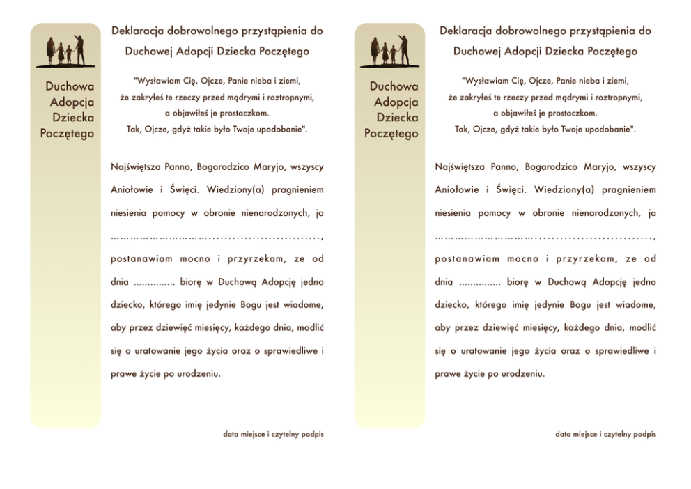 Duchowa Adopcja Dziecka Poczętego Deklaracja dobrowolnego przystąpienia do Deklaracja dobrowolnego przystąpienia do Duchowej Adopcji Dziecka Poczętego Duchowej Adopcji Dziecka Poczętego "Wysławiam Cię, Ojcze, Panie nieba i ziemi, że zakryłeś te rzeczy przed mądrymi i roztropnymi, a objawiłeś je prostaczkom. Tak, Ojcze, gdyż takie było Twoje upodobanie". Duchowa Adopcja Dziecka Poczętego "Wysławiam Cię, Ojcze, Panie nieba i ziemi, że zakryłeś te rzeczy przed mądrymi i roztropnymi, a objawiłeś je prostaczkom. Tak, Ojcze, gdyż takie było Twoje upodobanie". Najświętsza Panno, Bogarodzico Maryjo, wszyscy Najświętsza Panno, Bogarodzico Maryjo, wszyscy Aniołowie i Święci. Wiedziony(a) pragnieniem Aniołowie i Święci. Wiedziony(a) pragnieniem niesienia pomocy w obronie nienarodzonych, ja niesienia pomocy w obronie nienarodzonych, ja …………………………............................, …………………………............................, postanawiam mocno i przyrzekam, ze od p o s t a n a w i a m m o c n o i p r z y r z e ka m , z e o d dnia ............... biorę w Duchową Adopcję jedno dnia ............... biorę w Duchową Adopcję jedno dziecko, którego imię jedynie Bogu jest wiadome, dziecko, którego imię jedynie Bogu jest wiadome, aby przez dziewięć miesięcy, każdego dnia, modlić aby przez dziewięć miesięcy, każdego dnia, modlić się o uratowanie jego życia oraz o sprawiedliwe i się o uratowanie jego życia oraz o sprawiedliwe i prawe życie po urodzeniu. prawe życie po urodzeniu. data miejsce i czytelny podpis data miejsce i czytelny podpis Warto wiedzieć • • Warto wiedzieć Duchowa Adopcja polega na codziennym odmawianiu (przez • 9 miesięcy) jednej dziesiątki różańca św. oraz specjalnej 9 miesięcy) jednej dziesiątki różańca św. oraz specjalnej modlitwy, modlitwy, Do modlitwy można dołączyć dowolne, dodatkowe • postanowienie, • Duchową Adopcję może podjąć każdy: osoby świeckie, Duchową • Adopcję można podjąć • Za każdym razem trzeba złożyć przyrzeczenie, • Krótkotrwałe wielokrotnie, • przerwanie Duchowej Adopcji nie jest dowolne, dodatkowe Duchową Adopcję może podjąć każdy: osoby świeckie, Duchową Adopcję można podjąć • Za każdym razem trzeba złożyć przyrzeczenie, • Krótkotrwałe ponowić przyrzeczenie i starać się • wielokrotnie, przerwanie Duchowej Adopcji nie jest Świadome zlekceważenie złożonego Bogu przyrzeczenia jest grzechem. Duchowa Adopcja jest rzeczywistą modlitewną opieką nad poczętym dzieckiem, tak, aby mogło się narodzić w kochającej rodzinie. Długa przerwa (miesiąc, dwa) przerywa Duchową Adopcję. Należy je dotrzymać, • dołączyć grzechem, Długa przerwa (miesiąc, dwa) przerywa Duchową Adopcję. wtedy można pod warunkiem wypełnienia poprzednich zobowiązań, grzechem, Należy modlitwy kobiety, mężczyźni, osoby chore, dzieci pod opieką rodziców, pod warunkiem wypełnienia poprzednich zobowiązań, • Do postanowienie, kobiety, mężczyźni, osoby chore, dzieci pod opieką rodziców, • Duchowa Adopcja polega na codziennym odmawianiu (przez wtedy ponowić przyrzeczenie i starać się je dotrzymać, • Świadome zlekceważenie złożonego Bogu przyrzeczenia jest grzechem. Duchowa Adopcja jest rzeczywistą modlitewną opieką nad poczętym dzieckiem, tak, aby mogło się narodzić w kochającej rodzinie.