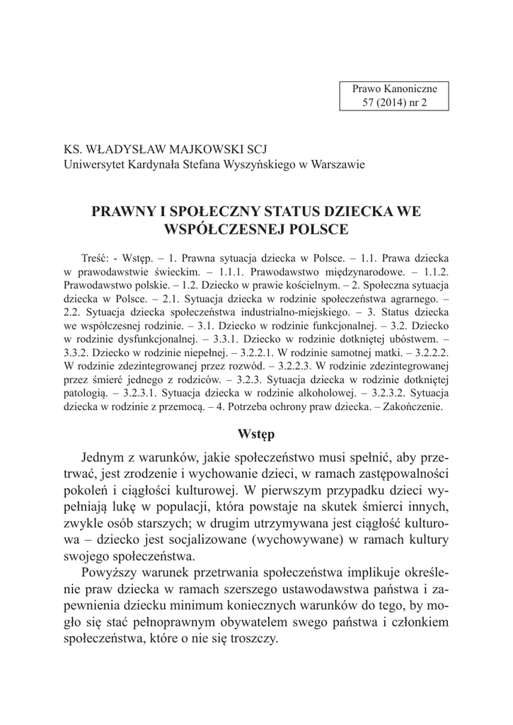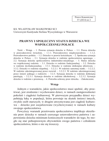 Prawo Kanoniczne 57 (2014) nr 2 KS. WŁADYSŁAW MAJKOWSKI SCJ Uniwersytet Kardynała Stefana Wyszyńskiego w Warszawie PRAWNY I SPOŁECZNY STATUS DZIECKA WE WSPÓŁCZESNEJ POLSCE Treść: - Wstęp. – 1. Prawna sytuacja dziecka w Polsce. – 1.1. Prawa dziecka w prawodawstwie świeckim. – 1.1.1. Prawodawstwo międzynarodowe. – 1.1.2. Prawodawstwo polskie. – 1.2. Dziecko w prawie kościelnym. – 2. Społeczna sytuacja dziecka w Polsce. – 2.1. Sytuacja dziecka w rodzinie społeczeństwa agrarnego. – 2.2. Sytuacja dziecka społeczeństwa industrialno-miejskiego. – 3. Status dziecka we współczesnej rodzinie. – 3.1. Dziecko w rodzinie funkcjonalnej. – 3.2. Dziecko w rodzinie dysfunkcjonalnej. – 3.3.1. Dziecko w rodzinie dotkniętej ubóstwem. – 3.3.2. Dziecko w rodzinie niepełnej. – 3.2.2.1. W rodzinie samotnej matki. – 3.2.2.2. W rodzinie zdezintegrowanej przez rozwód. – 3.2.2.3. W rodzinie zdezintegrowanej przez śmierć jednego z rodziców. – 3.2.3. Sytuacja dziecka w rodzinie dotkniętej patologią. – 3.2.3.1. Sytuacja dziecka w rodzinie alkoholowej. – 3.2.3.2. Sytuacja dziecka w rodzinie z przemocą. – 4. Potrzeba ochrony praw dziecka. – Zakończenie. Wstęp Jednym z warunków, jakie społeczeństwo musi spełnić, aby przetrwać, jest zrodzenie i wychowanie dzieci, w ramach zastępowalności pokoleń i ciągłości kulturowej. W pierwszym przypadku dzieci wypełniają lukę w populacji, która powstaje na skutek śmierci innych, zwykle osób starszych; w drugim utrzymywana jest ciągłość kulturowa – dziecko jest socjalizowane (wychowywane) w ramach kultury swojego społeczeństwa. Powyższy warunek przetrwania społeczeństwa implikuje określenie praw dziecka w ramach szerszego ustawodawstwa państwa i zapewnienia dziecku minimum koniecznych warunków do tego, by mogło się stać pełnoprawnym obywatelem swego państwa i członkiem społeczeństwa, które o nie się troszczy. 130 KS. W. MAJKOWSKI [2] Te dwa postulaty składają się na warunki, które pozwalają dzieciom narodzić się, wzrastać fizycznie i rozwijać się intelektualnie; w ramach tego dzieci są chronione przed niekorzystnymi czynnikami, a w szczególności biedą i chorobami. Nie mniej ważną rzeczą jest wychowanie dziecka, które powinno dokonywać się w rodzinie, ponieważ rodzina stanowi dla dziecka naturalne i najbardziej właściwe środowisko. Z tej racji, pośrednio, różne dokumenty jak na przykład Konwencja Praw Dziecka, przypisuje rodzinie wiodącą rolę w jego wychowaniu. Dokumenty określające prawa dziecka mają dwa poziomy: międzynarodowy i państwowy. Te pierwsze zostały ratyfikowane przez wiele państw i przez to są wiążące na forum tychże państw. Nierzadko są uzupełniane przez prawodawstwo własne. Specyficzną kategorią prawodawstwa jest prawodawstwo kościelne, które chroni dziecko nade wszystko formułując, jak nie wolno postępować wobec dziecka, na przykład dokonywać aborcji. Nadto obowiązki wobec dziecka są artykułowane w ramach analizy moralnych zasad postępowania. Bywa nierzadko, że wyartykułowane w prawodawstwie prawa dziecka nie są albo przynajmniej nie do końca są przestrzegane. Oznacza to, że społeczna, konkretna sytuacja dziecka może znacząco różnić się od określonej prawami. Powody tej różnicy mogą być wielorakie. Zwykle zależą od konkretnych uwarunkowań, takich jak: poziom życia w danym społeczeństwie, antyrodzinnych ideologii czy konkretnej sytuacji danej rodziny. 1. Prawna sytuacja dziecka w Polsce 1.1. Prawa dziecka w prawodawstwie świeckim Prawa dziecka w Polsce, jak to zostało powiedziane we wstępie, określają dwa typy dokumentów świeckich: dokumenty o charakterze międzynarodowym ratyfikowane przez państwo Polskie i dokumenty rdzennie państwowe Rzeczypospolitej Polskiej. Do pierwszej kategorii dokumentów należy Konwencja Praw Dziecka ONZ, Konwencja Haska z 1961 r., Konwencja Luksemburska z 1981 r., Traktat o Unii Europejskiej, Konwencja Rady Europy o Wykonaniu Praw Dziecka, [3] PRAWNY I SPOŁECZNY STATUS DZIECKA 131 Decyzja Ramowa Rady Unii Europejskiej z d. 19 lipca 2002 r. Polskie akty prawne to: Konstytucja RP i Kodeks rodzinny i opiekuńczy oraz ustawy i rozporządzenia w tym zakresie. 1.1.1. Prawodawstwo międzynarodowe Podstawowym aktem prawnym nakreślającym prawa dziecka jest Konwencja o prawach dziecka uchwalona przez Zgromadzenie Ogólne NZ 20 listopada 1989 r.1. Konwencja stwierdza, że w działaniach dotyczących dzieci „podejmowanych przez publiczne lub prywatne instytucje opieki społecznej, sądy, władze administracyjne lub ciała ustawodawcze, sprawą nadrzędną będzie najlepsze zabezpieczenie interesów dziecka” (art. 3, p. 1). W tym celu państwa mają dostosować do norm konwencji własne prawodawstwo, tak by służyły bezpieczeństwu, zdrowiu dziecka i dobru dziecka (art. 3, p. 3). Prawa dziecka gwarantowane przez Konwencję zebrane są w trzech działach: - prawa cywilne: prawo do życia i rozwoju, do tożsamości, wolności i nietykalności osobistej, do swobody myśli i wyznania, prawo do wychowania w rodzinie, do wolności od przemocy; - prawa ekonomiczne; - prawa kulturalne: prawo do nauki, a na poziomie szkoły podstawowej do bezpłatnej nauki, prawo do korzystania z dóbr kultury, dostępu do informacji i znajomości swoich praw. Konwencja Haska określa organy i prawo właściwe w zakresie ochrony małoletnich. Konwencja Luksemburska dotyczy uznawania i wykonywania orzeczeń dotyczących pieczy nad dzieckiem i przywracania pieczy nad dzieckiem. Konwencja została ratyfikowana przez blisko 200 państw. Polska ratyfikowała konwencję 30 kwietnia 1991 r. 1 132 KS. W. MAJKOWSKI [4] 1.1.2. Prawodawstwo polskie Kilka dokumentów w prawie polskim bezpośrednio lub pośrednio odnosi się do sytuacji dziecka. I tak Konstytucja RP stanowi że: - pod szczególną ochroną państwa jest: małżeństwo, rodzina, macierzyństwo i rodzicielstwo (art