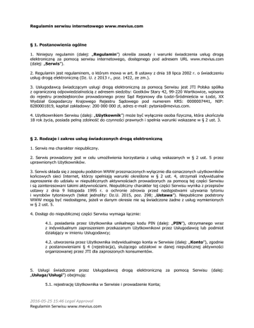 Regulamin serwisu internetowego www.mevius.com § 1. Postanowienia ogólne 1. Niniejszy regulamin (dalej: „Regulamin”) określa zasady i warunki świadczenia usług drogą elektroniczną za pomocą serwisu internetowego, dostępnego pod adresem URL www.mevius.com (dalej: „Serwis”). 2. Regulamin jest regulaminem, o którym mowa w art. 8 ustawy z dnia 18 lipca 2002 r. o świadczeniu usług drogą elektroniczną (Dz. U. z 2013 r., poz. 1422, ze zm.). 3. Usługodawcą świadczącym usługi drogą elektroniczną za pomocą Serwisu jest JTI Polska spółka z ograniczoną odpowiedzialnością z adresem siedziby: Gostków Stary 42, 99-220 Wartkowice, wpisana do rejestru przedsiębiorców prowadzonego przez Sąd Rejonowy dla Łodzi-Śródmieścia w Łodzi, XX Wydział Gospodarczy Krajowego Rejestru Sądowego pod numerem KRS: 0000007441, NIP: 8280001819, kapitał zakładowy: 200 000 000 zł, adres e-mail: [email protected]. 4. Użytkownikiem Serwisu (dalej: „Użytkownik”) może być wyłącznie osoba fizyczna, która ukończyła 18 rok życia, posiada pełną zdolność do czynności prawnych i spełnia warunki wskazane w § 2 ust. 3. § 2. Rodzaje i zakres usług świadczonych drogą elektroniczną 1. Serwis ma charakter niepubliczny. 2. Serwis prowadzony jest w celu umożliwienia korzystania z usług wskazanych w § 2 ust. 5 przez uprawnionych Użytkowników. 3. Serwis składa się z zespołu podstron WWW przeznaczonych wyłącznie dla oznaczonych użytkowników końcowych sieci Internet, którzy spełniają warunki określone w § 2 ust. 4, otrzymali indywidualne zaproszenie do udziału w niepublicznych aktywnościach prowadzonych za pomocą tej części Serwisu i są zainteresowani takimi aktywnościami. Niepubliczny charakter tej części Serwisu wynika z przepisów ustawy z dnia 9 listopada 1995 r. o ochronie zdrowia przed następstwami używania tytoniu i wyrobów tytoniowych (tekst jednolity: Dz.U. 2015, poz. 298; „Ustawa”). Niepubliczne podstrony WWW mogą być niedostępne, jeżeli w danym okresie nie są świadczone żadne z usług wymienionych w § 2 ust. 5. 4. Dostęp do niepublicznej części Serwisu wymaga łącznie: 4.1. posiadania przez Użytkownika unikalnego kodu PIN (dalej: „PIN”), otrzymanego wraz z indywidualnym zaproszeniem przekazanym Użytkownikowi przez Usługodawcę lub podmiot działający w imieniu Usługodawcy; 4.2. utworzenia przez Użytkownika indywidualnego konta w Serwisie (dalej: „Konto”), zgodnie z postanowieniami § 4 (rejestracja), służącego udziałowi w danej niepublicznej aktywności organizowanej przez JTI dla zaproszonych konsumentów. 5. Usługi świadczone przez Usługodawcę drogą elektroniczną za pomocą Serwisu (dalej: „Usługa/Usługi”) obejmują: 5.1. rejestrację Użytkownika w Serwisie i prowadzenie Konta; 2016-05-25 15:46 Legal Approval Regulamin Serwisu www.mevius.com 5.2. umożliwienie Użytkownikom kontaktu z Usługodawcą za pomocą dedykowanego formularza elektronicznego; 5.3. niepubliczne aktywności marketingowe (takie jak np. niepubliczne programy konsumenckie prowadzone w określonym terminie lub konkursy) przeznaczone wyłącznie dla Użytkowników, o których mowa w § 1 ust. 4. § 3. Warunki świadczenia usług drogą elektroniczną 1. Korzystanie z Usług jest nieodpłatne i całkowicie dobrowolne. 2. W celu skorzystania z Usługi, o której mowa w § 2 ust. 5 pkt 5.1, należy skorzystać z formularza wpisując swoje dane osobowe. 3. W ramach korzystania z Serwisu oraz Usług świadczonych za jego pomocą zabronione jest dostarczanie przez Użytkowników treści o charakterze bezprawnym, naruszających prawo lub dobre obyczaje, w tym: 3.1. stanowiących niedozwoloną reklamę lub promocję wyrobów tytoniowych, o której mowa w Ustawie; 3.2. zawierających treści obsceniczne lub wulgarne; 3.3. nawołujących do nienawiści; 3.4. propagujących ideologie narodowego socjalizmu, komunizmu, rasizmu lub kwestionujące obiektywną prawdę historyczną; 3.5. godzących w dobra osobiste Usługodawcy lub osób trzecich; 3.6. naruszających prawa własności intelektualnej lub naruszających prawo do wizerunku osób trzecich; 3.7. promujących, zachęcających lub instruujących w zakresie działań przestępczych; 3.8. spreparowanych w sposób mogący stanowić zagrożenie dla prawidłowego funkcjonowania Serwisu i świadczonych za jego pomocą Usług. 4. Zabronione jest wywoływanie jakichkolwiek zakłóceń technicznych w Serwisie lub w systemie teleinformatycznym Usługodawcy. Zabronione jest ponadto ingerowanie w mechanizmy Serwisu poprzez używanie skryptu, oprogramowania lub mechanizmu, który w bezprawny sposób automatyzuje działania Użytkownika, wpływa na funkcjonowanie Serwisu lub korzystanie z Usług. 5. Zabronione jest korzystanie z Serwisu przez osoby niespełniające warunków określonych w § 1 ust. 4. W przypadku podejrzenia, że Użytkownik nie ukończył 18 roku życia, Usługodawca jest uprawniony do weryfikacji wieku tego Użytkownika. W tym celu Użytkownik może zostać poproszony przez Usługodawcę o okazanie dokumentu tożsamości. W razie negatywnego wyniku weryfikacji wieku Użytkownika lub odmowy okazania dokumentu tożsamości, Usługodawca zablokuje dostęp tego Użytkownika do Serwisu, a w wypadku, gdy ten Użytkownik posiada Konto w Serwisie – Usługodawca zablokuje również dostęp do tego konta. 6. Wszelkie treści i materiały zamieszczone w Serwisie przeznaczone są wyłącznie do użytku prywatnego Użytkowników. Niedozwolone jest korzystanie z treści i materiałów udostępnionych w Serwisie w sposób stanowiący naruszenie obowiązującego prawa, w szczególności Ustawy, jak również ustawy z dnia 4 lutego 1994 r. o prawie autorskim i prawach pokrewnych (tekst jednolity: Dz. U. z 2006 r. Nr 90, poz. 2016-05-25 15:46 Legal Approval Regulamin Serwisu www.mevius.com 631, z późn. zm.) lub ustawy z dnia 30 czerwca 2000 r. – Prawo własności przemysłowej (teks