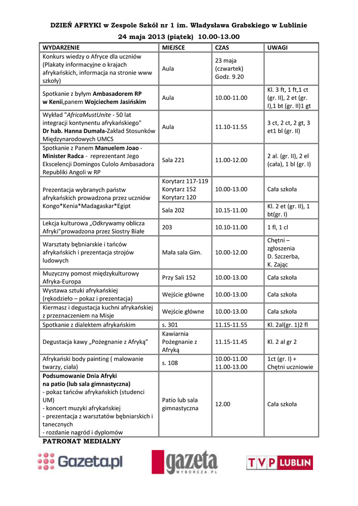 DZIEŃ AFRYKI w Zespole Szkół nr 1 im. Władysława Grabskiego w Lublinie 24 maja 2013 (piątek) 10.00-13.00 WYDARZENIE Konkurs wiedzy o Afryce dla uczniów (Plakaty informacyjne o krajach afrykaoskich, informacja na stronie www szkoły) Spotkanie z byłym Ambasadorem RP w Kenii,panem Wojciechem Jasioskim Wykład "AfricaMustUnite - 50 lat integracji kontynentu afrykaoskiego" Dr hab. Hanna Dumała-Zakład Stosunków Międzynarodowych UMCS Spotkanie z Panem Manuelem Joao Minister Radca - reprezentant Jego Ekscelencji Domingos Culolo Ambasadora Republiki Angoli w RP Prezentacja wybranych paostw afrykaoskich prowadzona przez uczniów Kongo*Kenia*Madagaskar*Egipt Lekcja kulturowa „Odkrywamy oblicza Afryki”prowadzona przez Siostry Białe Warsztaty bębniarskie i taoców afrykaoskich i prezentacja strojów ludowych Muzyczny pomost międzykulturowy Afryka-Europa Wystawa sztuki afrykaoskiej (rękodzieło – pokaz i prezentacja) Kiermasz i degustacja kuchni afrykaoskiej z przeznaczeniem na Misje Spotkanie z dialektem afrykaoskim Degustacja kawy „Pożegnanie z Afryką” Afrykaoski body painting ( malowanie twarzy, ciała) Podsumowanie Dnia Afryki na patio (lub sala gimnastyczna) - pokaz taoców afrykaoskich (studenci UM) - koncert muzyki afrykaoskiej - prezentacja z warsztatów bębniarskich i tanecznych - rozdanie nagród i dyplomów PATRONAT MEDIALNY MIEJSCE CZAS UWAGI Aula 23 maja (czwartek) Godz. 9.20 Aula 10.00-11.00 Kl. 3 ft, 1 ft,1 ct (gr. II), 2 et (gr. I),1 bt (gr. II)1 gt Aula 11.10-11.55 3 ct, 2 ct, 2 gt, 3 et1 bl (gr. II) Sala 221 11.00-12.00 2 al. (gr. II), 2 el (cała), 1 bl (gr. I) Korytarz 117-119 Korytarz 152 Korytarz 120 10.00-13.00 Cała szkoła Sala 202 10.15-11.00 Kl. 2 et (gr. II), 1 bt(gr. I) 203 10.10-11.00 1 fl, 1 cl Mała sala Gim. 10.00-12.00 Chętni – zgłoszenia D. Szczerba, K. Zając Przy Sali 152 10.00-13.00 Cała szkoła Wejście główne 10.00-13.00 Cała szkoła Wejście główne 10.00-13.00 Cała szkoła s. 301 Kawiarnia Pożegnanie z Afryką 11.15-11.55 Kl. 2al(gr. 1)2 fl 11.15-11.45 Kl. 2 al gr 2 s. 108 10.00-11.00 11.00-13.00 1ct (gr. I) + Chętni uczniowie Patio lub sala gimnastyczna 12.00 Cała szkoła