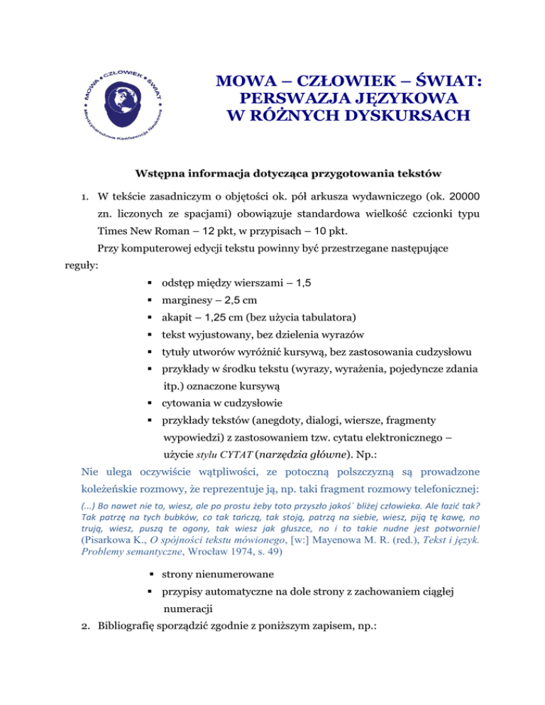 MOWA – CZŁOWIEK – ŚWIAT: PERSWAZJA JĘZYKOWA W RÓŻNYCH DYSKURSACH Wstępna informacja dotycząca przygotowania tekstów 1. W tekście zasadniczym o objętości ok. pół arkusza wydawniczego (ok. 20000 zn. liczonych ze spacjami) obowiązuje standardowa wielkość czcionki typu Times New Roman – 12 pkt, w przypisach – 10 pkt. Przy komputerowej edycji tekstu powinny być przestrzegane następujące reguły: odstęp między wierszami – 1,5 marginesy – 2,5 cm akapit – 1,25 cm (bez użycia tabulatora) tekst wyjustowany, bez dzielenia wyrazów tytuły utworów wyróżnić kursywą, bez zastosowania cudzysłowu przykłady w środku tekstu (wyrazy, wyrażenia, pojedyncze zdania itp.) oznaczone kursywą cytowania w cudzysłowie przykłady tekstów (anegdoty, dialogi, wiersze, fragmenty wypowiedzi) z zastosowaniem tzw. cytatu elektronicznego – użycie stylu CYTAT (narzędzia główne). Np.: Nie ulega oczywiście wątpliwości, ze potoczną polszczyzną są prowadzone koleżeńskie rozmowy, że reprezentuje ją, np. taki fragment rozmowy telefonicznej: (...) Bo nawet nie to, wiesz, ale po prostu żeby toto przyszło jakoś´ bliżej człowieka. Ale łazić tak? Tak patrzę na tych bubków, co tak tańczą, tak stoją, patrzą na siebie, wiesz, piją tę kawę, no trują, wiesz, puszą te ogony, tak wiesz jak głuszce, no i to takie nudne jest potwornie! (Pisarkowa K., O spójności tekstu mówionego, [w:] Mayenowa M. R. (red.), Tekst i język. Problemy semantyczne, Wrocław 1974, s. 49) strony nienumerowane przypisy automatyczne na dole strony z zachowaniem ciągłej numeracji 2. Bibliografię sporządzić zgodnie z poniższym zapisem, np.: * monografie, słowniki: Kiklewicz A., Zrozumieć język. Szkice z filozofii języka, semantyki, lingwistyki komunikacyjnej, Łask 2007. Groys B., Wprowadzenie do anty-filozofii. Przeł. J. Gilewicz, Warszawa 2012. Маслова B., Введение в когнитивную лингвистику, Москва 2006, c. 12. * artykuły w monografiach: Duszak A., Teksty kultury globalnej, [w:] Wojtak M., Rzeszutko M. (red.), W kręgu wiernej mowy, Lublin 2004, s. 59-67. Постовалова B., Картина мира в жизнедеятельности человека, [w:] Б. Серебренников (ред.), Роль человеческого фатора в языке, Москва 1988, с. 8-69. * artykuły w czasopismach, gazetach: Pisarek W., Polskie słowa sztandarowe i ich publiczność: lata dziewięćdziesiąte, „Zeszyty prasoznawcze”, 2000, nr 3-4, s. 19-41. Stalmaszczyk P., Semantyka formalna i pragmatyka: przegląd wybranych definicji, „Biuletyn PTJ”, 2008, LXIV, s. 9-24. Проханов A., Как мыши Лужка хоронили, «Завтра», № 38, 22.09.2010. * zasoby elektroniczne: Woźniak O., Bio-art, czyli nauka i sztuka w jednym, „Polityka”, 05.06.2012, http://www.polityka.pl/kultura/aktualnoscikulturalne/1527543,1,bioart-czyli-nauka-i-sztukaw-jednym.read [dostęp: 20.09.1012]. Ефремова T. (ред.), Современный толковый словарь русского языка, Москва 2000, <http://dic.academic.ru/dic.nsf/efremova/153359/Гарант> [доступ: 17.09.1012]. * W przypisach nazwisko autora zapisujemy po inicjałach imienia: A.Kiklewicz , Zrozumieć język… (dalej – jak w bibliografii) * odsyłacze do tego samego źródła w przypisach zapisujemy następująco: - w tekstach polskojęzycznych: 2 Ibidem, s. 27. - w tekstach rosyjskojęzycznych: 2 Там же, с. 27. 3. Afiliację i tytuł referatu zapisać wg wzoru: - Imię i nazwisko – Times New Roman 12 pkt, czcionka pogrubiona, umieszczone z lewej strony arkusza - Ośrodek akademicki, Miejscowość – Times New Roman 10 pkt, czcionka pogrubiona - TYTUŁ REFERATU – Times New Roman 12 pkt, czcionka pogrubiona, wielkie litery, umieszczony pośrodku arkusza 4. Przed tekstem umieszczamy - Times New Roman 11 pkt: Tytuł w języku angielskim Słowa kluczowe w języku angielskim Streszczenie w języku angielskim (do 150 wyrazów)