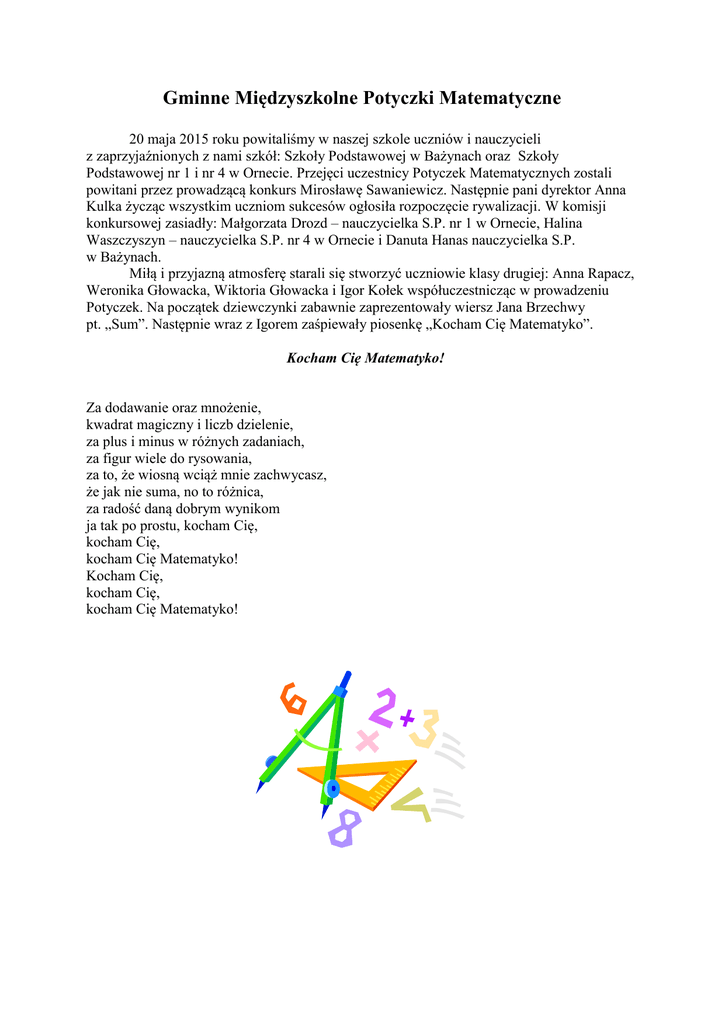 Gminne Międzyszkolne Potyczki Matematyczne 20 maja 2015 roku powitaliśmy w naszej szkole uczniów i nauczycieli z zaprzyjaźnionych z nami szkół: Szkoły Podstawowej w Bażynach oraz Szkoły Podstawowej nr 1 i nr 4 w Ornecie. Przejęci uczestnicy Potyczek Matematycznych zostali powitani przez prowadzącą konkurs Mirosławę Sawaniewicz. Następnie pani dyrektor Anna Kulka życząc wszystkim uczniom sukcesów ogłosiła rozpoczęcie rywalizacji. W komisji konkursowej zasiadły: Małgorzata Drozd – nauczycielka S.P. nr 1 w Ornecie, Halina Waszczyszyn – nauczycielka S.P. nr 4 w Ornecie i Danuta Hanas nauczycielka S.P. w Bażynach. Miłą i przyjazną atmosferę starali się stworzyć uczniowie klasy drugiej: Anna Rapacz, Weronika Głowacka, Wiktoria Głowacka i Igor Kołek współuczestnicząc w prowadzeniu Potyczek. Na początek dziewczynki zabawnie zaprezentowały wiersz Jana Brzechwy pt. „Sum”. Następnie wraz z Igorem zaśpiewały piosenkę „Kocham Cię Matematyko”. Kocham Cię Matematyko! Za dodawanie oraz mnożenie, kwadrat magiczny i liczb dzielenie, za plus i minus w różnych zadaniach, za figur wiele do rysowania, za to, że wiosną wciąż mnie zachwycasz, że jak nie suma, no to różnica, za radość daną dobrym wynikom ja tak po prostu, kocham Cię, kocham Cię, kocham Cię Matematyko! Kocham Cię, kocham Cię, kocham Cię Matematyko! Zmagania konkursowe rozpoczęły się od sprawdzenia, czy uczniowie sprawnie liczą. Zaprosiła ich do tego zadania Ania Rapacz recytując krótką rymowankę: Sprawne liczenie Chcemy sprawdzić moi mili, czyście pilnie się uczyli, a więc liczcie dobrze, żwawo, my będziemy bili brawo. Zadania konkursowe prezentowane były również w formie slajdów na tablicy multimedialnej, a prowadząca nauczycielka wyjaśniała uczniom polecenia, dzięki czemu uczestnicy pracowali sprawnie i prawie bezstresowo. Do drugiego etapu zaprosił kolegów Igor Kołek odczytując rymowankę, która zawierała wskazówki pomocne w uzyskaniu maksymalnego wyniku. Zadania tekstowe Czytaj, pomyśl i narysuj, potem zapisz obliczenia, nie zapomnij odpowiedzi, bo to wynik pracy zmienia. Rozpoczęcie etapu trzeciego ogłosiła Wiktoria Glowacka recytując rymowankę mówiącą o czynnościach, które będą musieli wykonać uczniowie. Geometria Masz linijkę i ołówek, więc zmierz wszystko bez pomyłek, potem oblicz co potrzeba, punkt zdobędziesz za wysiłek. Po każdym etapie komisja ogłaszała wyniki. W połowie zmagań wszystkie drużyny miały taką samą ilość punktów. Była nadzieja na remis. Wtedy Ania Rapacz zaprosiła uczestników do dalszej pracy recytując wierszyk. Etap IV Pojęcia matematyczne Spójrz uważnie na krzyżówkę i przez chwilkę wytęż główkę. Jeśli znasz język matematyki, możesz liczyć na dobre wyniki. To zadanie uczniowie rozwiązywali drużynowo i niestety sprawiło ono niektórym trochę kłopotu. Etap piąty dawał możliwość odrobienia straconych punktów. Zaprosił do niego uczniów Igor Kołek recytując rymowankę. Wiadomości praktyczne Uważnie odczytaj czasy na zegarach, zapisać poprawnie potem się postaraj, a gdy pierwszak zdanie ułoży z wyrazów, to kolejne punkty otrzymasz od razu. Uczestnicy sprawnie rozwiązali zadania, komisja ogłosiła wyniki i do ostatniego , decydującego etapu zaprosiła dzieci Wiktoria Głowacka. Zadania Sowy Sowa w swych papierach chowa trudnych zadań mnóstwo całe, lecz gdy ruszy mądra głowa, to efekty są wspaniałe. Wszystko dobrze rozwiążecie, wiele punktów dostaniecie. Zadania mądrej Sowy wymagały od uczestników dużego wysiłku. Czekając na ostateczne wyniki z chęcią pokrzepili się rogalikami i wypili sok owocowy wymieniając się wrażeniami. Komisja konkursowa po podliczeniu wszystkich punktów ogłosiła ostateczne wyniki: I miejsce z ilością 112 punktów zdobyli gospodarze, czyli uczniowie naszej szkoły, II miejsce z ilością 110 punktów zdobyły równorzędnie S.P. nr 1 w Ornecie i S. P. w Bażynach, III miejsce przypadło S.P. nr 4 w Ornecie, która uzyskała 109 punktów. Pani dyrektor Anna Kulka pogratulowała wszystkim uczestnikom zmagań wręczając dyplomy i statuetki dla szkół, a także podziękowała nauczycielkom pracującym w komisji konkursowej. Uczniowie ponadto otrzymali indywidualnie dyplomy i nagrody w postaci gry planszowej, która w formie zabawowej utrwala znajomość tabliczki mnożenia. Potyczki matematyczne zakończyło uzupełnienie przez uczestników ankiety ewaluacyjnej. Największą satysfakcję sprawił organizatorom fakt, że wszyscy uczestnicy wyrazili chęć ponownego udziału w zmaganiach konkursowych.