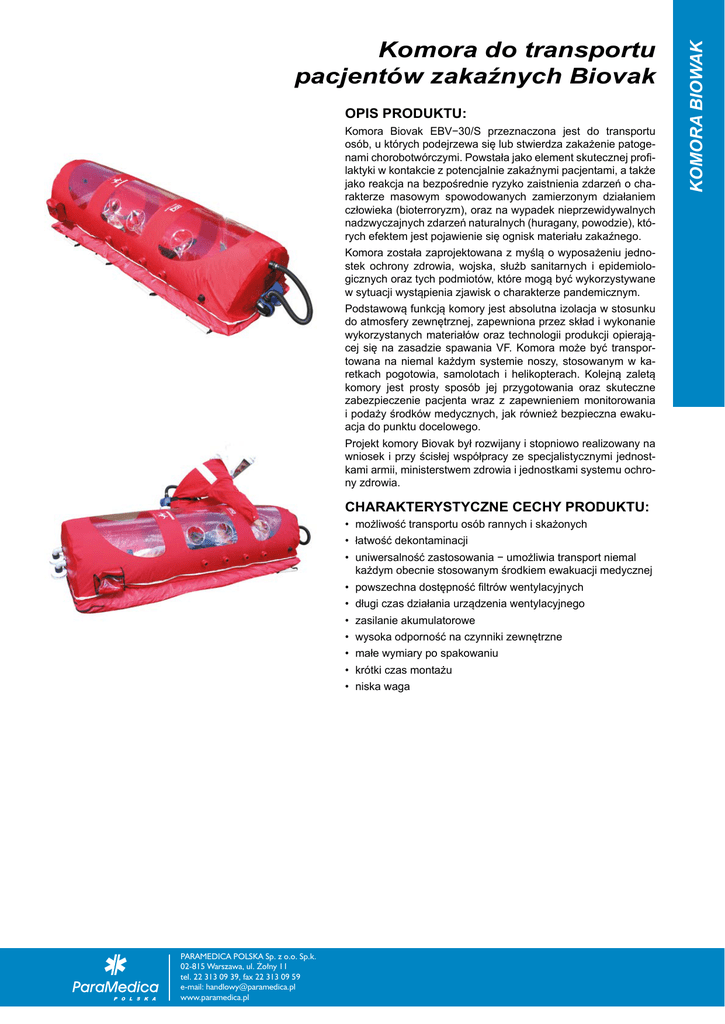 OPIS PRODUKTU: Komora Biovak EBV−30/S przeznaczona jest do transportu osób, u których podejrzewa się lub stwierdza zakażenie patogenami chorobotwórczymi. Powstała jako element skutecznej profilaktyki w kontakcie z potencjalnie zakaźnymi pacjentami, a także jako reakcja na bezpośrednie ryzyko zaistnienia zdarzeń o charakterze masowym spowodowanych zamierzonym działaniem człowieka (bioterroryzm), oraz na wypadek nieprzewidywalnych nadzwyczajnych zdarzeń naturalnych (huragany, powodzie), których efektem jest pojawienie się ognisk materiału zakaźnego. Komora została zaprojektowana z myślą o wyposażeniu jednostek ochrony zdrowia, wojska, służb sanitarnych i epidemiologicznych oraz tych podmiotów, które mogą być wykorzystywane w sytuacji wystąpienia zjawisk o charakterze pandemicznym. Podstawową funkcją komory jest absolutna izolacja w stosunku do atmosfery zewnętrznej, zapewniona przez skład i wykonanie wykorzystanych materiałów oraz technologii produkcji opierającej się na zasadzie spawania VF. Komora może być transportowana na niemal każdym systemie noszy, stosowanym w karetkach pogotowia, samolotach i helikopterach. Kolejną zaletą komory jest prosty sposób jej przygotowania oraz skuteczne zabezpieczenie pacjenta wraz z zapewnieniem monitorowania i podaży środków medycznych, jak również bezpieczna ewakuacja do punktu docelowego. Projekt komory Biovak był rozwijany i stopniowo realizowany na wniosek i przy ścisłej współpracy ze specjalistycznymi jednostkami armii, ministerstwem zdrowia i jednostkami systemu ochrony zdrowia. CHARAKTERYSTYCZNE CECHY PRODUKTU: • możliwość transportu osób rannych i skażonych • łatwość dekontaminacji • uniwersalność zastosowania − umożliwia transport niemal każdym obecnie stosowanym środkiem ewakuacji medycznej • powszechna dostępność filtrów wentylacyjnych • długi czas działania urządzenia wentylacyjnego • zasilanie akumulatorowe • wysoka odporność na czynniki zewnętrzne • małe wymiary po spakowaniu • krótki czas montażu • niska waga PARAMEDICA POLSKA Sp. z o.o. Sp.k. 02-815 Warszawa, ul. Żołny 11 tel. 22 313 09 39, fax 22 313 09 59 e-mail: [email protected] www.paramedica.pl KOMORA BIOWAK Komora do transportu pacjentów zakaźnych Biovak • komora izolująca • materac podciśnieniowy z pompką • urządzenie wentylujące z zasilaczem • 4 filtry HEPA • torba transportowa • zestaw naprawczy URZĄDZENIA KOMPATYBILNE: • wszystkie znane typy noszy głównych w karetkach pogotowia • Indywidualny Pakiet Ochrony Biologicznej • Izolator szpitalny BioBox NORMY, CERTYFIKATY: • Komora BIOVAK EBV-30: zgodność ze standardami NATO i STANAG 4155 • Jednostka filtrująco-wentylacyjna oraz filtry: zgodność z EN 141 • Gwinty filtrów RD 40 x 1,7”: zgodność z EN 148−1 • Numer NATO: NSN 6530160041605 • Numer AER [Armii RCz]: KEM 0160338397020 PARAMETRY TECHNICZNE: • masa worka próżniowego: 5,5 kg • masa worka ochronnego z jednostką filtrująco-wentylującą: 8,5 kg • masa kompletnego zestawu w torbie do transportu: 16,5 kg • wymiary w stanie rozłożonym: 212 x 62 x 43 cm (dł. szer. wys.) • wymiary w stanie złożonym (w torbie do transportu): 68 x 70 x 41 cm (dł. x wys. x szer.) • materiał, z którego wykonano materac próżniowy: tkanina z naniesionym poliwinylochlorkiem 460 g/m2 • materiał, z którego wykonano worek ochronny: folia z PU, materiał tekstylny z naniesionym PU • materiał, z którego wykonano rękawice: materiał tekstylny z naniesionym lateksem • materiał, z którego wykonano hermetyczny zamek błyskawiczny: pasek PES z naniesionym PCV z obustronnymi ząbkami • spawy: technologia spawania VF • kolor: czerwony • długość suwaka: 3,25 m • ochrona: przestrzeń całkowicie hermetyczna • jednostka filtrująco-wentylacyjna: PROFLOW 2/120 • przepływ powietrza: 120 dm3/min. • baterie: NiMH 9,6 V; 3,5 Ah • czas pracy: cca 8 – 12 godzin • czas ładowania: 8 – 10 godzin • masa: 1440 g bez filtrów • temperatura pracy: −10 do +30 °C W związku z ciągłym udoskonalaniem wyrobów, przedstawione w niniejszym materiale informacje oraz dane techniczne mają wyłącznie charakter orientacyjny i mogą ulec zmianie bez uprzedzenia. W celu zweryfikowania aktualności niniejszego materiału należy skontaktować się z przedstawicielem firmy Paramedica Polska Sp. z o.o. Sp.k. 02-815 Warszawa; ul. Żołny 11; tel: +48 22 313 09 39; www.paramedica.pl Powyższe zdjęcia, znaki firmowe oraz teksty należą do ich właścicieli. Zabrania się kopiowania i publikowania zdjęć i tekstów w całości i/lub części w internecie, prasie, mediach bez zgody na piśmie właścicieli. PARAMEDICA POLSKA Sp. z o.o. Sp.k. 02-815 Warszawa, ul. Żołny 11 tel. 22 313 09 39, fax 22 313 09 59 e-mail: [email protected] www.paramedica.pl BIOVAK: 0613WER.01 KOMORA BIOWAK WYPOSAŻENIE STANDARDOWE: