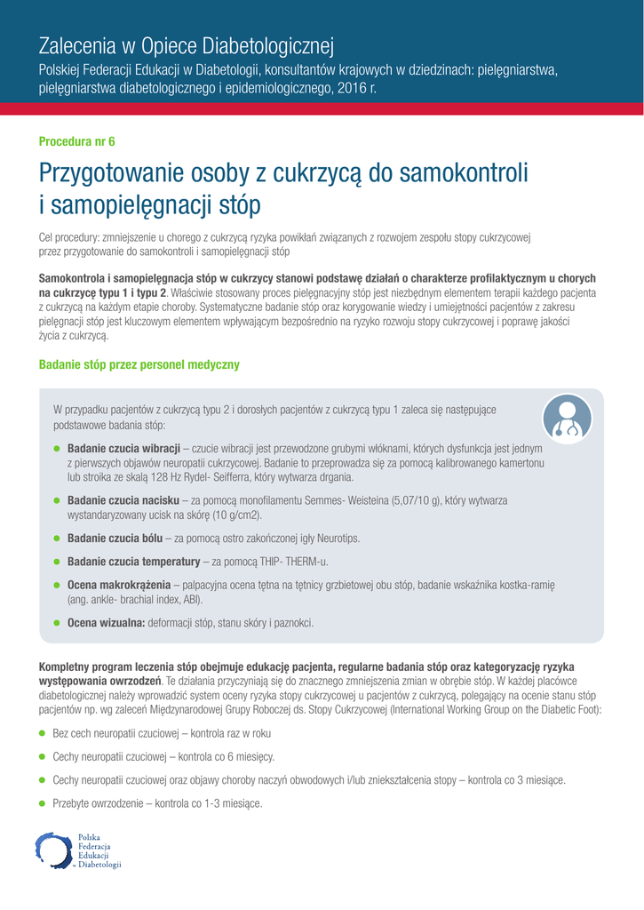 Zalecenia w Opiece Diabetologicznej Polskiej Federacji Edukacji w Diabetologii, konsultantów krajowych w dziedzinach: pielęgniarstwa, pielęgniarstwa diabetologicznego i epidemiologicznego, 2016 r. Procedura nr 6 Przygotowanie osoby z cukrzycą do samokontroli i samopielęgnacji stóp Cel procedury: zmniejszenie u chorego z cukrzycą ryzyka powikłań związanych z rozwojem zespołu stopy cukrzycowej przez przygotowanie do samokontroli i samopielęgnacji stóp Samokontrola i samopielęgnacja stóp w cukrzycy stanowi podstawę działań o charakterze profilaktycznym u chorych na cukrzycę typu 1 i typu 2. Właściwie stosowany proces pielęgnacyjny stóp jest niezbędnym elementem terapii każdego pacjenta z cukrzycą na każdym etapie choroby. Systematyczne badanie stóp oraz korygowanie wiedzy i umiejętności pacjentów z zakresu pielęgnacji stóp jest kluczowym elementem wpływającym bezpośrednio na ryzyko rozwoju stopy cukrzycowej i poprawę jakości życia z cukrzycą. Badanie stóp przez personel medyczny W przypadku pacjentów z cukrzycą typu 2 i dorosłych pacjentów z cukrzycą typu 1 zaleca się następujące podstawowe badania stóp: B adanie czucia wibracji – czucie wibracji jest przewodzone grubymi włóknami, których dysfunkcja jest jednym z pierwszych objawów neuropatii cukrzycowej. Badanie to przeprowadza się za pomocą kalibrowanego kamertonu lub stroika ze skalą 128 Hz Rydel- Seifferra, który wytwarza drgania. Badanie czucia nacisku – za pomocą monofilamentu Semmes- Weisteina (5,07/10 g), który wytwarza wystandaryzowany ucisk na skórę (10 g/cm2). Badanie czucia bólu – za pomocą ostro zakończonej igły Neurotips. Badanie czucia temperatury – za pomocą THIP- THERM-u. O cena makrokrążenia – palpacyjna ocena tętna na tętnicy grzbietowej obu stóp, badanie wskaźnika kostka-ramię (ang. ankle- brachial index, ABI). Ocena wizualna: deformacji stóp, stanu skóry i paznokci. Kompletny program leczenia stóp obejmuje edukację pacjenta, regularne badania stóp oraz kategoryzację ryzyka występowania owrzodzeń. Te działania przyczyniają się do znacznego zmniejszenia zmian w obrębie stóp. W każdej placówce diabetologicznej należy wprowadzić system oceny ryzyka stopy cukrzycowej u pacjentów z cukrzycą, polegający na ocenie stanu stóp pacjentów np. wg zaleceń Międzynarodowej Grupy Roboczej ds. Stopy Cukrzycowej (International Working Group on the Diabetic Foot): Bez cech neuropatii czuciowej – kontrola raz w roku Cechy neuropatii czuciowej – kontrola co 6 miesięcy. Cechy neuropatii czuciowej oraz objawy choroby naczyń obwodowych i/lub zniekształcenia stopy – kontrola co 3 miesiące. Przebyte owrzodzenie – kontrola co 1-3 miesiące. Zalecenia w Opiece Diabetologicznej Polskiej Federacji Edukacji w Diabetologii, konsultantów krajowych w dziedzinach: pielęgniarstwa, pielęgniarstwa diabetologicznego i epidemiologicznego, 2016 r. Edukacja z zakresu prewencji stopy cukrzycowej Celem edukacji jest zmiana zachowań zdrowotnych pacjentów oraz motywacja do przestrzegania zaleceń pielęgniarskich i lekarskich. Podstawą edukacji jest ustalenie indywidualnych celów w pielęgnowaniu stóp na podstawie czynników ryzyka rozwoju zespołu stopy cukrzycowej; do czynników tych należą: niewłaściwa higiena stóp, niewłaściwe obuwie, obecność modzeli i zniekształcenia stóp. Zakres edukacji pacjenta obejmuje: W przypadku pacjentów z cukrzycą typu 2 i dorosłych pacjentów z cukrzycą typu 1 zaleca się przeprowadzenie edukacji, która obejmuje: Codzienną higienę stóp: zaleca się zastosowanie specjalistycznych preparatów do codziennej pielęgnacji stóp, do których należą m. in.: łagodne środki myjące o pH 5,5, preparaty pielęgnacyjne do skóry i paznokci stóp o różnej zawartości mocznika i tłuszczów neutralnych dla skóry w zależności od problemu pielęgnacyjnego, ponadto temperatura wody nie może przekraczać 37o C, kąpiel stóp powinna być krótka i trwać 2-3 minuty, po czym należy bardzo dobrze osuszyć skórę stóp oraz przestrzenie międzypalcowe. Pielęgnację hiperkeratozy i modzeli stóp: nie zaleca się samodzielnego usuwania wszelkich zrogowaceń na stopach zarówno manualnie lub za pomocą środków chemicznych z zawartością m. in. kwasu salicylowego, w przypadku trudności z samopielęgnacją stóp zaleca się regularne korzystanie z usług specjalisty pielęgnacji stóp. Profilaktykę przeciwgrzybiczą stóp: należy do niej przede wszystkim przestrzeganie ogólnych zasad podstawowej higieny stóp oraz dokładne osuszanie stóp i przestrzeni międzypalcowych po każdym myciu i kąpieli stóp, niepozostawianie preparatów pielęgnacyjnych do skóry stóp w przestrzeniach międzypalcowych, należy zwrócić szczególną uwagę, aby w tych miejscach skóra zawsze była czysta i sucha, stosowaniu obuwia ochronnego na basenach, saunach, salach fizjoterapii i w innych miejscach wymagających ochrony gołej skóry stóp przed kontaktem z potencjalnym zagrożeniem chorobotwórczą florą grzybiczą, zastosowaniu obuwia, obuwia domowego oraz skarpet wyłącznie z materiałów naturalnych zapewniających właściwą wentylację skóry stóp i ochronę przed jej przegrzaniem, w razie potrzeby wynikającej z wcześniejszych incydentów zakażeń grzybiczych stóp i paznokci zaleca się zastosowanie wszelkich preparatów pielęgnacyjnych do stóp z zawartością substancji przeciwgrzybiczych. Zasady doboru obuwia terapeutycznego: zaleca się zastosowanie obuwia przeznaczonego dla osób z cukrzycą oraz skarpet bezuciskowych, bezszwowych z włókien naturalnych – bawełny lub bambusa. Zasady aseptycznego zaopatrzenia mikrourazów oraz małych uszkodzeń skóry w obrębie stóp: zaleca się posiadanie apteczki, zawierającej środek antyseptyczny, jałowe gaziki, w przypadku nawracających owrzodzeń – specjalistyczne opatrunki antybakteryjne, bandaż, plaster, w przypadku owrzodzeń w przebieg