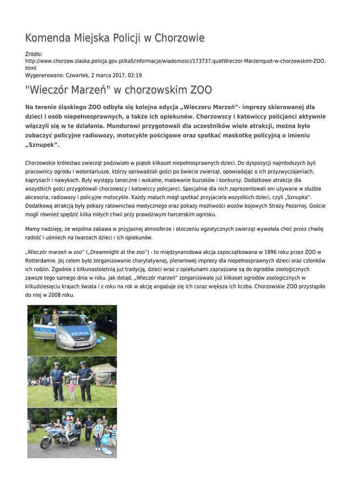 Komenda Miejska Policji w Chorzowie Źródło: http://www.chorzow.slaska.policja.gov.pl/ka5/informacje/wiadomosci/173737,quotWieczor-Marzenquot-w-chorzowskim-ZOO. html Wygenerowano: Czwartek, 2 marca 2017, 02:19 "Wieczór Marzeń" w chorzowskim ZOO Na terenie śląskiego ZOO odbyła się kolejna edycja „Wieczoru Marzeń”- imprezy skierowanej dla dzieci i osób niepełnosprawnych, a także ich opiekunów. Chorzowscy i katowiccy policjanci aktywnie włączyli się w te działania. Mundurowi przygotowali dla uczestników wiele atrakcji, można było zobaczyć policyjne radiowozy, motocykle pościgowe oraz spotkać maskotkę policyjną o imieniu „Sznupek”. Chorzowskie królestwo zwierząt podziwiało w piątek kilkaset niepełnosprawnych dzieci. Do dyspozycji najmłodszych byli pracownicy ogrodu i wolontariusze, którzy oprowadzali gości po świecie zwierząt, opowiadając o ich przyzwyczajeniach, kaprysach i nawykach. Były występy taneczne i wokalne, malowanie buziaków i konkursy. Dodatkowe atrakcje dla wszystkich gości przygotowali chorzowscy i katowiccy policjanci. Specjalnie dla nich zaprezentowali oni używane w służbie akcesoria, radiowozy i policyjne motocykle. Każdy maluch mógł spotkać przyjaciela wszystkich dzieci, czyli „Sznupka”. Dodatkową atrakcją były pokazy ratownictwa medycznego oraz pokazy możliwości wozów bojowych Straży Pożarnej. Goście mogli również spędzić kilka miłych chwil przy prawdziwym harcerskim ognisku. Mamy nadzieję, że wspólna zabawa w przyjaznej atmosferze i otoczeniu egzotycznych zwierząt wywołała choć przez chwilę radość i uśmiech na twarzach dzieci i ich opiekunów. „Wieczór marzeń w zoo” („Dreamnight at the zoo”) - to międzynarodowa akcja zapoczątkowana w 1996 roku przez ZOO w Rotterdamie. Jej celem było zorganizowanie charytatywnej, plenerowej imprezy dla niepełnosprawnych dzieci oraz członków ich rodzin. Zgodnie z kilkunastoletnią już tradycją, dzieci wraz z opiekunami zapraszane są do ogrodów zoologicznych zawsze tego samego dnia w roku. Jak dotąd, „Wieczór marzeń” zorganizowało już kilkaset ogrodów zoologicznych w kilkudziesięciu krajach świata i z roku na rok w akcję angażuje się ich coraz większa ich liczba. Chorzowskie ZOO przystąpiło do niej w 2008 roku. Ocena: 0/5 (0) Tweetnij