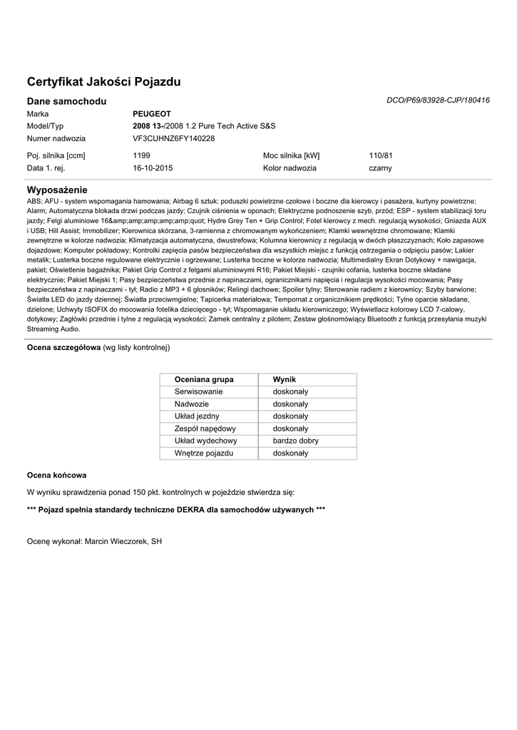 Certyfikat Jakości Pojazdu DCO/P69/83928-CJP/180416 Dane samochodu Marka PEUGEOT Model/Typ 2008 13-/2008 1.2 Pure Tech Active S&S Numer nadwozia VF3CUHNZ6FY140228 Poj. silnika [ccm] 1199 Moc silnika [kW] 110/81 Data 1. rej. 16-10-2015 Kolor nadwozia czarny Wyposażenie ABS; AFU - system wspomagania hamowania; Airbag 6 sztuk: poduszki powietrzne czołowe i boczne dla kierowcy i pasażera, kurtyny powietrzne; Alarm; Automatyczna blokada drzwi podczas jazdy; Czujnik ciśnienia w oponach; Elektryczne podnoszenie szyb, przód; ESP - system stabilizacji toru jazdy; Felgi aluminiowe 16" Hydre Grey Ten + Grip Control; Fotel kierowcy z mech. regulacją wysokości; Gniazda AUX i USB; Hill Assist; Immobilizer; Kierownica skórzana, 3-ramienna z chromowanym wykończeniem; Klamki wewnętrzne chromowane; Klamki zewnętrzne w kolorze nadwozia; Klimatyzacja automatyczna, dwustrefowa; Kolumna kierownicy z regulacją w dwóch płaszczyznach; Koło zapasowe dojazdowe; Komputer pokładowy; Kontrolki zapięcia pasów bezpieczeństwa dla wszystkich miejsc z funkcją ostrzegania o odpięciu pasów; Lakier metalik; Lusterka boczne regulowane elektrycznie i ogrzewane; Lusterka boczne w kolorze nadwozia; Multimedialny Ekran Dotykowy + nawigacja, pakiet; Oświetlenie bagażnika; Pakiet Grip Control z felgami aluminiowymi R16; Pakiet Miejski - czujniki cofania, lusterka boczne składane elektrycznie; Pakiet Miejski 1; Pasy bezpieczeństwa przednie z napinaczami, ogranicznikami napięcia i regulacja wysokości mocowania; Pasy bezpieczeństwa z napinaczami - tył; Radio z MP3 + 6 głosników; Relingi dachowe; Spoiler tylny; Sterowanie radiem z kierownicy; Szyby barwione; Światła LED do jazdy dziennej; Światła przeciwmgielne; Tapicerka materiałowa; Tempomat z organicznikiem prędkości; Tylne oparcie składane, dzielone; Uchwyty ISOFIX do mocowania fotelika dziecięcego - tył; Wspomaganie układu kierowniczego; Wyświetlacz kolorowy LCD 7-calowy, dotykowy; Zagłówki przednie i tylne z regulacją wysokości; Zamek centralny z pilotem; Zestaw głośnomówiący Bluetooth z funkcją przesyłania muzyki Streaming Audio. Ocena szczegółowa (wg listy kontrolnej) Oceniana grupa Wynik Serwisowanie doskonały Nadwozie doskonały Układ jezdny doskonały Zespół napędowy doskonały Układ wydechowy bardzo dobry Wnętrze pojazdu doskonały Ocena końcowa W wyniku sprawdzenia ponad 150 pkt. kontrolnych w pojeździe stwierdza się: *** Pojazd spełnia standardy techniczne DEKRA dla samochodów używanych *** Ocenę wykonał: Marcin Wieczorek, SH